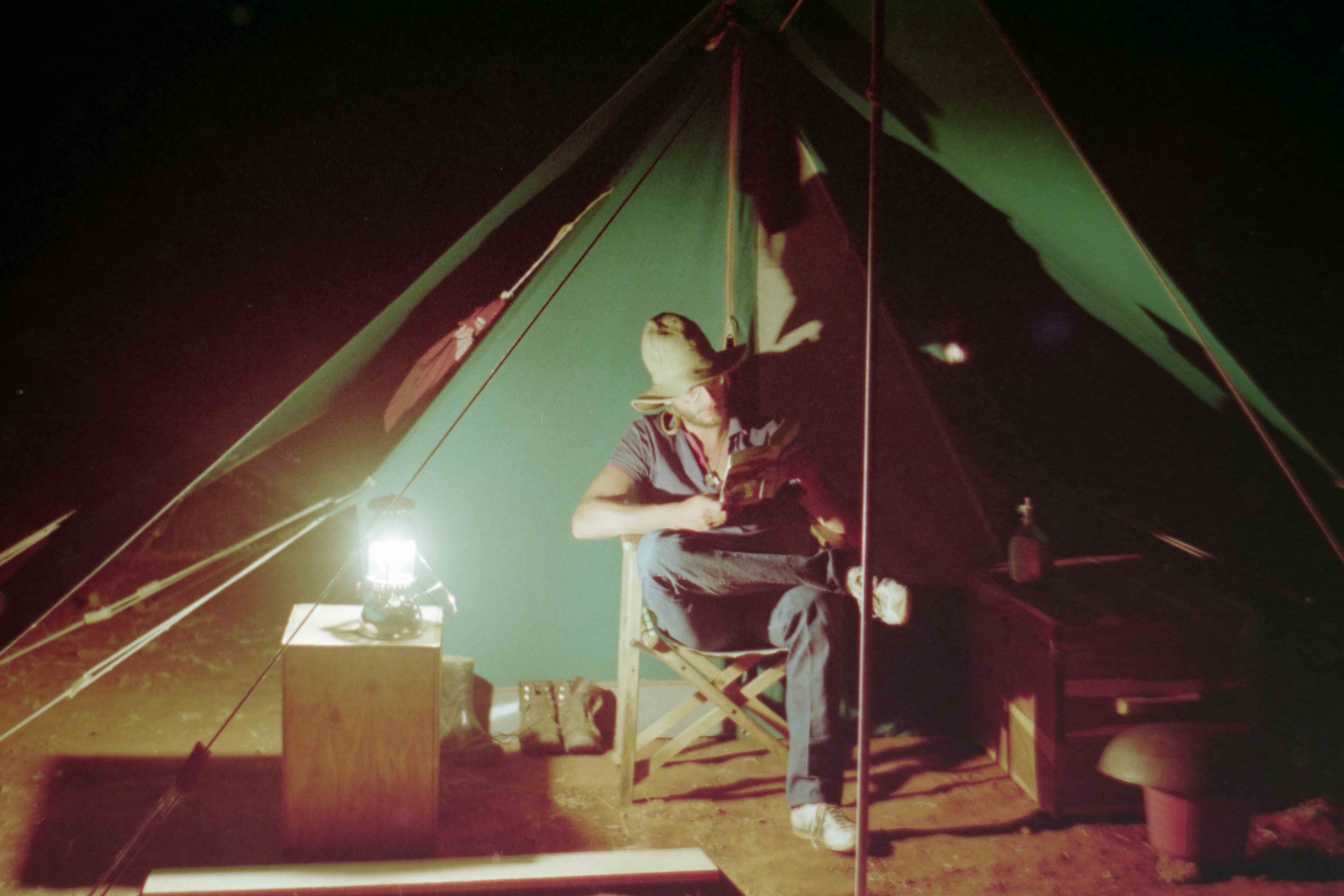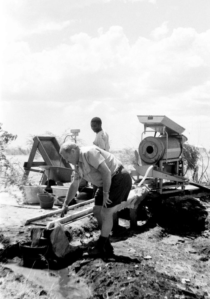 Er staan hier ongeveer 25 tenten (Iedereen heeft hier een eigen tent), 1 keuken, 1 werkplaats, 4 houten barakken (1 lab, 1 landmeet office, 1 klaslokaal annex geologen office, en 1 woonhuis voor de camp manager en zijn gezin). Op het ogenblik zijn we met 7 banken: 1 beroeps geoloog, een manager van een ingenieursbureau (DHV), en 5 mensen van de TH waarvan 2 studenten. Elke dag komen er ongeveer 100 arbeiders, soms van wel 20 km ver lopend naar het werk. Er wordt van 8 – 15:00 gewerkt en zaterdag van 8 – 13:00 uur. Er zijn geen lunchpauzes. Het gevolg is dat aan het eind van de dag de mensen zo hongerig zijn dat ze haast niet meer kunnen werken. Het water wordt uit een put in een droge rivier naar boven gepompt. Hopelijk is er water tot het einde van het project. We zitten nl. In het droge seizoen en elke dag zakt het waterpeil in de put. Het eten is hier uitstekend. Beter dan in de `Mens en ik eet er elke dag dan ook ontzettend veel van. Veel van het eten komt uit leger pakketten. Zodoende hebben we ook Douwe Egberts koffie (oplos), maar door mijn initiatief zijn we op Tanzaniaanse oploskoffie overgegaan die men hier ook lekkerder vindt.