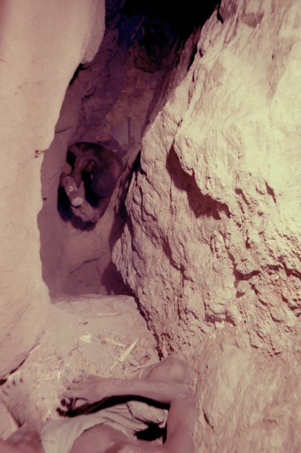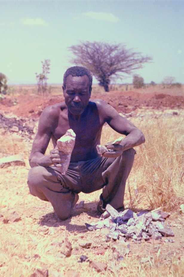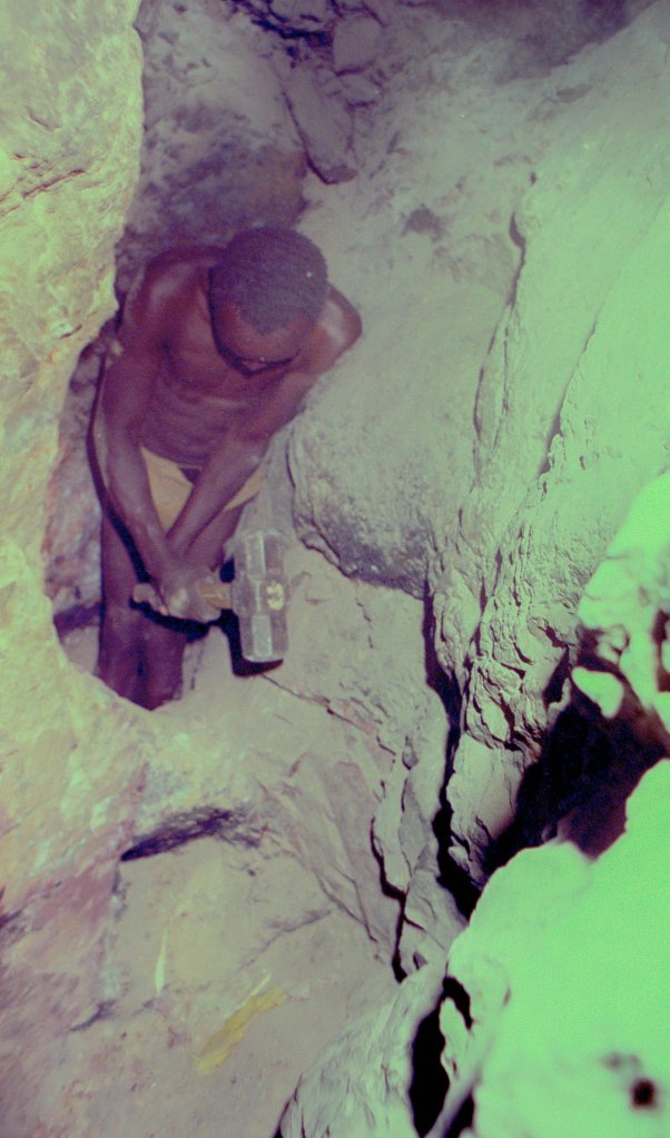 Op Zondag 20/8 wat arbeiders uit Mogongo gehaald en de vrachtwagen in “No Time” geladen. Om 11 uur vertrok dan eindelijk de eerste vracht. Tussen 12 en een dan eindelijk de illegale mijnwerkers aan het werk getroffen. Eentje zat onder in het gat met een beitel op de harde stenen te meppen. De stenen waren nog heet van het vuur. Meestal werken ze ’s nachts ivm de trench mensen. Ze steken de ene nacht een vuur aan, laten die 2 dagen afkoelen en proberen dan de stenen eruit te halen. Het zal wel lonend zijn. Er werken op dit moment zo’n 8 man. We mochten overal foto’s van maken.