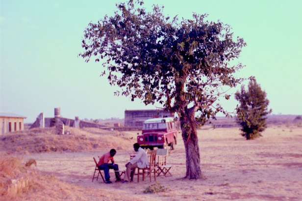 We werken nog maar met 3 arbeiders die kisten voor allerlei zaken timmeren. Elke ochtend komen eerst nog alle vorige arbeiders on te zien of er geen werk is. Helaas is er meestal geen vrachtwagen dus ook geen werk. Boudewijn en ik houden ons zoet met het bij elkaar zoeken van spullen en dezer in de kisten stoppen. Eigenlijk is er niet zo veel te doen. Boudewijn kan daar niet zo best tegen en zoekt dan echt naar iets om te doen. ’s Avonds amuseren we ons met allerlei verheven gesprekken rond de koffie van half acht tot 9 uur. Daarna is het typen geblazen voor mij. Packlijsten. De typesnelheid is redelijk maar mijn kennis van de schrijfwijze van de Engelse woorden is 0,0. Telkens moet B. Ze spellen en vaak spelt hij dan ook de meest eenvoudige woorden wat me dan irriteert en in de war brengt. Ik heb soms moeite om me te beheersen. Tussen 10 en 11 wordt er dan meestal een borrel gedronken. Eerst was dat berenburg. Later, toen deze op was, Konyagi. Tussen 11 en 12 is het dan bedtijd.