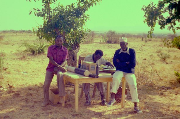 Vak verlang ik wel naar mijn bed. Niet direct om te slapen maar meer om te vluchten aan het met B. zijn. We kunnen erg goed met elkaar opschieten maar ik geloof dat 24 uur per dag gewoon te veel is. Daarvoor zijn onze karakters te verschillend. Hij is ontzettend precies en leeft erg volgens de klok. Ik krijg de indruk dat hij zich nooit eens kan laten gaan. Om 10 uur is er koffie. 1 uur en 6 uur eten. Dit ritme mag niet de mist in gaan. Hij is ook kwaad op allerlei kleine dingen, maar gelukkig gaat dat ook gauw weer over en is het meer een uitlaat klep. Bij het typen moet ik me bedwingen om niet oeverloze discussies aan te gaan over wat er opgeschreven moet worden. Meestal vind ik alles wel goed. Waarom ouwehoeren, doorwerken, afmaken.Op dinsdag 22/8 rond 4 uur kwam eindelijk onze Isuzu met Burton aan zetten. We waren blij hem te zien en hij ook om ons ze zien. Mori werd er op uitgestuurd om wat arbeiders te halen en rond 6 uur was de wagen al beladen. Het afrekenen van de 2000 shilling met Knopie ging eigenlijk veel te snel. Eerst zei hij dat hij niet overal bonnetjes van had en later bleek alles te kloppen. Bij het nareken bleek de wagen veel te veel Diesel te verbruiken. 1 liter op 1,3 tot 1,5 km. Het vermoeden ontstond dat hij te veel diesel op de bon heeft laten schrijven en het geld zelf gehouden. Dit vermoeden werd bevestigd toen de volgende dag de tank van de Isuzu werd bijgevuld en hij maar 1op 3,5 bleek te hebben gereden op het laatste stuk. Meneer heeft minstens 200 l diesel = 500 shilling in zijn zak gestoken. Burton zei dat de Leyland een half uur na hem zou vertrekken. Hij is helaas niet meer die avond aangekomen