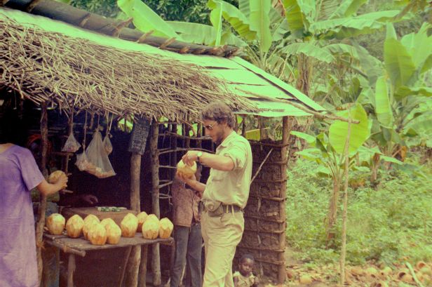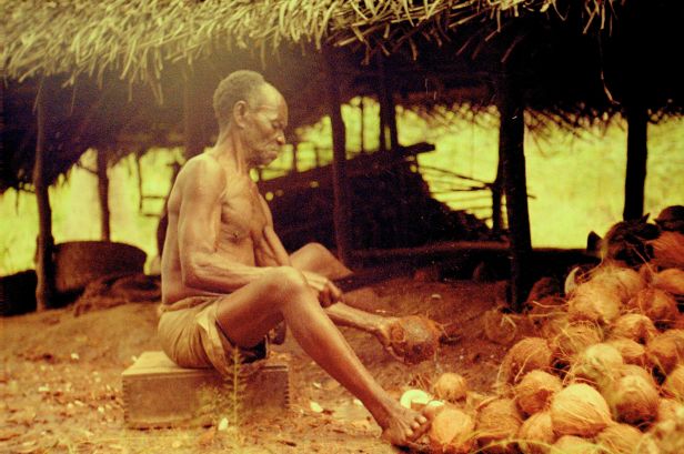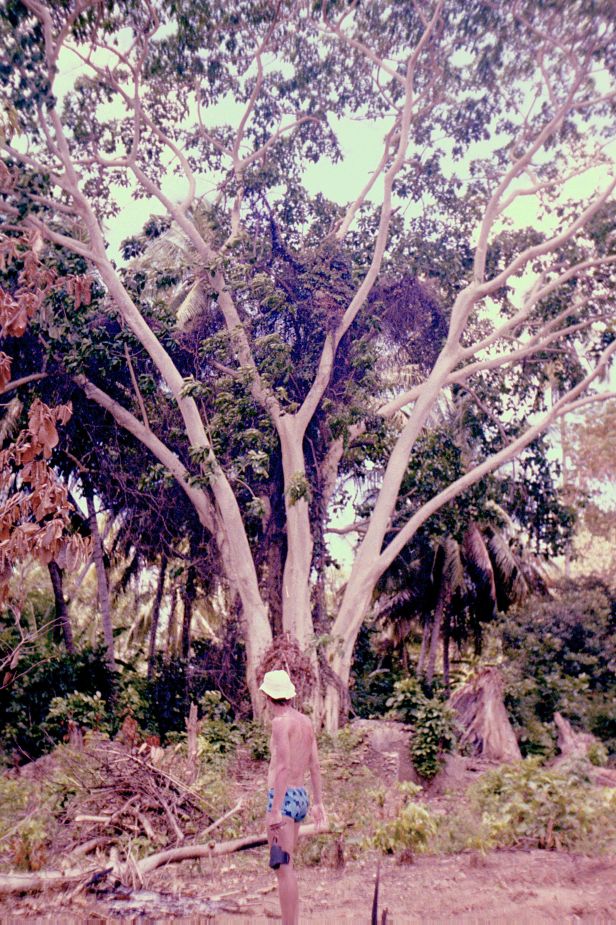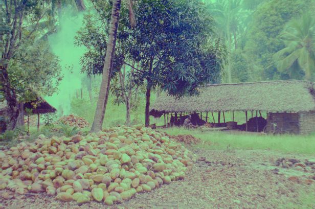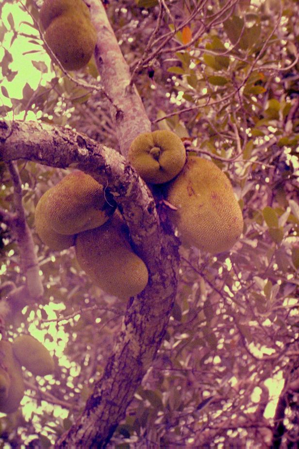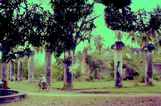 Op het eiland groeien de meest rare en onbekende vruchten. Het was maar goed dat ik die Indiërs bij me had. Ze lieten de chauffeur overal stoppen en lieten me de vruchten zien. Een hat een flits bij zich zodat ik onder de bomen nog wat vruchten kon fotograferen. Het eiland is bekend om zijn kruidnagel. We zagen genoeg bomen maar na wat zoeken vonden we eindelijk het kruid. Weliswaar nog niet gedroogd. Kaneel, een bast van een boom, vonden we ook. Het was prachtig om over dit groen, exotisch eiland te rijden. Overal zag je bananen en grote bergen kokosnoten. Ze halen de coccus eruit en drogen en malen het vruchtvlees. Ongelofelijk wat een hoeveelheden. We reden uren heel rustig door de gewassen. Met een goede organisatie zou dit een ontzettend rijk eiland zijn. Vroeger was het het rijkste eiland van de wereld, wordt gezegd. Ik kan er echter niet veel meer van terug vinden of het moet een paar vervallen paleizen of grote huizen zijn die ik zie. Men zegt ook dat het beter was onder de Sultan. In ieder geval mooier.