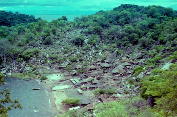 ‘s Avonds erg veel gedronken en lekker gegeten. Er waren allerlei mensen die speciaal voor Paul op kwamen dagen. De volgende dag mocht ik Paul’s Peugeot lenen en scheurde met een gids door het park heen op weg naar een oude hoogoven van 80 cm. Diameter en 2,5 – 3 m hoog. Zaterdag ben ik voor de eerste keer gaan liften. Het gaat prima. De mensen nemen je gauw mee als ze jouw kant uit gaan. Alleen gaan er niet zo bitter veel jouw kant uit. Het was dus erg veel wachten in de regen. Wat dat betreft was het een trieste dag. Vandaag heb ik genoten van de enorme gastvrijheid van de Malawianen. Ik liep hier over een pad door de heuvels langs het meer. Vlak voor een vissersdorp nam iemand me mee het dorp in. Ik trok de rest van de dag met hem op. At bij hem thuis (Nshima en vis) en sliep mijn middagdutje bij hem. Hij nam me in een uitgeholde boomstam over het water naar een ander vissersdorp. Daar hadden ze een geweldig groot strand. In een dorp daar wat verder op dronken we thee bij een tante van hem. Alle mensen in deze 3 dorpen kwamen uit het veel noordelijk gelegen Nahata bay. Ze vissen hier omdat de vis meer opbrengt (ze kunnen transport krijgen naar de steden). Het was erg verleidelijk om niet een paar dagen bij hen te logeren en mee te doen met het dorps leven. Het was echt geweldig.