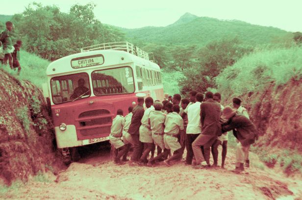 Ik ben nu verzeild geraakt op een missiepost van de witte paters. Toen ik gestrand was met de bus van Rumpi naar hier kwam een van de paters langs. Hij raakte ook vast maar kwam de volgende dag al vroeg weer los. Wel nadat hij de bus geramd had. Eerst mocht ik niet met hem mee rijden. Hij was overladen. Zeker want hij had maar liefst 20 zakken van 50 kg cement in zijn Peugeot 404 pick-up liggen. Ik hielp hem bij het loskomen in de hoop dat ik wel mee kon rijden. Wat maakte die extra 100 kg op de 1000 kg uit. Gelukkig mocht ik de volgende dag mee. Ik voelde me al helemaal niet gezond. Diarree en verschrikkelijke hoofdpijn. Vanochtend werd via een bloedproef vastgesteld dat het malaria was. Nu zit ik hier wat op krachten te komen om de moeilijke tocht van hier door Zambia naar de Tanzaniaanse grens te maken.