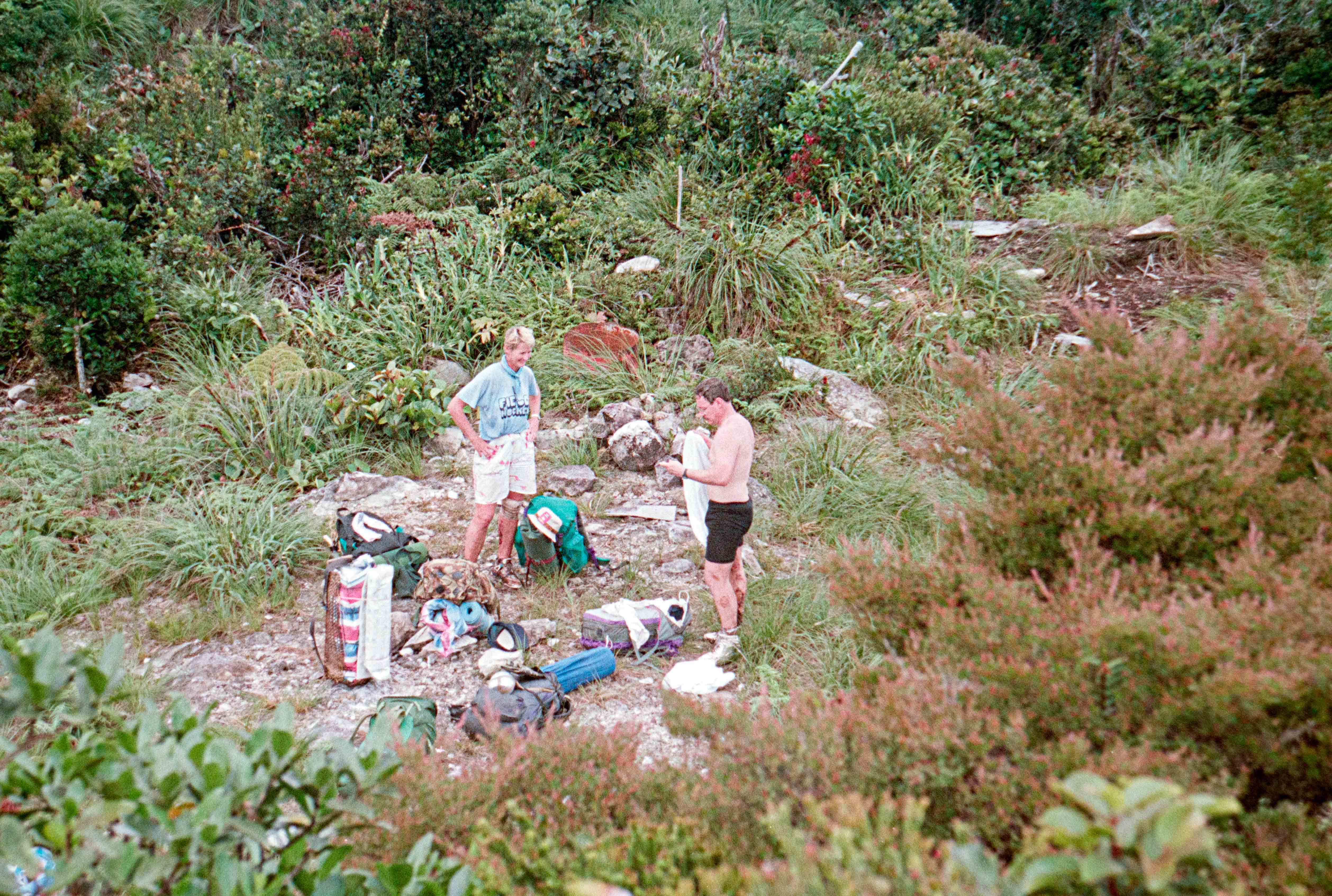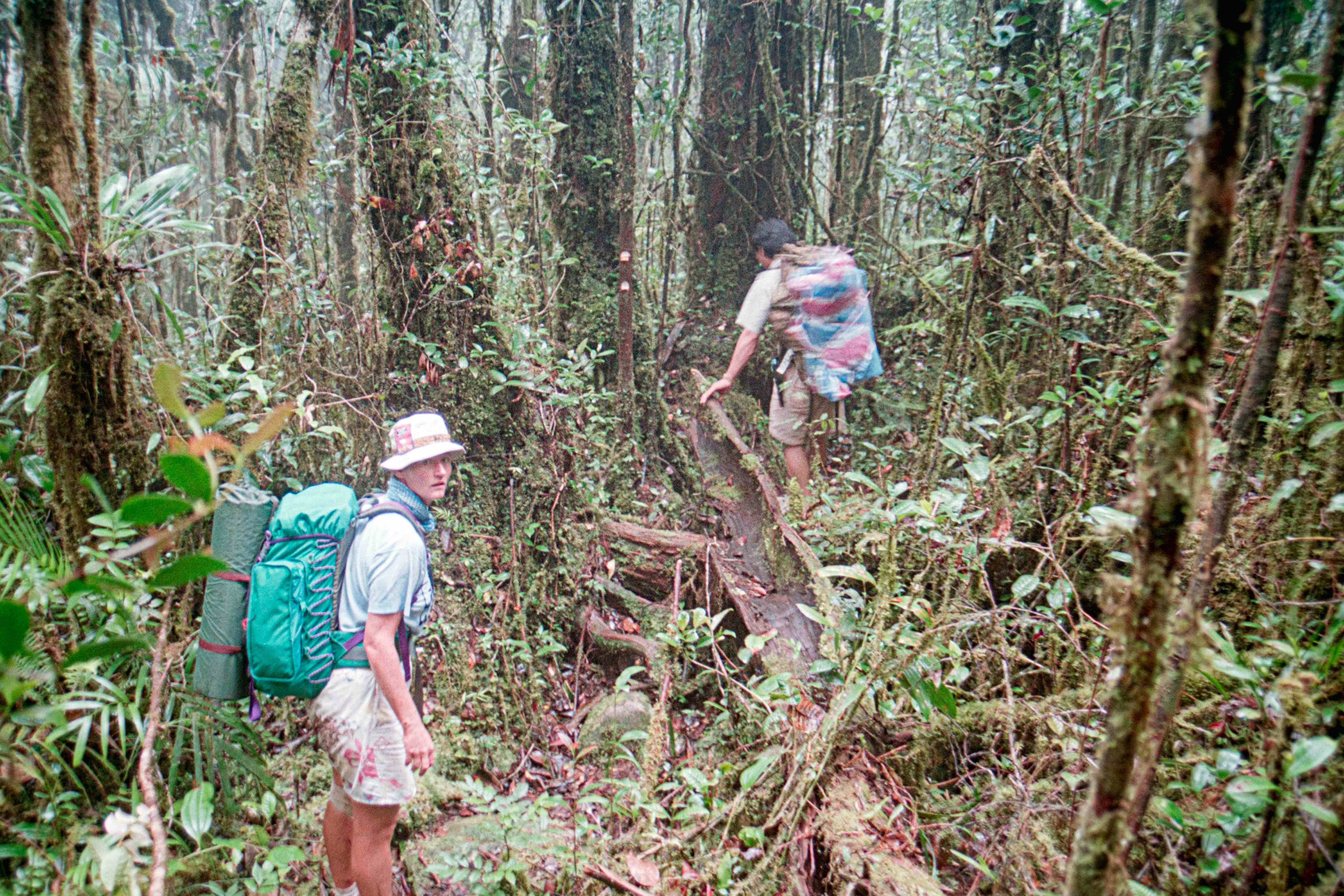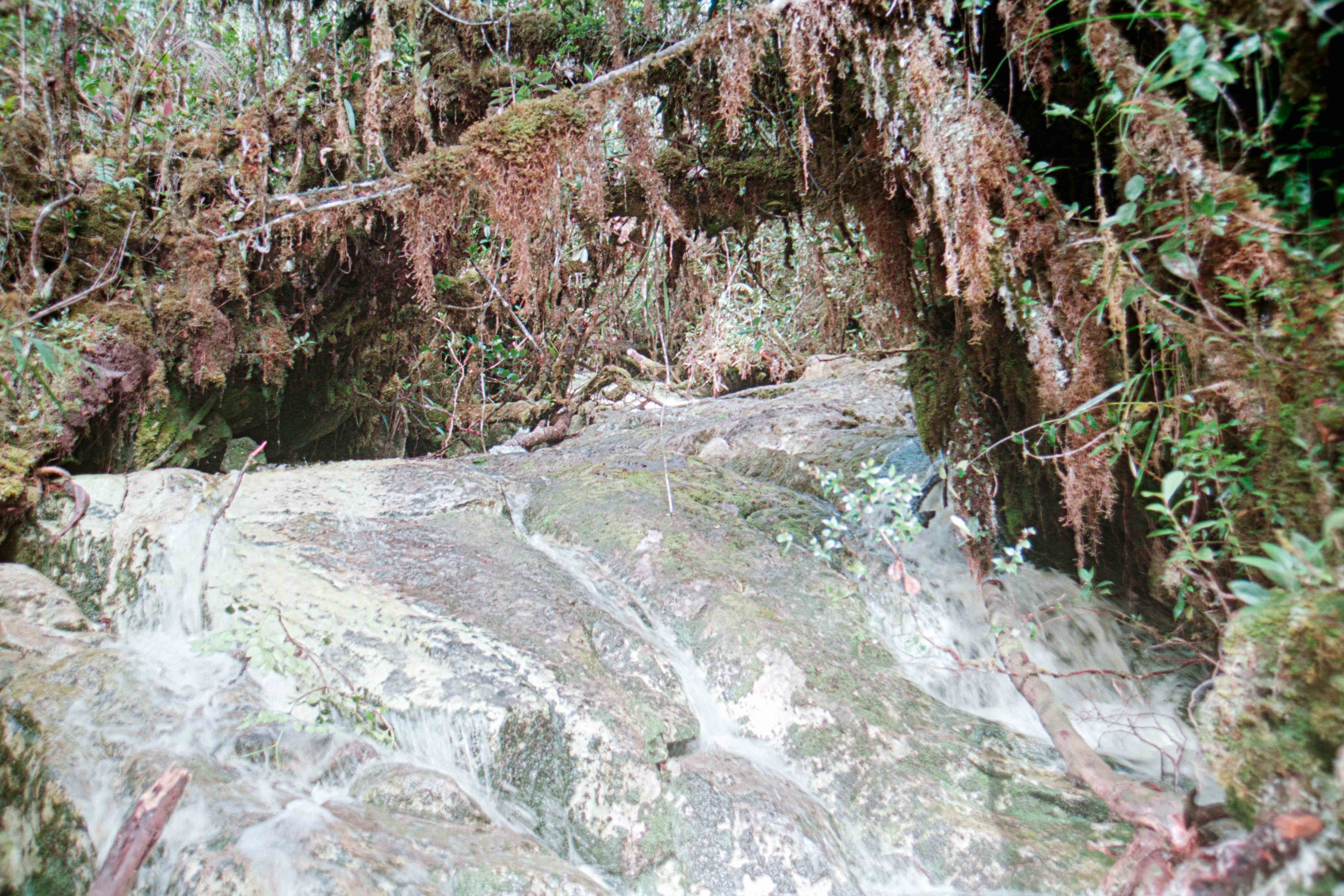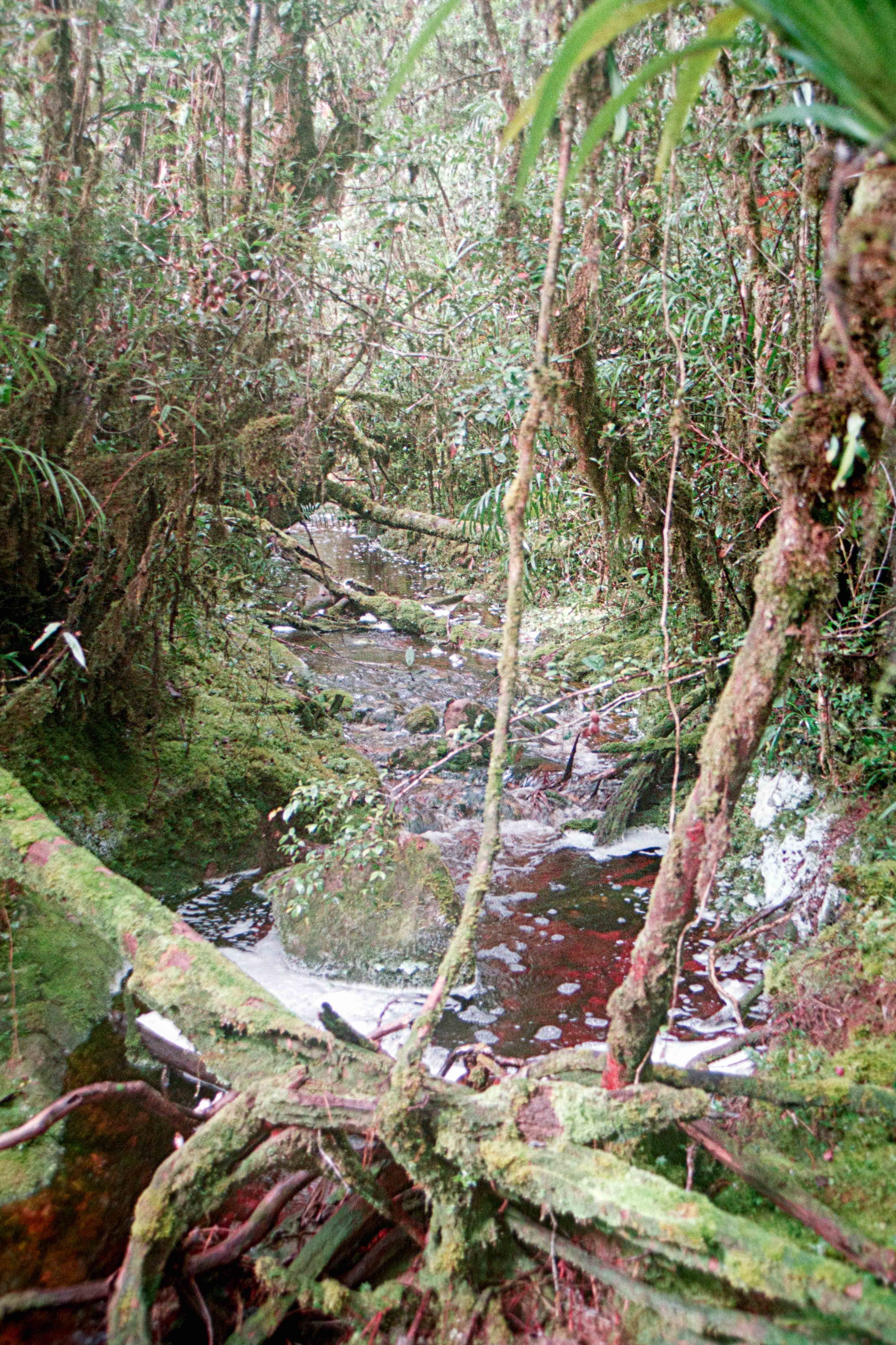 Het laatste deel Gunung Murud op (2484 m), lekker klimmetje door de mossige, natte Cloudforest”. Op deze berg ontspring de Baram rivier. Hier slechts een stroompje die Dapur rivier heet. Vanaf dit moment zijn Dio en ik Buffulo en Buffelientje. Het pad is wat glad en lekker balanceren en aan takken hangen. Wij dus constant op ons achterwerk en dan weer op handen en voeten omhoog en omlaag, we worden dus ook lekker vies en dat blijven we ook de rest van de trip.
