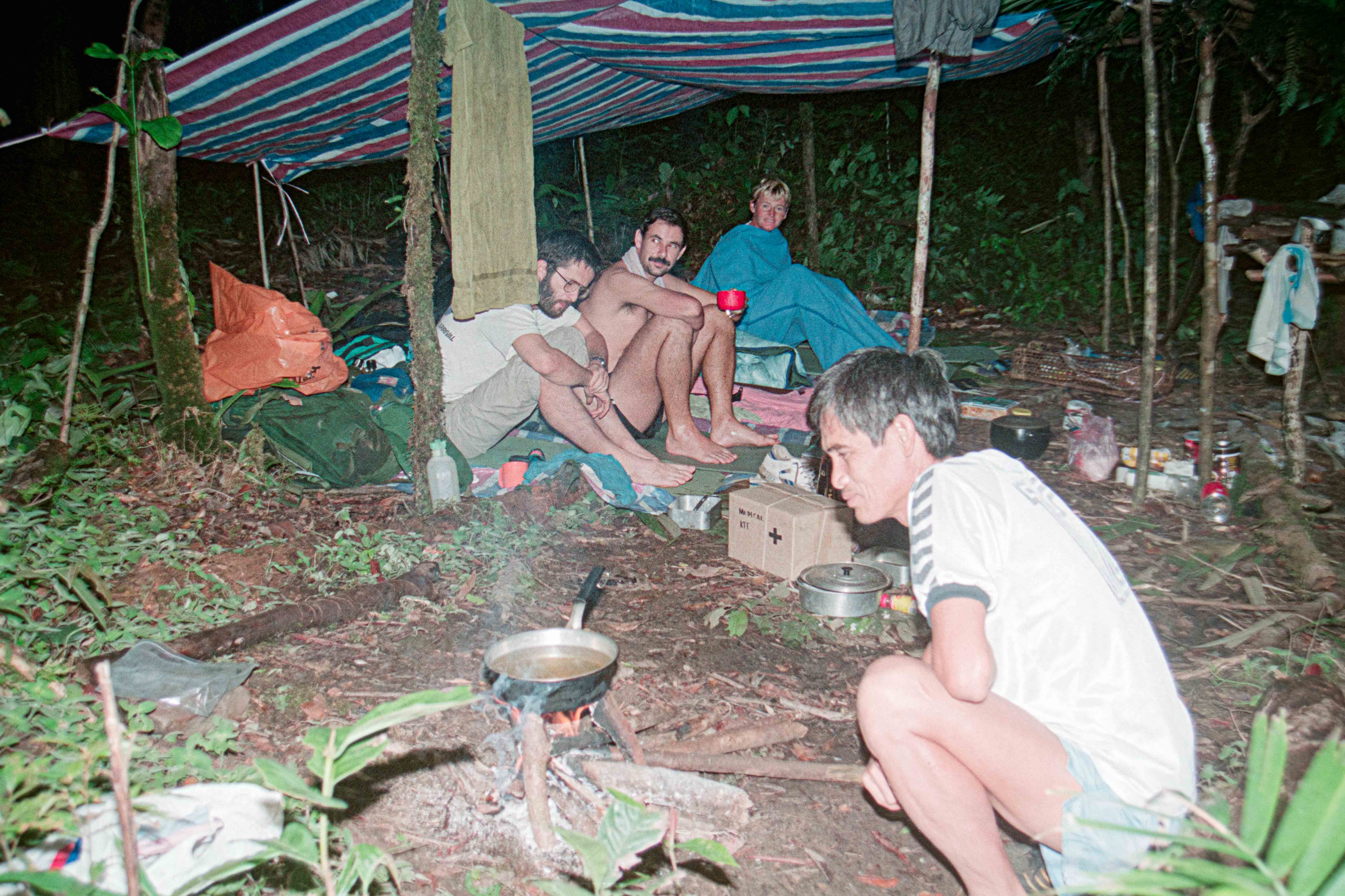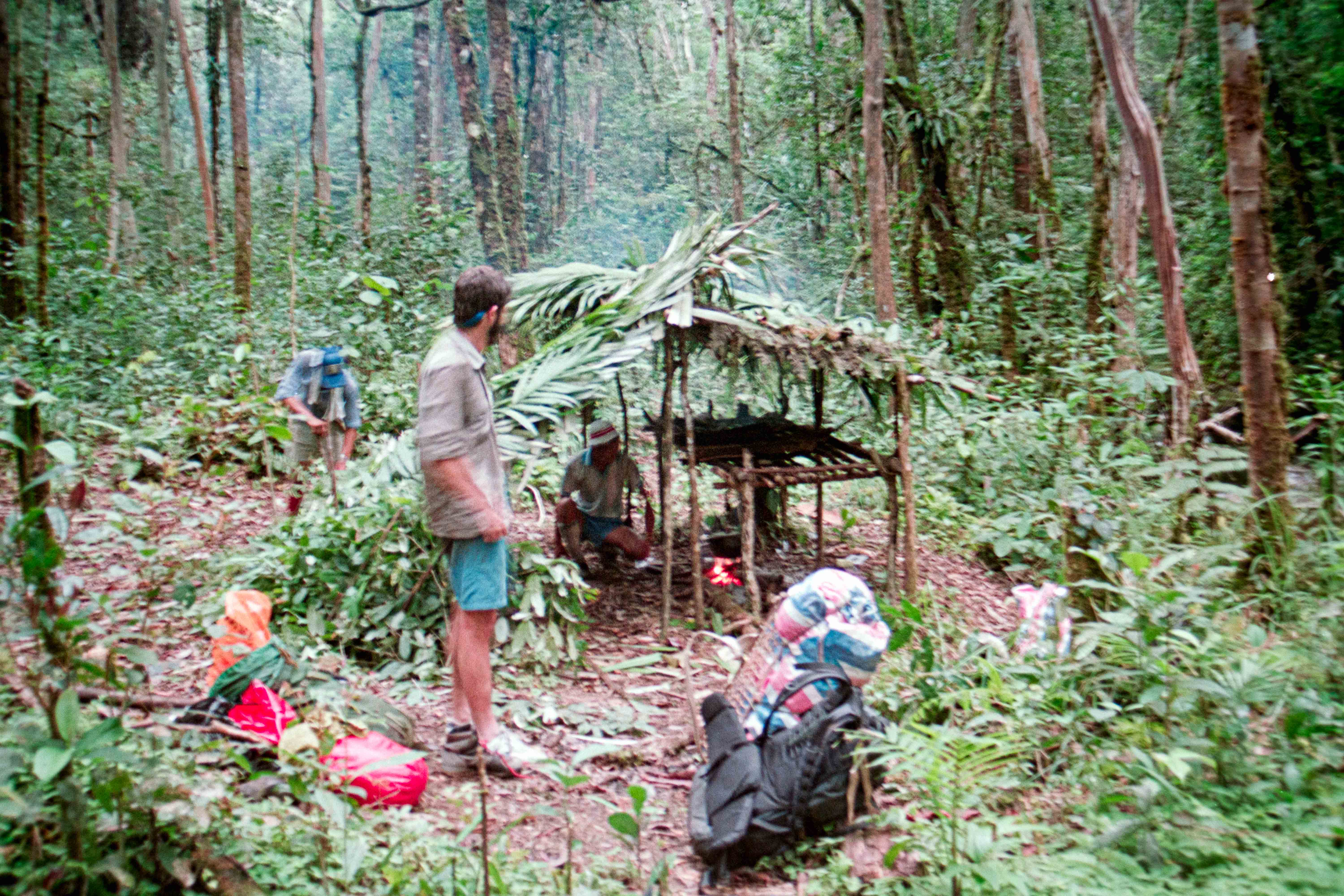 Daarna 2 uur langs de bergtop lopen, soms een prachtig uitzicht en soms zie je helemaal niets, daarna dalen, dalen, dalen. Het zou maar een klein stukje moeten zijn naar de shelter, Dat was dus mis. Helemaal beneden is een vorm van een shelter weer in een vork van 2 stroompjes. Marc, Dio, Noah (de gids) en ik komen dus wat later net voor het donker is om 18:30. Maar er staat alweer: thee op ons te wachten. 8,5 uur gelopen.