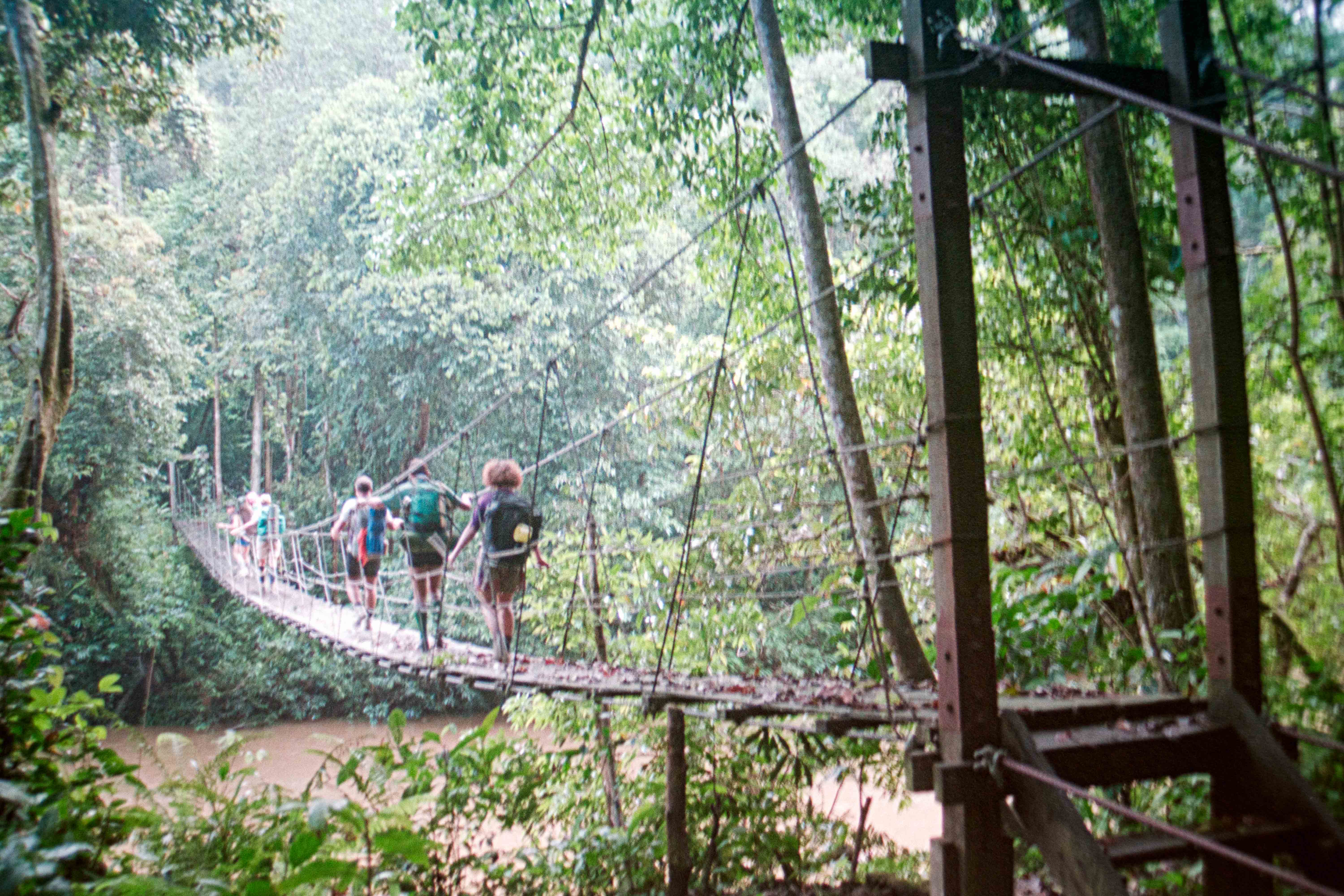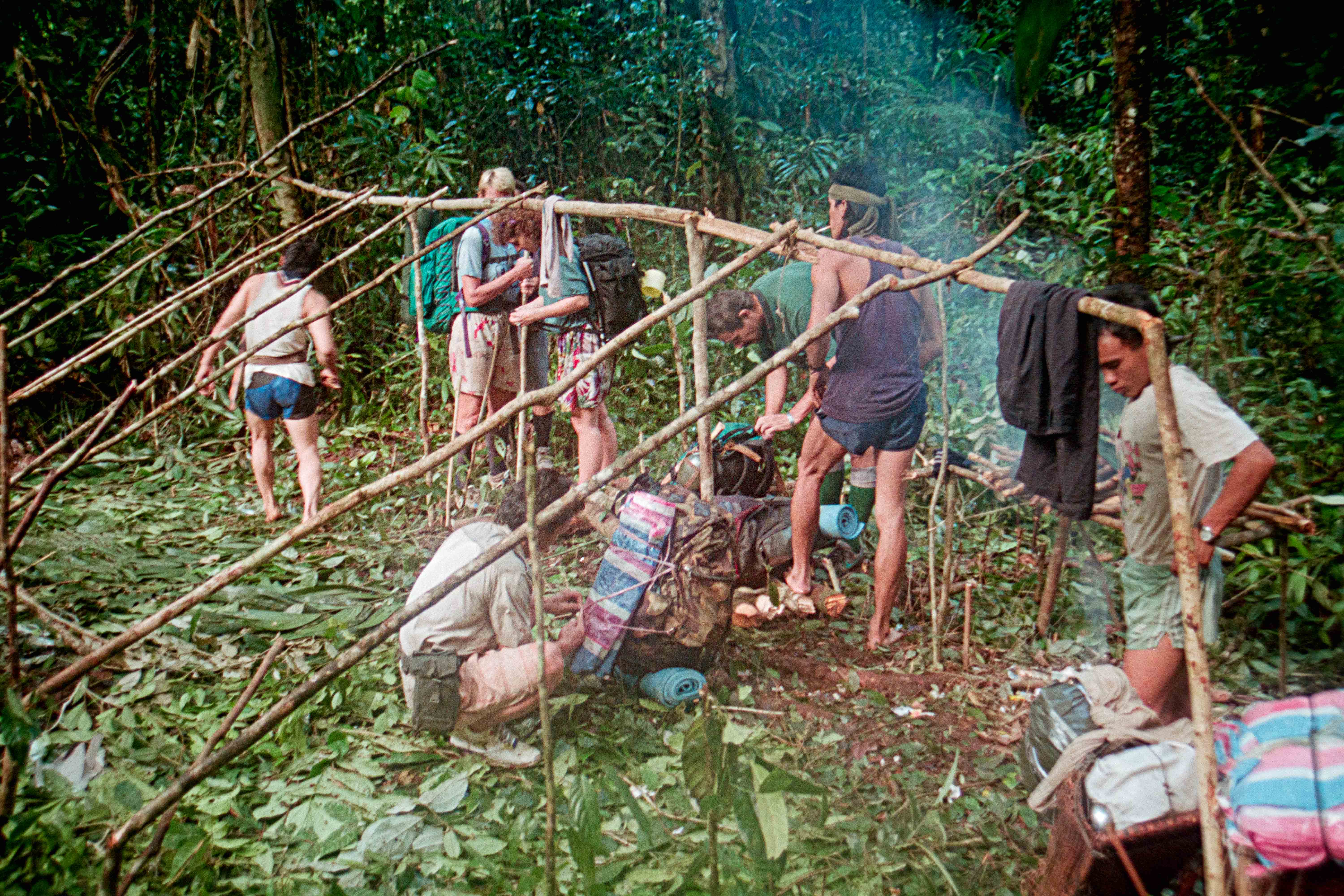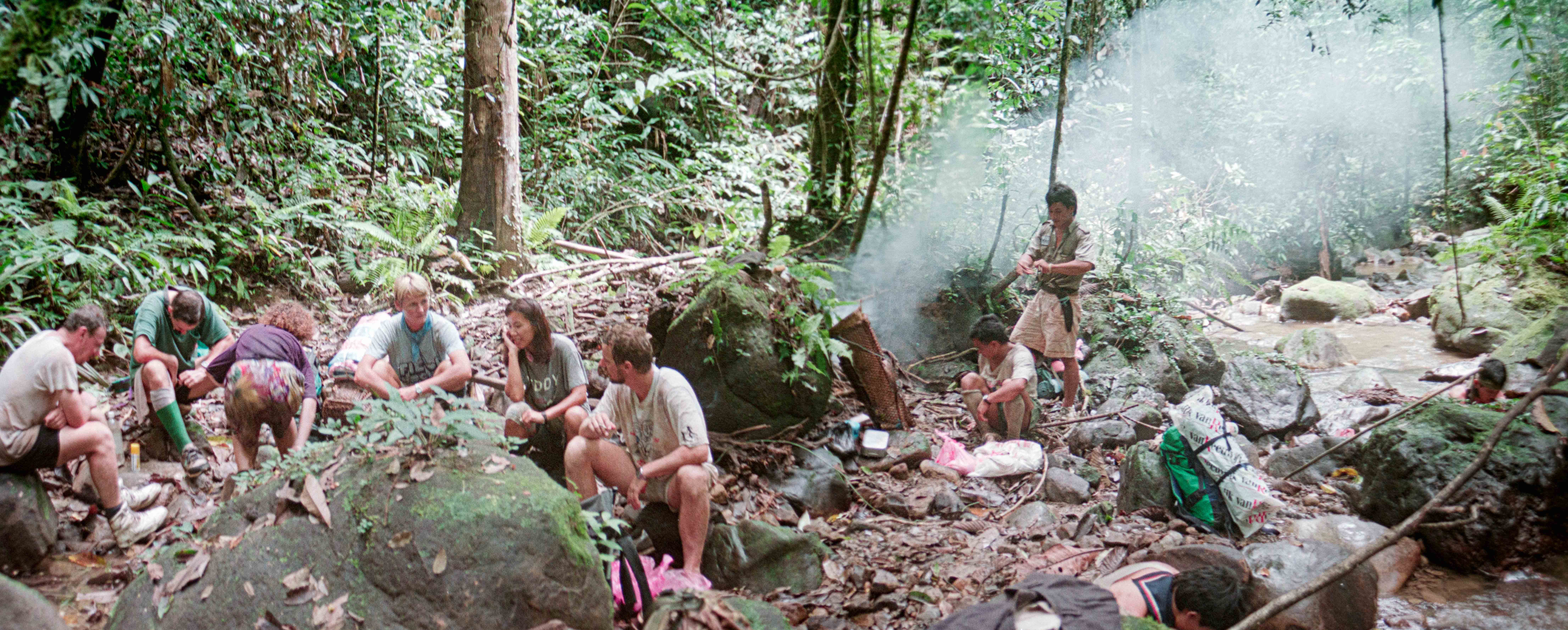 De dragers verdwijnen snel uit het zicht, achteraf met reden want na 2 uur, als we voor de gezwollen Sungi Meren staan, kunnen we er niet meer overheen. De dragers hadden al een stukje jungle platgehakt en hebben in een mum van tijd een prima shelter voor ons gebouwd, zeilen erover, palmleaves op de grond, vuurtje en meteen droog t-shirt en short aan. Zo zitten we zo weer aan onze Assam thee met pinda’s, (de koekies zijn op). Je krijgt wel bewondering voor de dragers en gidsen, wat zij even in een uurtje bouwen, zijn wij echt een hele dag mee bezig in de jungle. Kumiko heeft nog een blikje Cola in de rugzak: sinds dien was het ook Kumicola. Met de angst voor de bloedzuigers in haar slaapzak, strooit Kumicola lustig met talkpoeder rondom haar matras en slaapzak, velen volgen haar voorbeeld. Het helpt nog ook! De vrienden blijven nagenoeg weg.