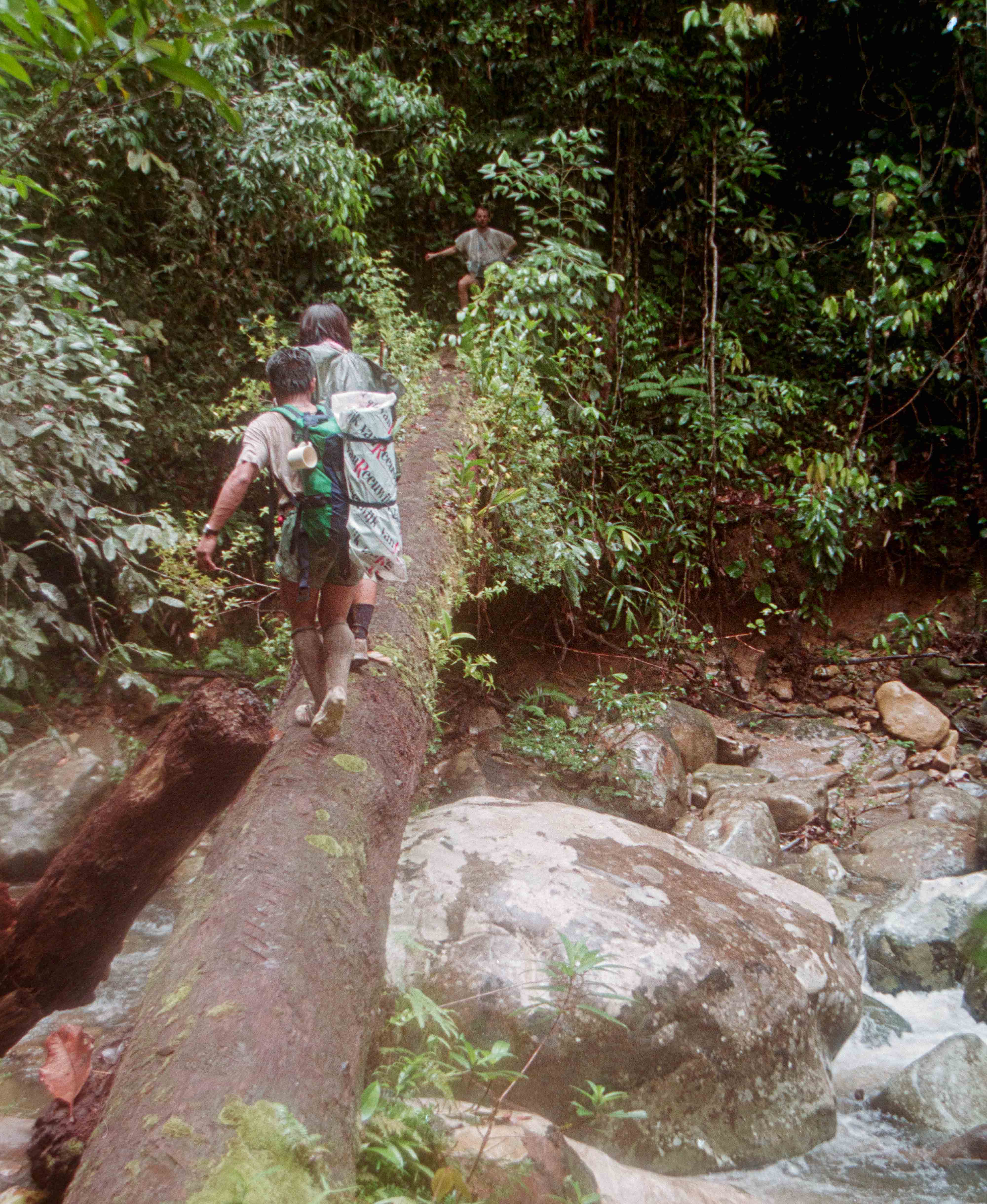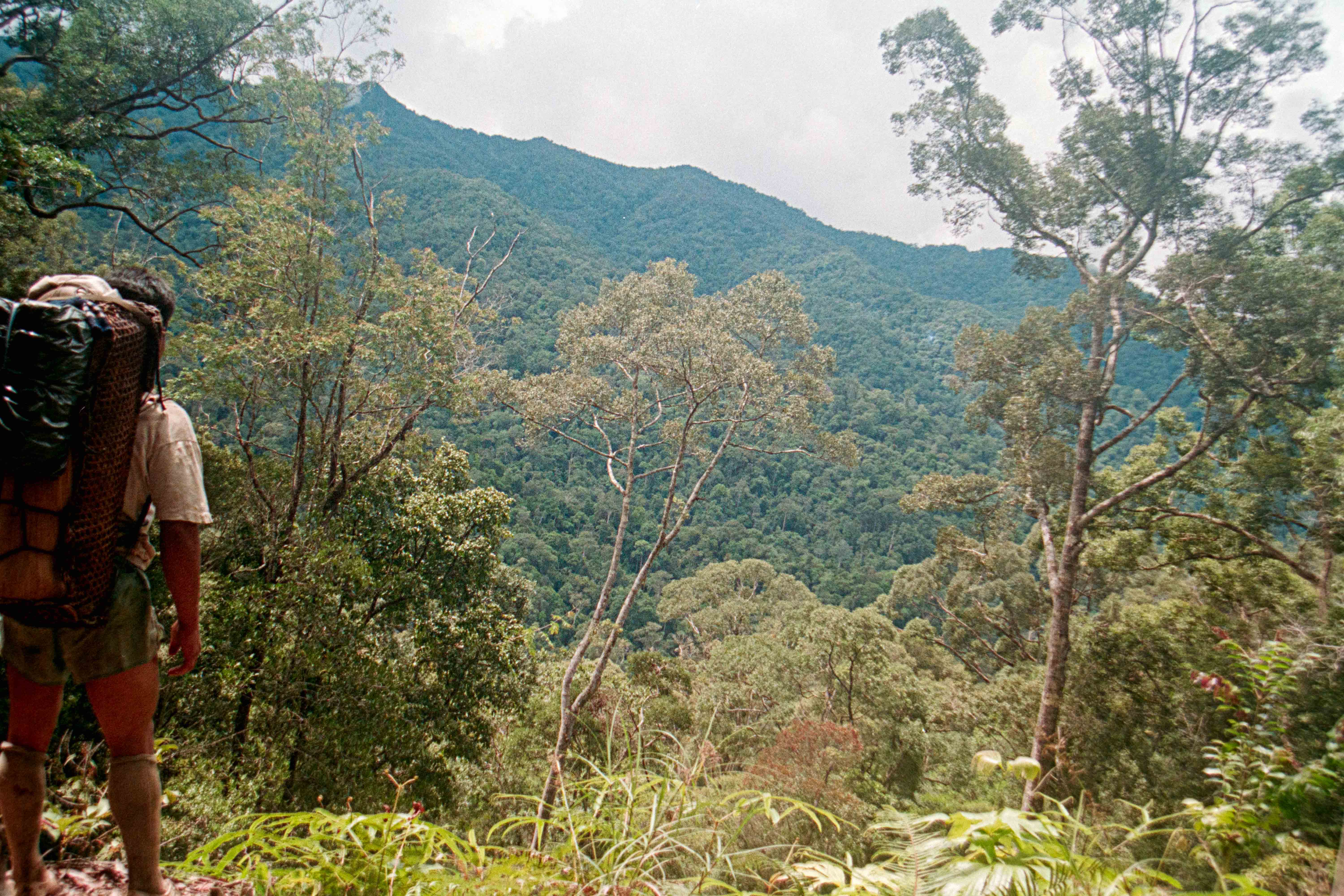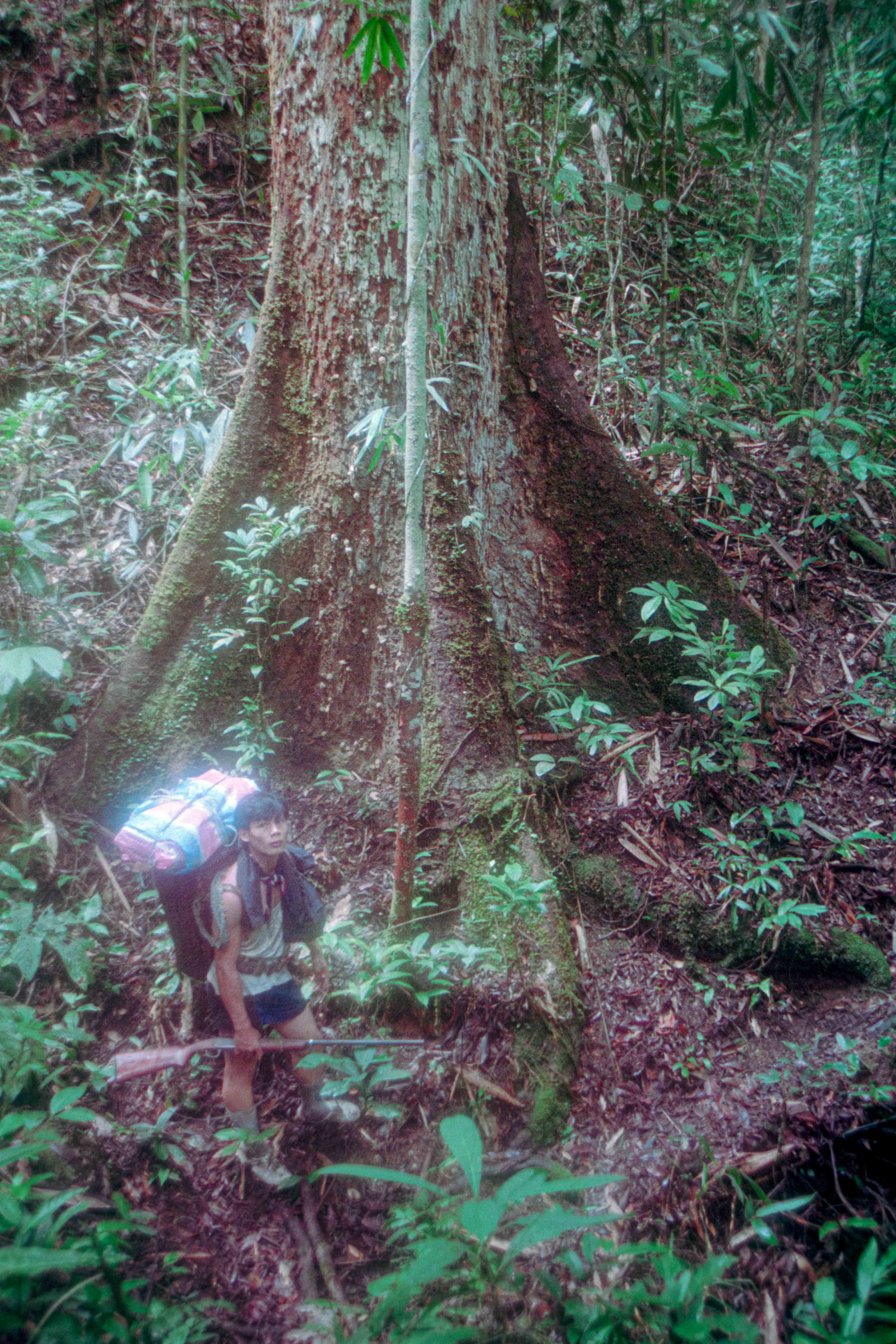 We worden wakker order ons zeiltje. De wereld ziet er weer behoorlijk droog uit. De rivier is nu over te steken. Het is weer klimgeitje spelen. Het is 4 uur lopen tot de lunch in Pa Okan (ons originele bivak). Daarna is het weer glibberen en glijden geblazen, het duurt allemaal onwijs lang. Soms hoor je het geluid van de “Barking Deer” en een van onze porters gaat er vandoor om een een af te schieten. Hij heeft geen succes. Af en toe rent Edwin “de Bont”, onze cameraman, snel vooruit voor wat actie opnamen. Komicola rent dan in wanhoop alleen over de hellingen omhoog en omlaag en probeert bij te blijven.