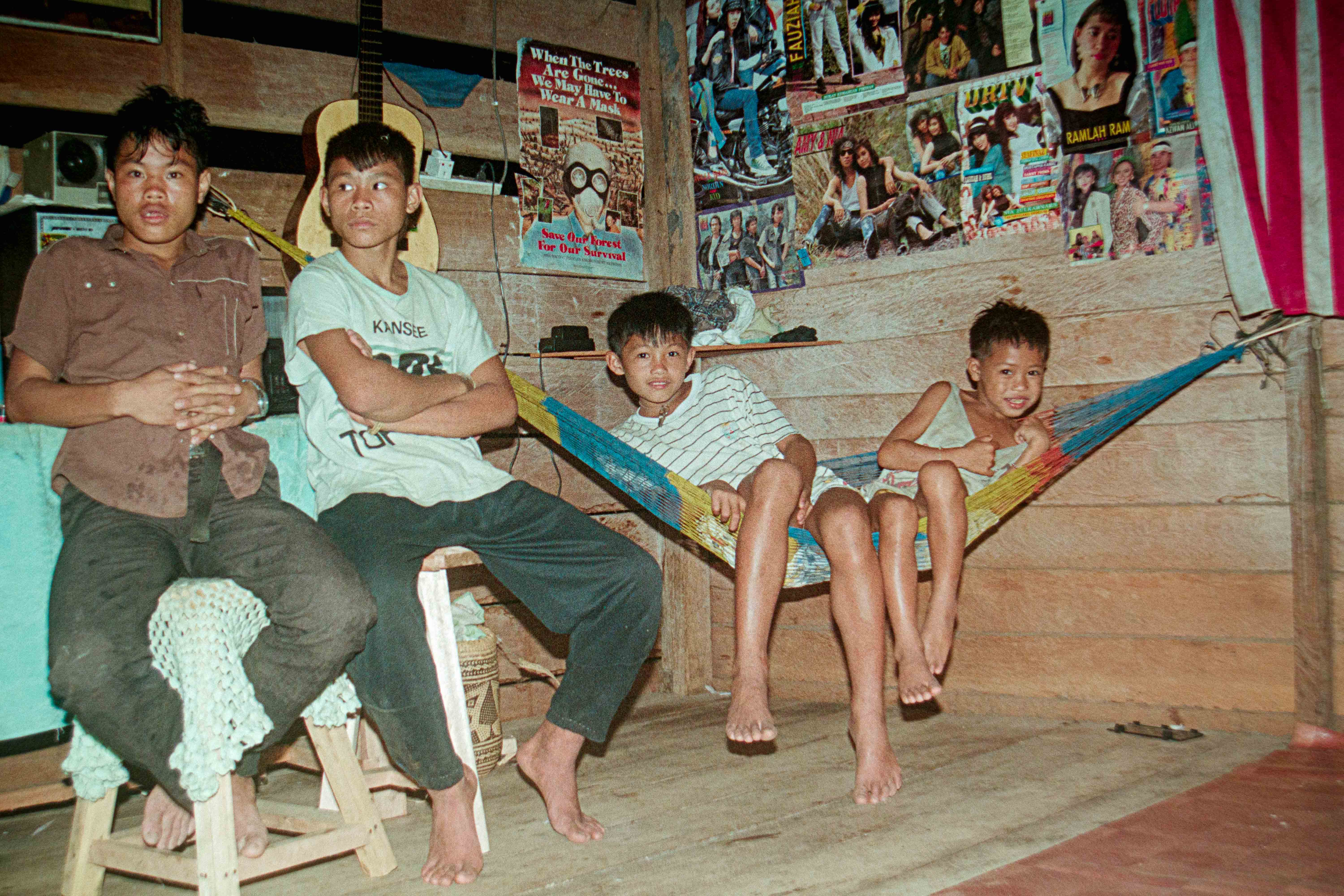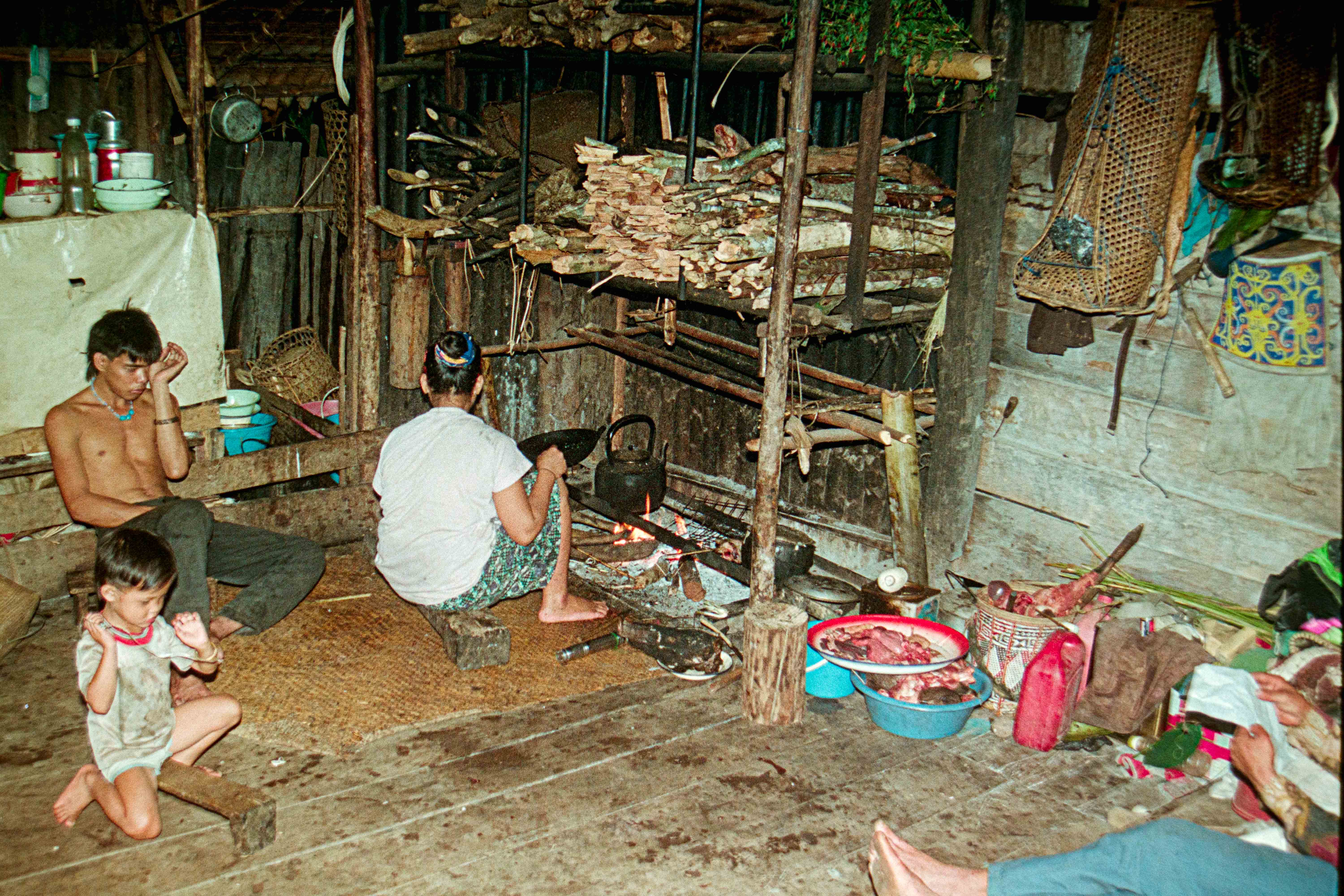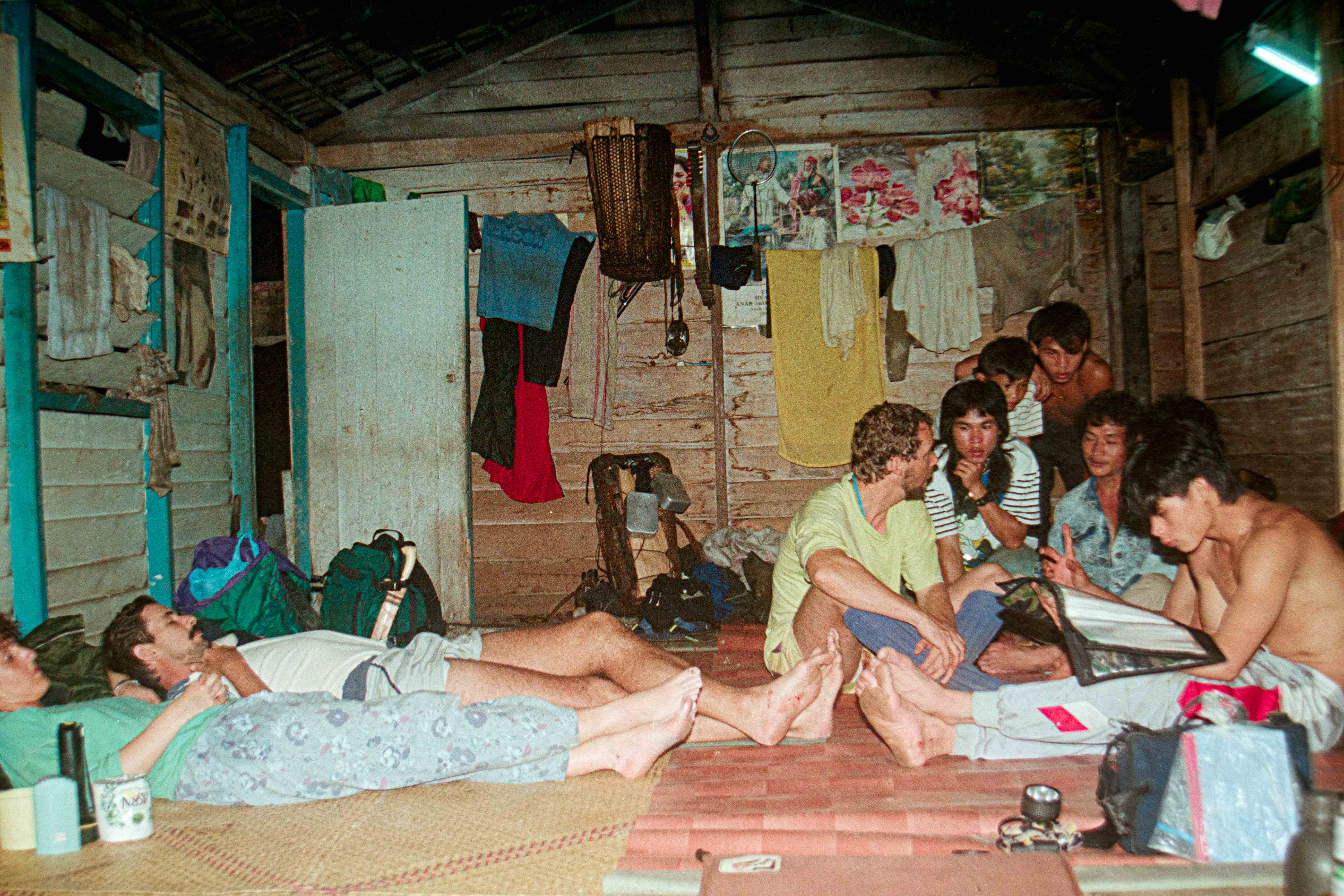 Het laatste stuk is het al lekker donker, en als allerlaatste storten we ons over een zeer gammele brug om dan nat, bemodderd en doodmoe in een Punan settlement te belanden. Het onthaal is gastvrij, wel… we hebben wat moeite met het lokale eten. De ingewanden van een wild zwijn zijn naar mijn idee niet geheel smakelijk. Edwin tokkelt wat op een gitaar en bij die country en western klanken valt iedereen in slaap.