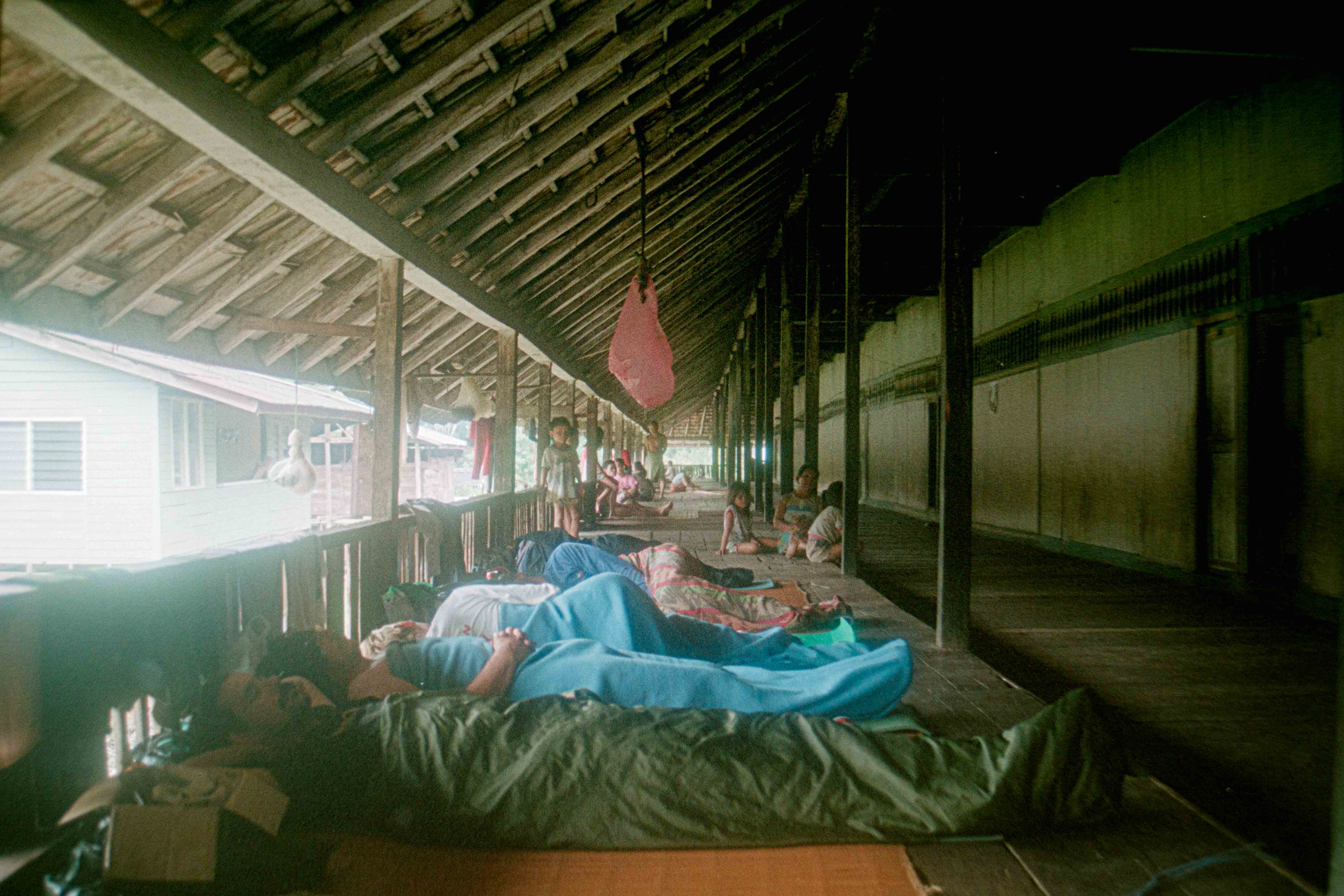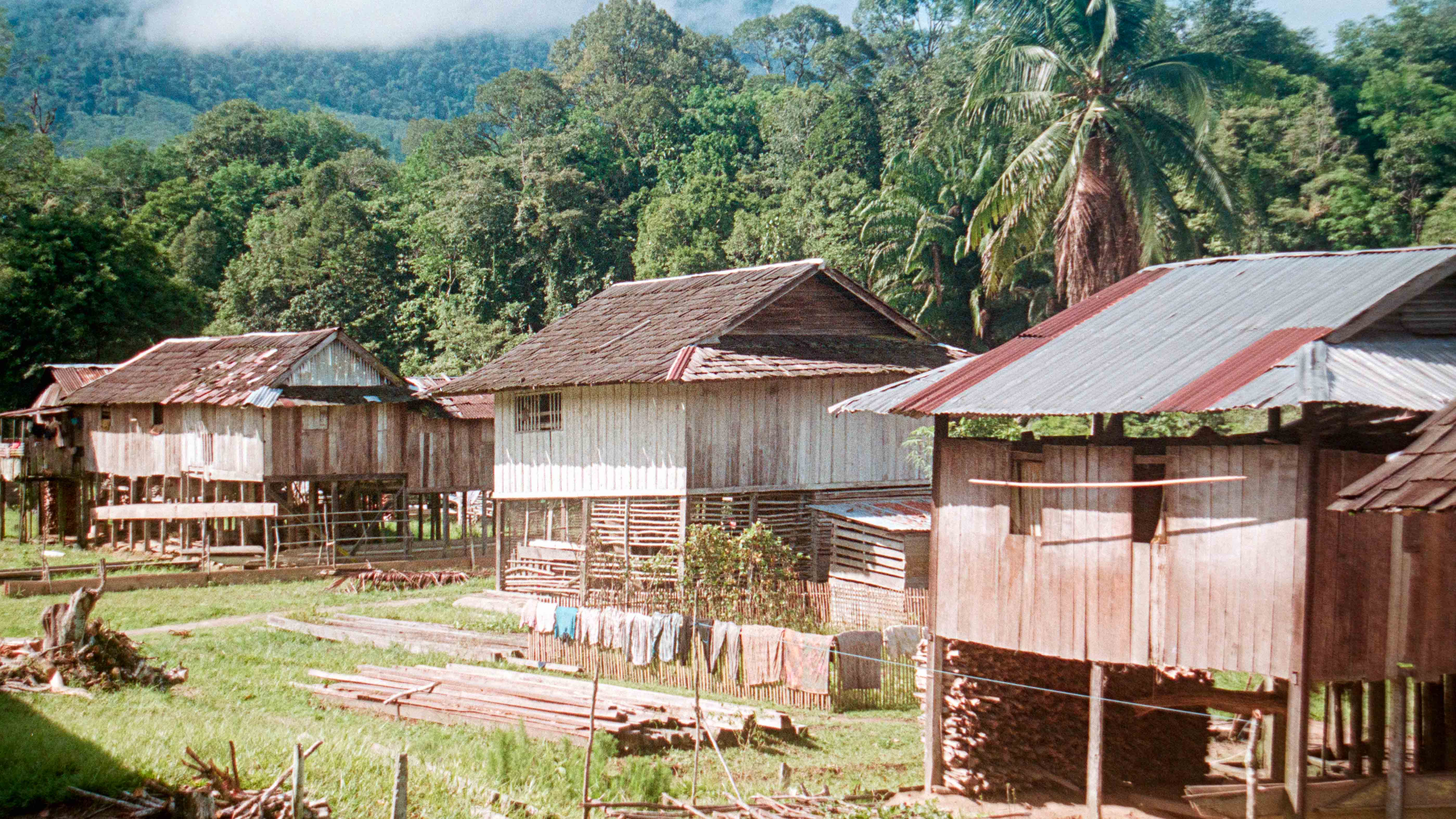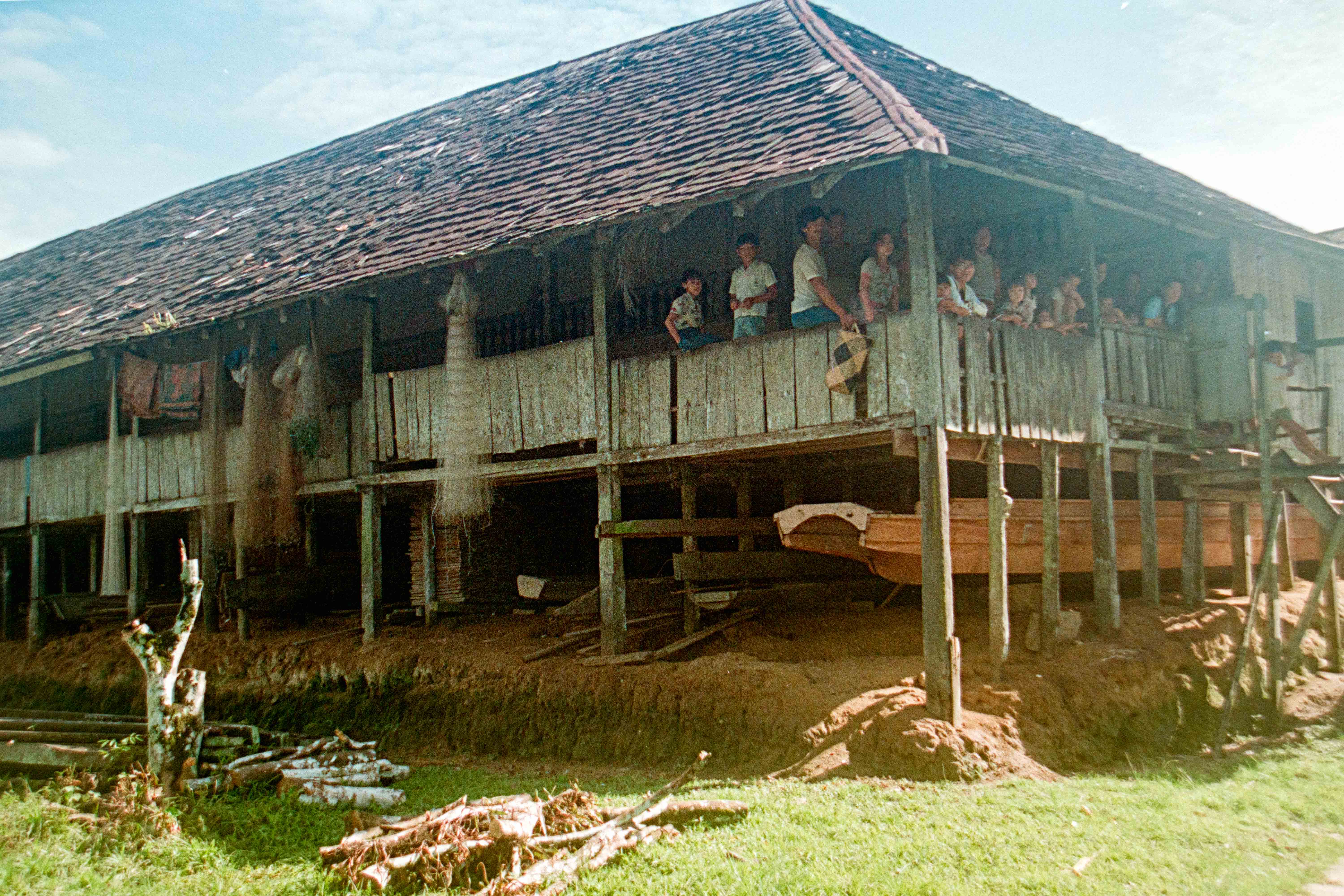 Uit diepe slaap ontwaakt, ontdekt iedereen een mandibak en oh wat zijn we weer schoon. Het zit verder behoorlijk mee, er is een boot, de waterstand van de rivier is juist en met een 4 uur boottochtje komen we aan in Long San. Waar we onszelf met roodverbrande armen, benen en neuzen en ook nog houten billen uit de boot hijsen. Maar ik zou nog uren kunnen zitten. Dat gaan we dan ook de komende uren doen. Een echte restaurant maaltijd, lauw bier en je benen op een stoel is goed toeven, Het dorp wordt nog verkend. De lokale Nederlandse pater is er niet, maar we genieten van een kinderkoor. Edwin “de Bont” heeft zich voor deze dag verkleed als Swiebertje, met het gevolg dat we halen alle zwart wit tv-programma’s weer uit de doos. Vanwege de intensieve logging in de omgeving is Long San met een weg verbonden met de Miri-Bintule highway. Er is een ferry over de Baram en er wordt ook een brug gebouwed.