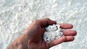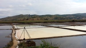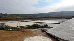 In some other sections it was so steep (and narrow) that you could only get up in first gear. Still Passepartout performed well and brought us over the hills, over tarmac roads as well as narrow gravel roads, back to the coast. Driving towards our next rest area, we saw in the distance small white mounds. Coming closer we discovered these are salt mounds. We saw several people working and putting them into bags for sale. If you want a 10kg bag of salt you can buy them here for small price.