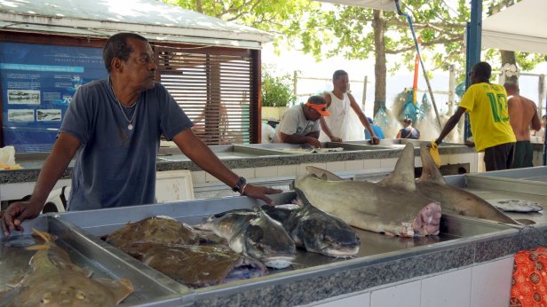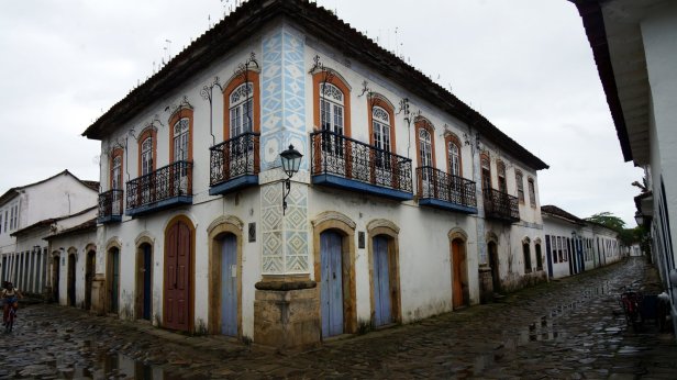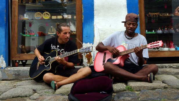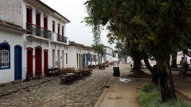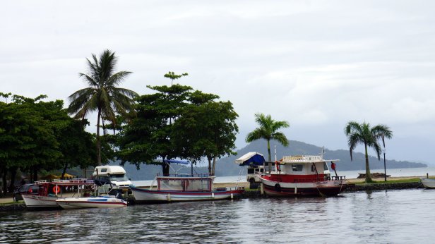 The road along the coast does not follow the beach but ismore inland. You are driving up and down through the coastal forest. There arenot as many resorts along the way between the road and the beach so there are not as many speed bumps to slow you down. We made good progress and were at Paraty at lunchtime. Although it was only some 255 km further to Rio we decided to stopover at this historical beach town. We parked the camper near the beach next to 2 other overlanders. They are both young Argentineans couples on a tour through Brazil. The town is on the tourist trail. A bus group wandered the cobbled streets. It used to be the port through which the gold from the hinterland was exported. This was one of the easier places to cross the coastal mountains. As a result of these riches there are several old churches and paved streets. After inspecting the town, we settled down for a huge fish lunch at a restaurant on the beach. It is more common here to have a big lunch and a snack in the evening. That is also why not many restaurants are open along the road in the evening. The lunch was so filling that we just laid back and relax on the chairs on the beach and enjoyed the view.