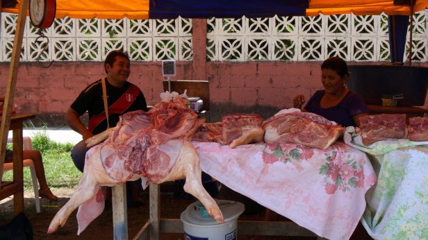 The road on the last stretch to Puerto Maldonado in Peru is good. Border crossing was easy. Getting passport stamped was quick and orderly. Processing car import paper took more time as only one officer was on duty. And no inspection of the camper at all. As we were not in a hurry, we slowly drove through the hills to town. Only small farms exist here and most of the jungle is still intact. Along the road there is also much more fruit for sale. Puerto Maldonado was established for the rubber trade around 1902. Now it concentrates on small gold mines along the rivers into the jungle, agriculture and jungle tourism. It started growing rapidly with the arrival of the Carratera Oceanica to the Brazilian coast and the completion of the bridge over the wide Rio Madre de Dios some 6 years ago.