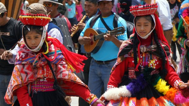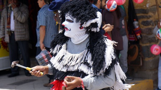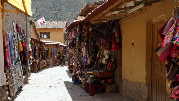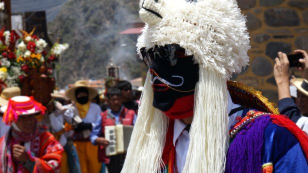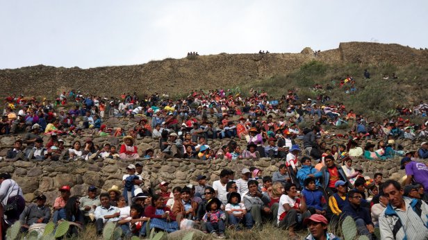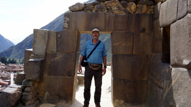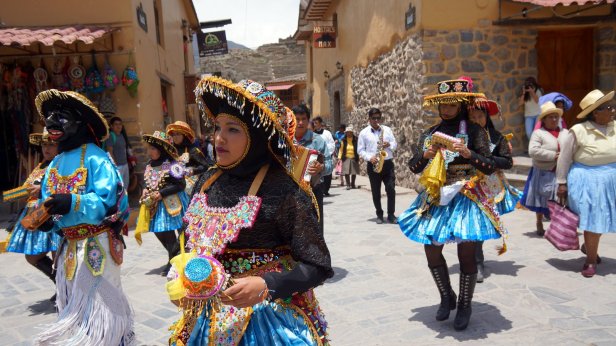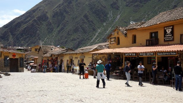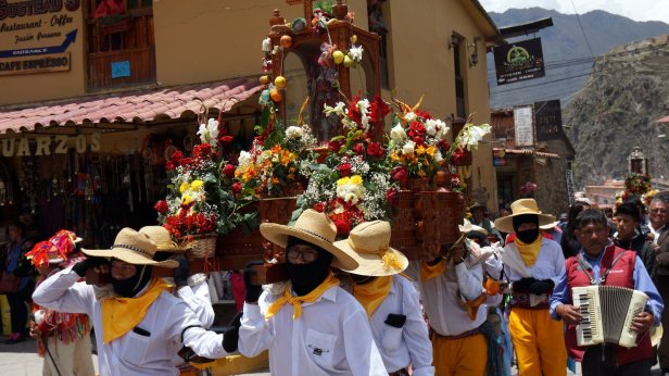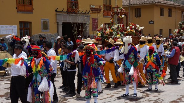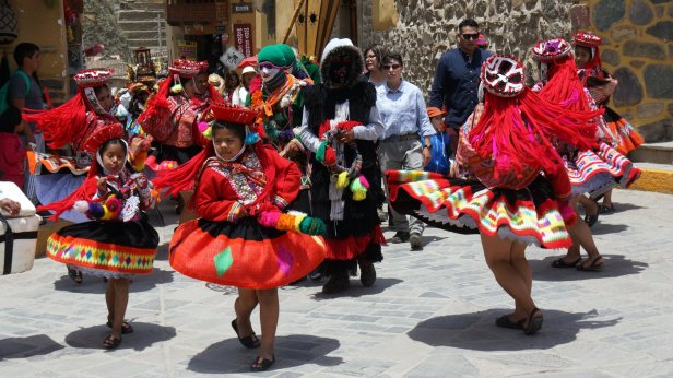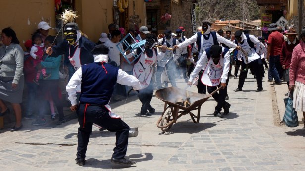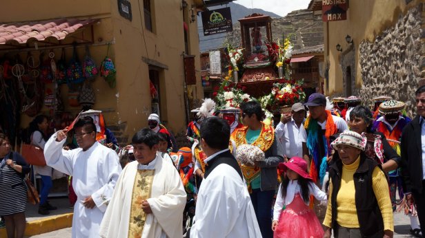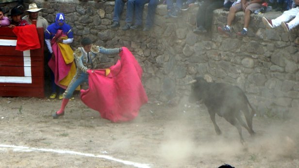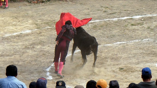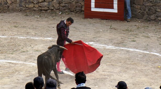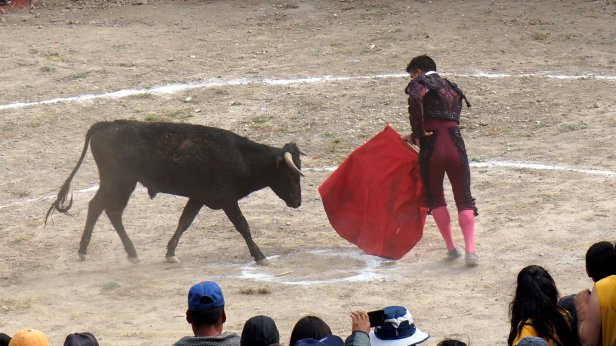 Driving along the Urubamba river through the Sacred Valley we reach the Inca fortress town of Ollantaytambo. The fortress and terraces dominate the mountain sides above the town. We parked the camper for the next 2 nights on a large guarded parking place on the outskirts of the town. It was the sixth of January i.e. Epiphany. There is then a 3 day festival in town. We were in time to see the bullfight. In this case the bull does not get killed but just annoyed with a red cloth by the matador.
