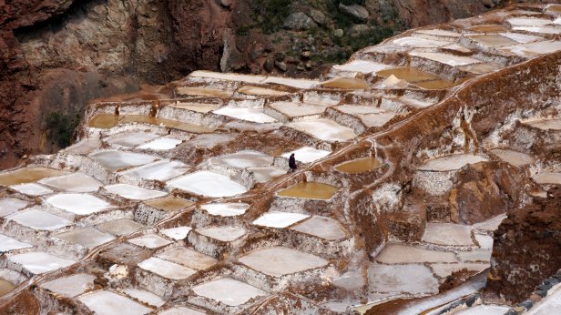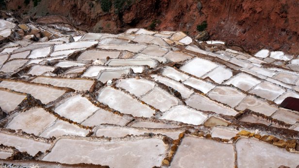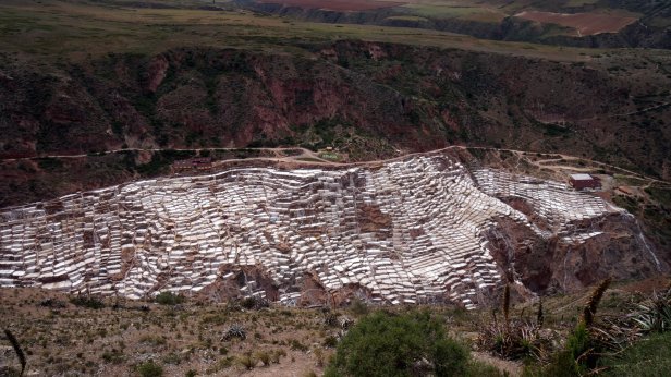 After the parades in Ollantaytambo we drove in the direction of Cusco. The first detour was to Salinas. In this valley the salty warm water from a mountain spring is collected in evaporation ponds. The slopes of the mountain are a patchwork of white ponds in various stages of evaporation. Somehow the salt must have a second treatment because otherwise if will have sand from the bottom of the pond. Untreated it is used as cowlicks.