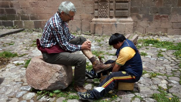 Not much further on was Cusco. We did have some hills to climb so we kept our fingers crossed with respect to the gearshifter. Cusco lies down in a valley. You climb over the rim and descend into the town. Roads are very bad and because we were driving slowly we were overtaken left and right. We managed to find our first choice garage but the owner was not able to help us. A bit further on after negotiating the busy traffic we came to our second choice of garage. Fernaldo the owner was busy and told us to come back the next day at 10:00 hrs. Some 2 km’s further up the road into town we managed to find a quiet plaza where we could stay for the night. Since we had time on our hands Jamaliah wanted to drop into the shopping mall nearby. That still went fine but when we tried to drive to the Volkswagen garage which was on a sandy potholed road along the landing strip the gear played up again and we had to abort the drive and limp back to our sleeping spot. The next morning we got it into the second gear and kept it there all the way to Fernaldo’s Garage. Is garage plot is full of wrecks and cars under repair. Our camper was squeezed in and work started immediately. The night before Rudy had worked out, with help of Roland from the VWstore in Assen, what the problem was and this was confirmed when we got access to the gearshifter on top of the gearbox after removing some cooling hoses (see Passepartout, camper issues to date). It was not clear how long the repair would take so we spent the whole day in and around the camper at the garage. When at closing time the problem still was not solved we spent the night in the camper at the garage. The next day we took the local bus in town while Fernalo and his team further tried to fix the problem which eventually they managed to do.