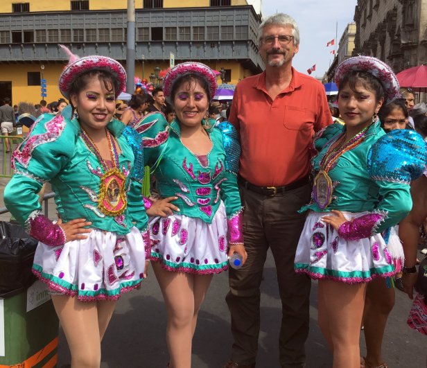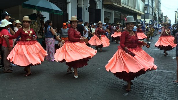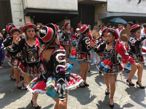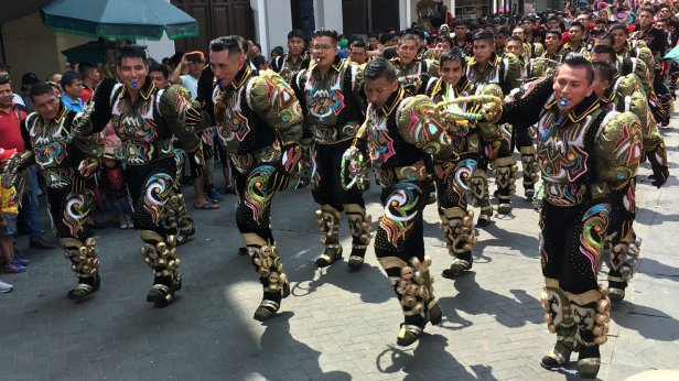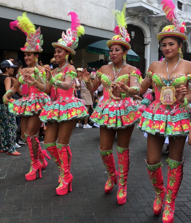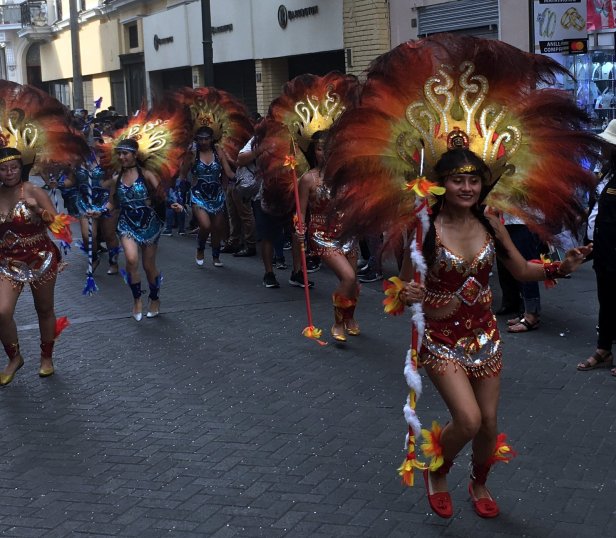 On Sunday there were several very noisy parades in town. Dans groups and bands tried to outdoe eachother. The costumes were very elaborate.