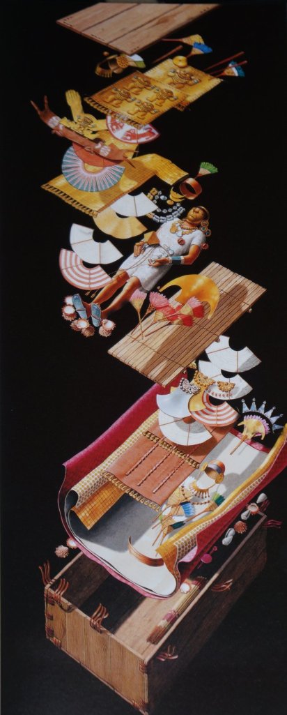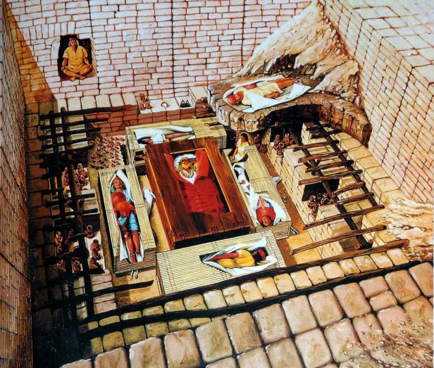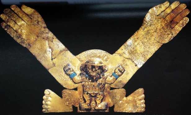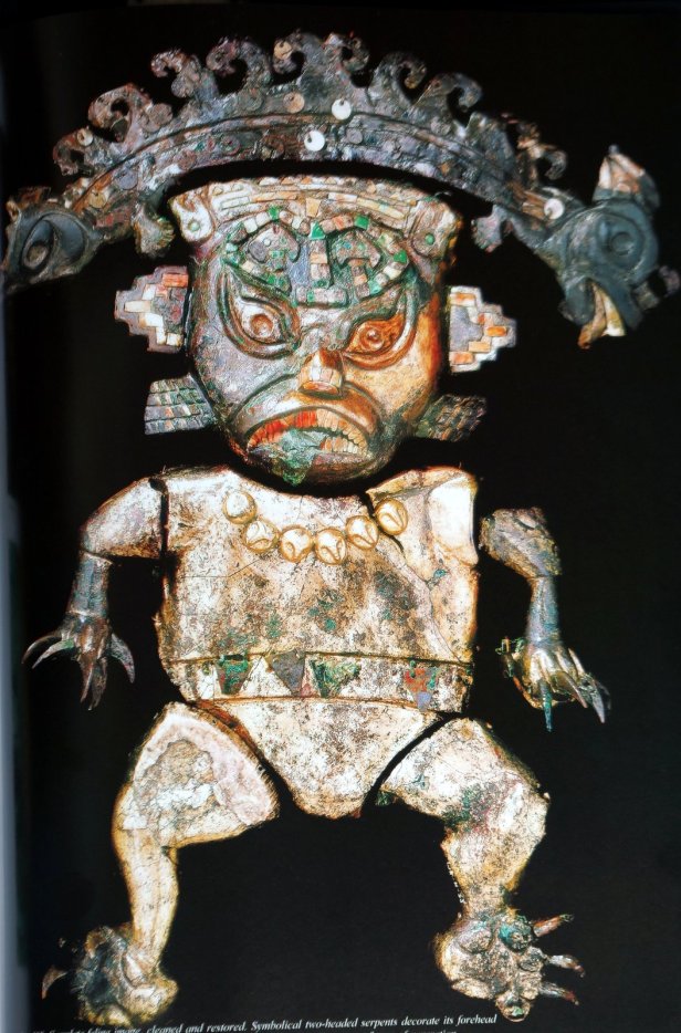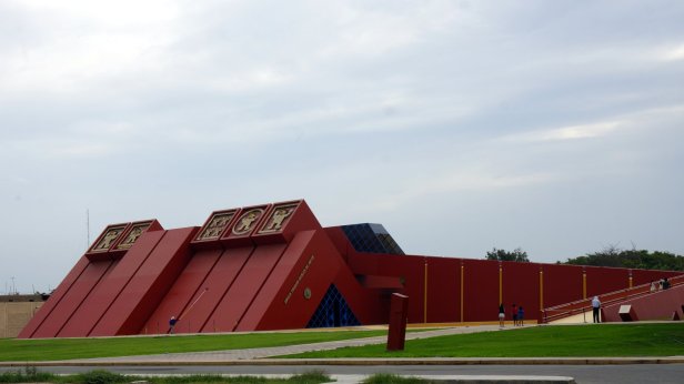 The next day we went to this fantastic museum (Museo Tumbas Reales de Sipan). The grave was first discovered by grave robbers but before they could damage too much, the site was taken over by the archaeologists and some of the stolen loot was recovered. In the burial plateau a total of 5 graves were found. The grave of the “Lord of Sipan was unopened. It was a real treasure chest. The Lord was buried together with several of his crowns, gold necklaces, earrings and clothes. The luxury is comparable with the grave of Toetanchamon in Egypt. During excavation, the layers of jewellery were removed one by one. All is now on display in this dedicated museum. I could not take any photo’s so the pictures below come from the guidebook.