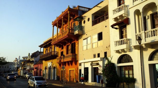 In Cartagena, we initially settled into a nice hostel where we could park the camper on the premise and the room had an air-con. There we hooked up with Harry and Marleen. They are a Dutch couple who we visited in Holland and left also for their second leg a month before us. We have kept infrequent contact via whatsapps along the way. In the evening we had together a lovely end of trip celebration meal on one of the many plaza’s in town. The following day we drove to the shipping agent to sign the papers and pay the local handling fee. For this we had to make a separate trip to the bank in the middle of town, driving through all the narrow streets full of tourists/shoppers. It is an advantage that the camper is small. Cars mostly park where they want to, so we did the same in front of the bank. The traffic police was not happy but still let me wait for Jamaliah’s return. In the evening we strolled back into the old city and after admiring the sunset in the bay, wandered through the streets and had 2 different local street snacks from one of the many street venders along the way.