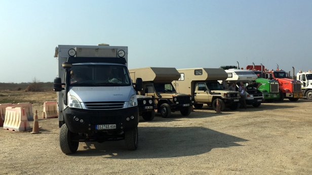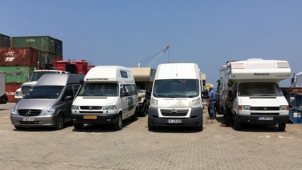 Saturday morning Rudy had to catch up with the camper convoy going to the harbour. Due to wrong coordinates he missed them at the shipping agents office by 10 min. The harbour is some 50 min away along the coast. Fortunately the roads through town were not as busy in the early morning. In the harbour the registration and checking of the campers is a slow manual process. We stood for hours next to our campers in the hot sun. Fortunately one of the “overlanders” had found a supply of cold water bags so we could keep ourselves hydrated. That we were with some 10 campers of course did not speed up the process. Most likely we all have to go back to the harbour on Tuesday when the customs/narcotics brigade checks the camper for drugs in your presence. You are not allowed to leave the country before they have cleared the camper.