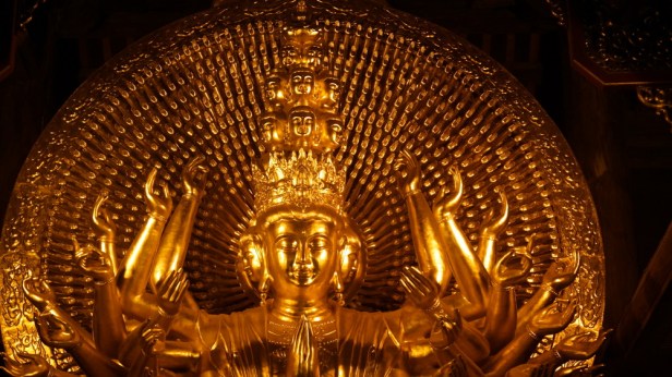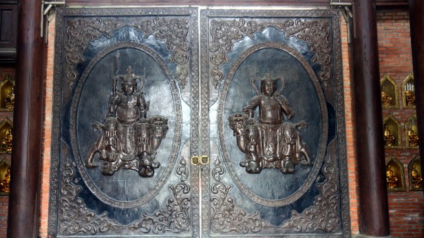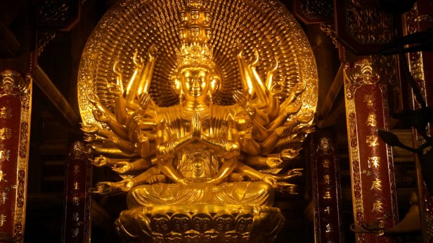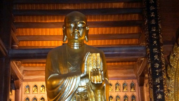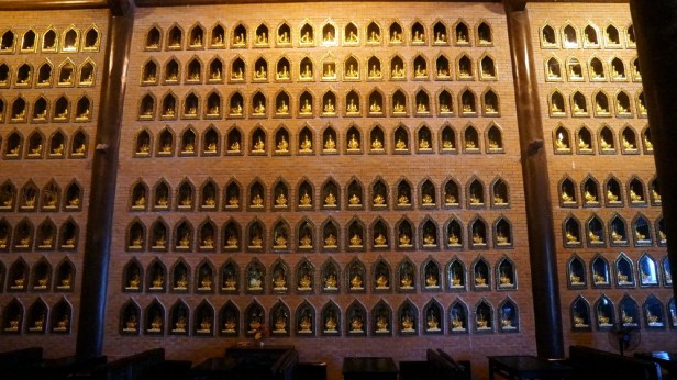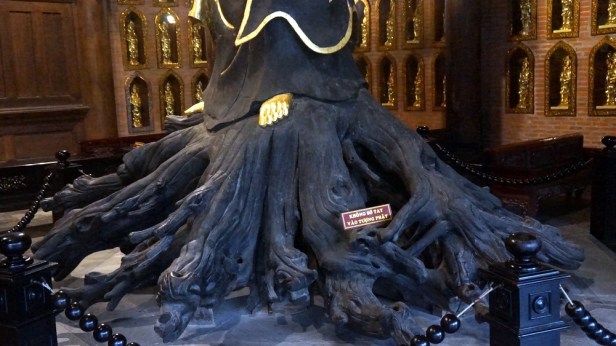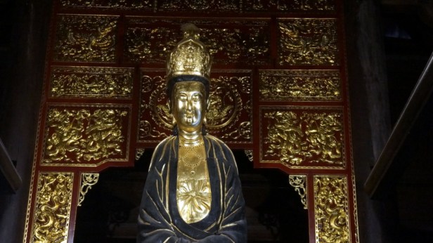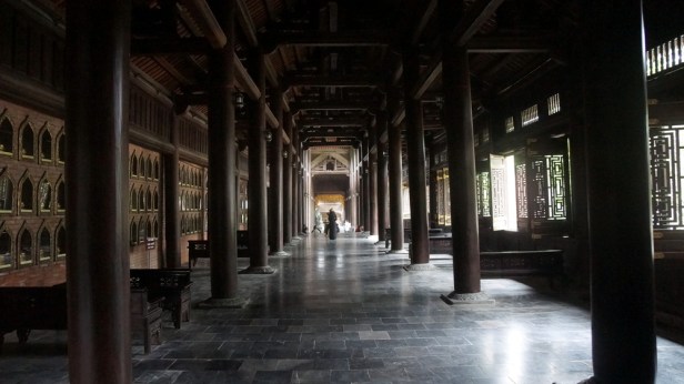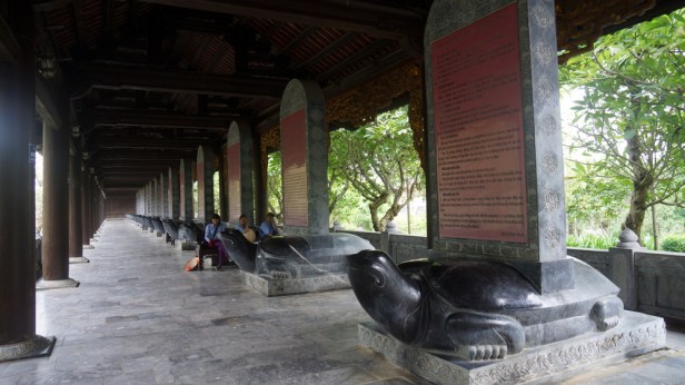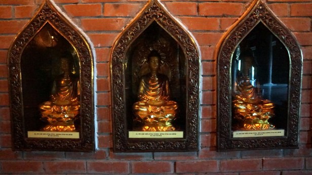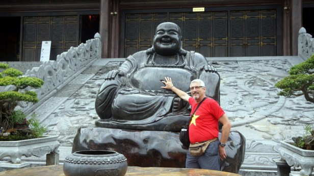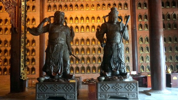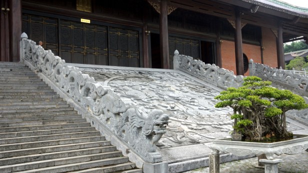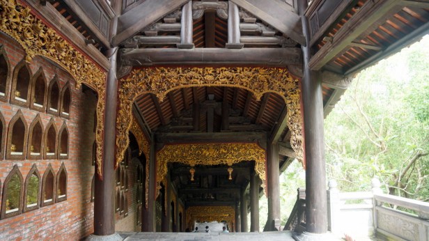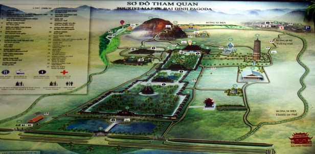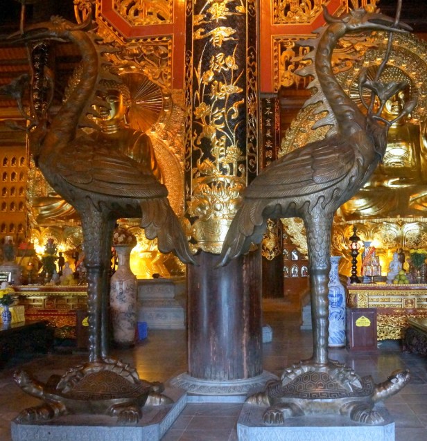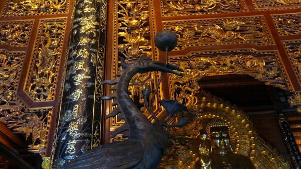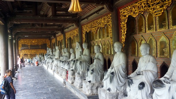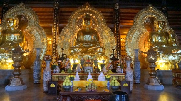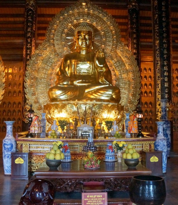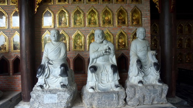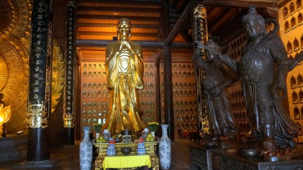 The Bai Dinh pagoda (2010) is the largest Buddhistic temple complex inVietnam. No expenses were spared. The 3 main halls are filled with gigantic golden statues. Next to them in the wall are hundreds of smaller statues with names of the donation givers. It feels a bit like the rich could buy some peace of mind here.