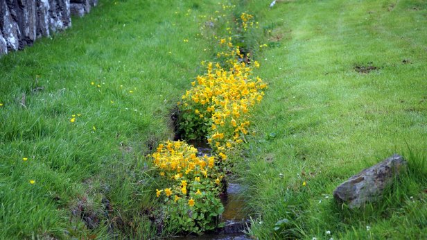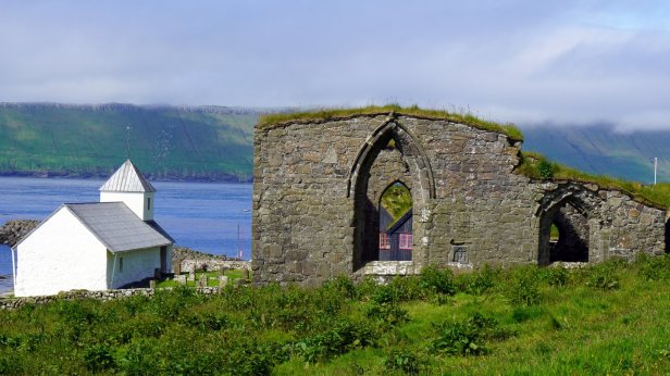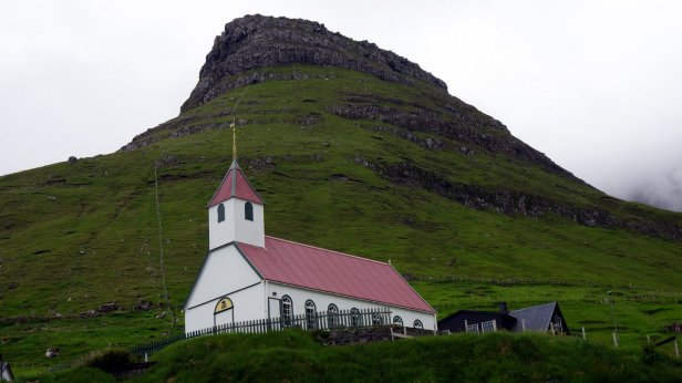 The next day we first drove over the mountain to the other side of the island. At Kirkjubour is the remains of a 13th century cathedral. It was abandoned when the Norwegian ruler converted to Luther. Since then, it fell in disrepair and only in the last 30 years was some restoration done. Maybe that is true for the whole archipelago. The roads are all surfaced and several of the islands are now connected with new tunnels. The tourist trade is blooming with corresponding prices. Logic because the season is short. In the fjords you see many fish farms. That must be one of the main exports.