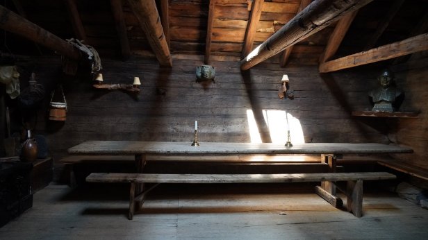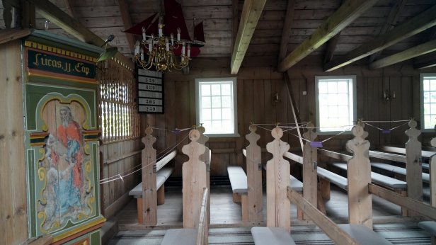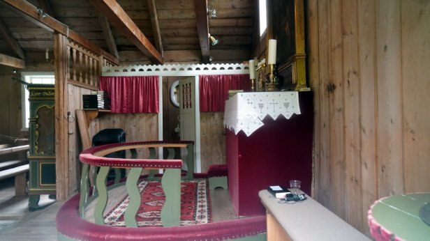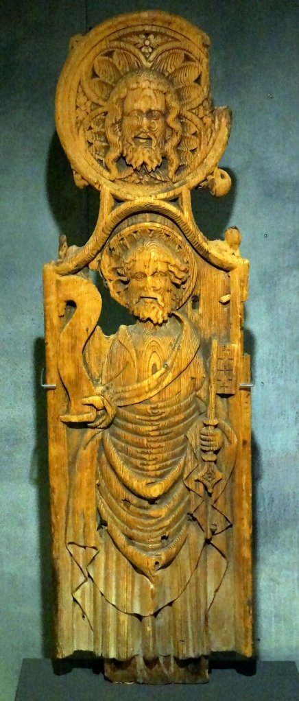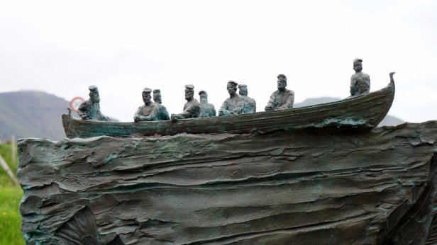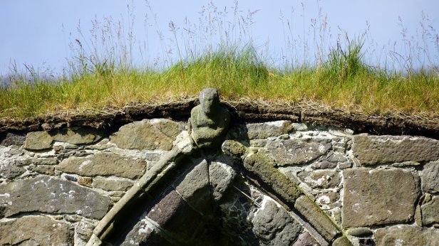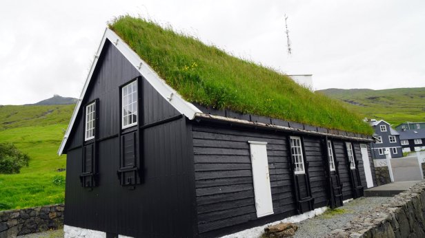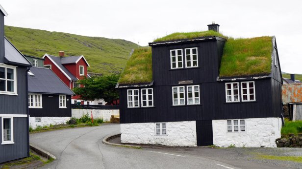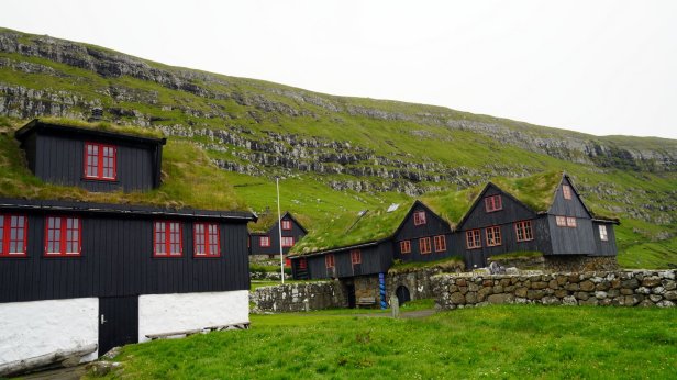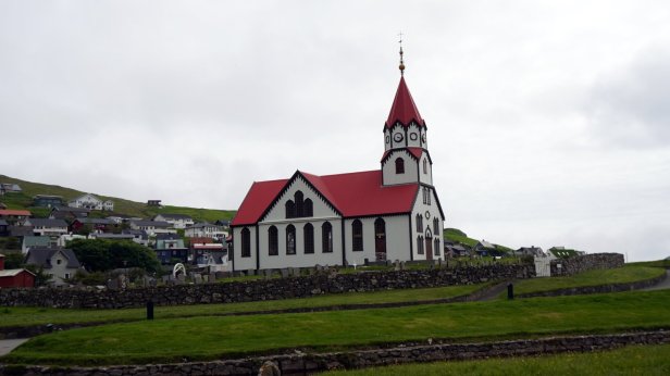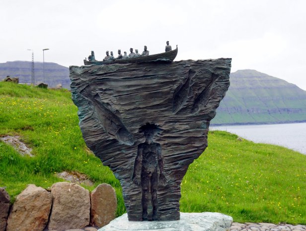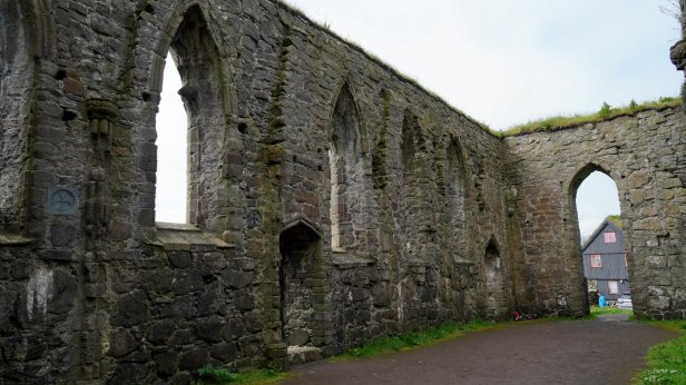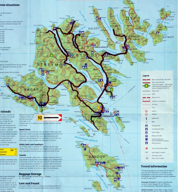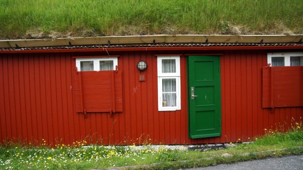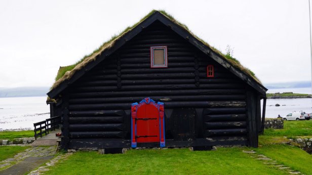 The next day we drove through the long tunnel with underground roundabout to the capital. It had started to rain. We took shelter in the national museum. Beside an explanation of the geological history of the islands and its human history. The collection of wood carvings taken from the cathedral we visited the day before were impressive. The outside section of the museum with some reconstructed house fell a bit is the water. We wandered a bit around town, had lunch and filled up on petrol before boarding the ferry to Iceland at 18:00 hrs.
