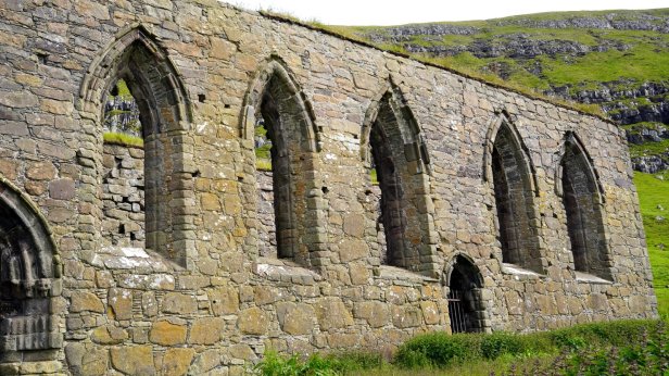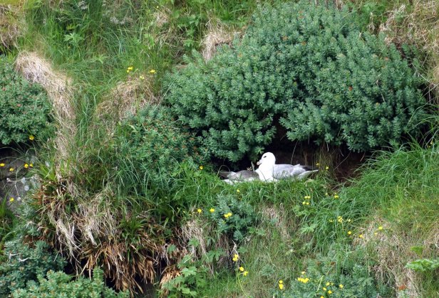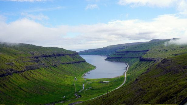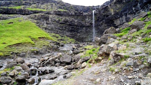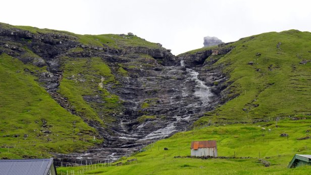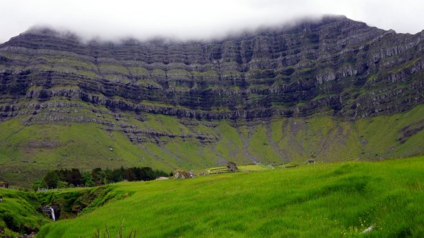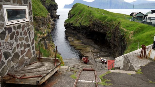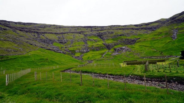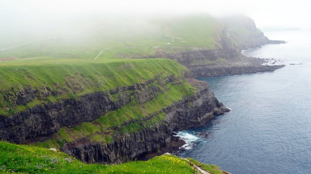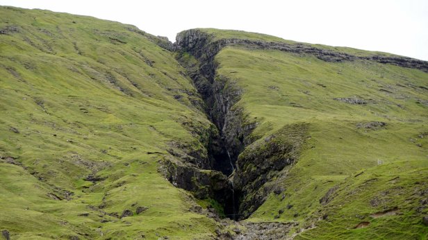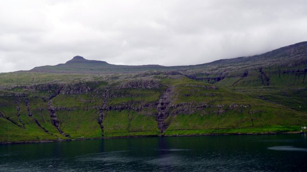 We drove through one of the new tunnels connecting Streymor island to Vagar island where the airport is. The road to the endpoint of the island is single lane. Left and right are small bypass pullouts where you pull in for oncoming traffic. In the narrow tunnel is the same system. Here however you hardly see the pullout in the light of the oncoming car. The country side you drive through is fjord-like. Green round hills/mountains with many scars from waterfalls. It was not raining so the few waterfalls are reduced to trickles. Along the steep seaside cliffs various seabirds have their nests. We saw various seagull type birds and only one puffin in the distance.