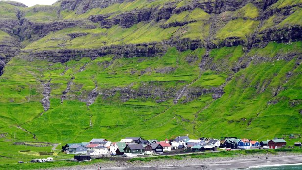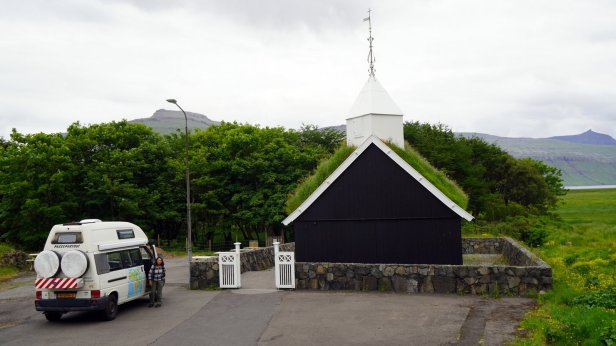 The next day we continued to drive on small roads over the mountains to small villages, where possible avoiding the large towns. Most villages are a starting point for a walk along the cliffs. These walks are well used. In the side of one of the cliffs we spotted a colony of puffins with their coloured beaks. At the end of the afternoon we drove to the south point of Eysturoy to stay at a small camping with the camper facing a calm sea.