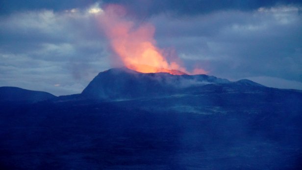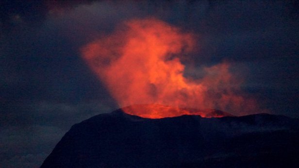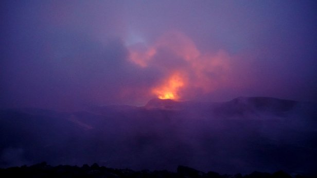 At 24:00 Jamaliah woke me up and said that there was a glow above the volcano. We had seen this before but were too tired to react. This time we got up in the middle of the night and drove to the parking lot near the volcano. It was dark, windy and wet. Only a few cars were at the parking lot. We started our walk along a road we thought would lead up the mountain. We met a few people coming down. They said there was not much to see because of the mist. We decided to carry on. At one point we saw a sign stating that the road is closed. Fortunately a group of 3 young American men came by and had walked up the mountain before following this road/path. We tagged on. At one point the steep road is freshly made (slippery) and has many switchbacks going up. In the end some form of path takes you up to the hilltop. The slope is made of volcanic rocks covered with moss. Some of the moss is luminescent which gives you some guidance in the light of your headlamp. On the top you felt the cold wind. The rain had fortunately stopped. We stumbled over the hill in the direction of the volcano. Suddenly it cleared and we could see the orange reflection of the hot magma in the volcano against the clouds. We settled down on the mountain slope to watch the colour display of the volcano in the distance hoping that it would also start erupting lava. We stayed there till 3:30am. Several times the mountain become visible in-between the mist. It was a fascinating scene. The mist came from the cooling lava below where we had walked close to several days ago. Due to the rain and the hot rock, clouds of mist drifted up the valley. It became clear that there would be no mayor fireworks today so we stumbled down the mountain again. Fortunately the mist was gone and daylight started. We made it back down without incident. At 5:00am we were back at the campsite and went to sleep again. A great experience richer.