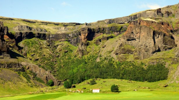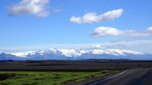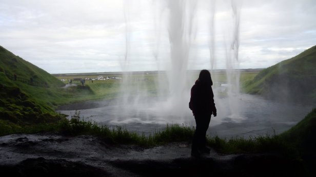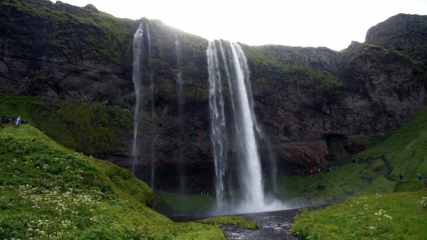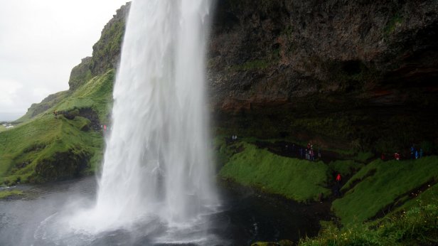 Along the southern coast of Iceland the glaciers covered volcano’s are much closer to the sea and therefore sometimes the coast is very narrow with high mountains/cliffs to the side or broad gravel plains (sandur) formed by the runoff smelt water from the many glacier tongues which slide down the mountain side. Before we left the campsite, we walked towards the largest of the 3 waterfalls dropping off the cliff. The tourist had started to arrive so it was busy on the stairs and slippery walkway behind the waterfall.