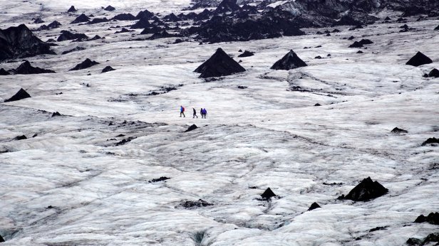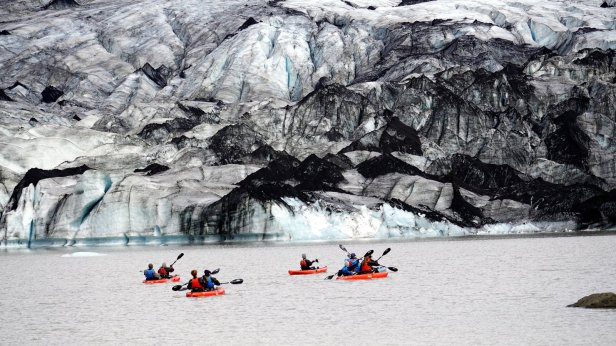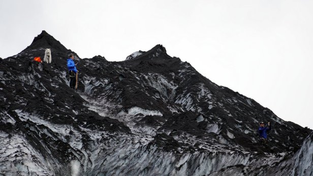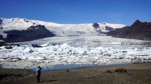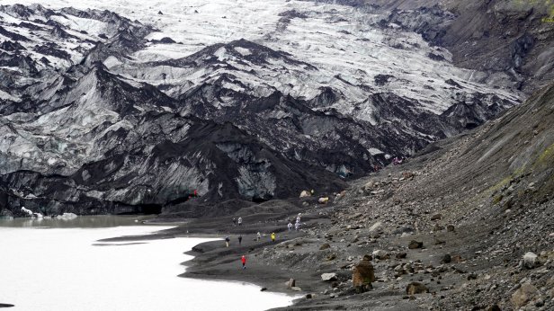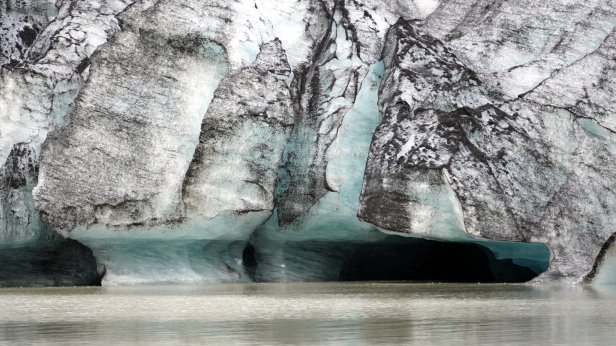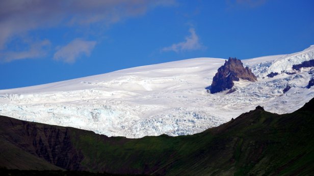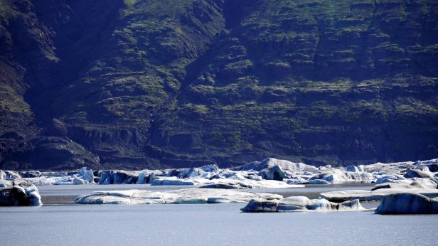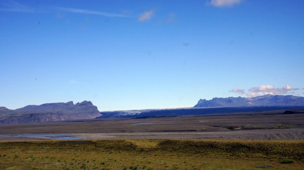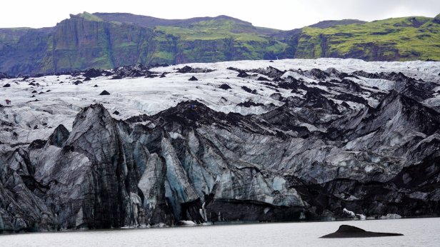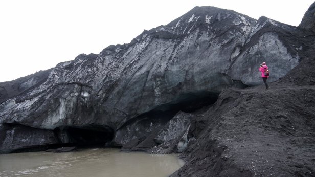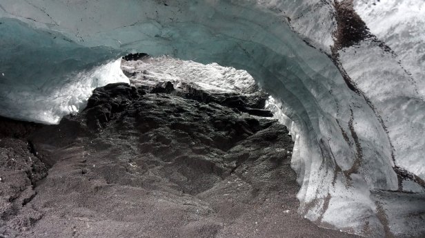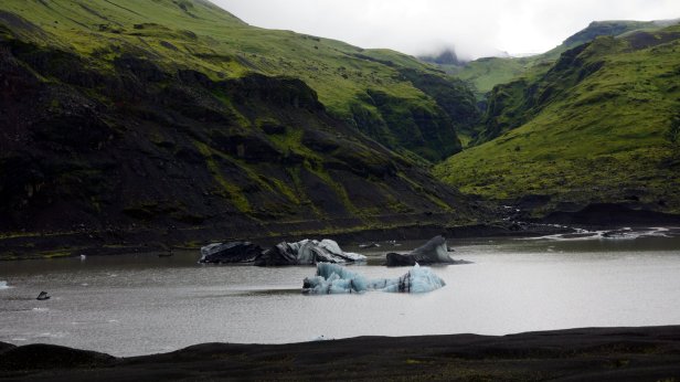 Instead, we drove further along the coast. Some 4 km later was the first of several glaciers we visited. At the Solheimajokull glacier we could walk all the way up to the ice. At the bottom there are some small ice caves and on the lagoon in front of the ice cliff are floating blocks of ice. You could book a canoe tour in-between these blocks or a glacier walk and even a ice climbing trip. But we stuck to just walking and taking photo’s.