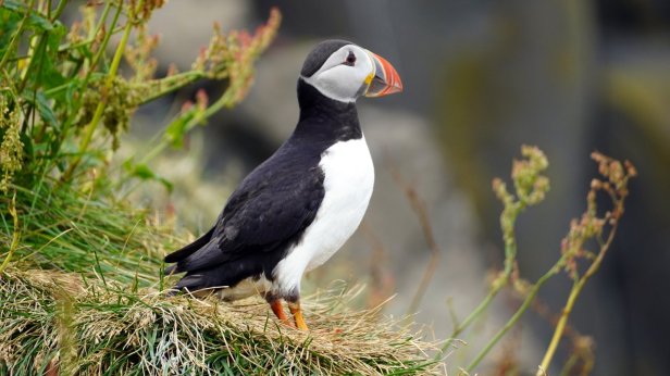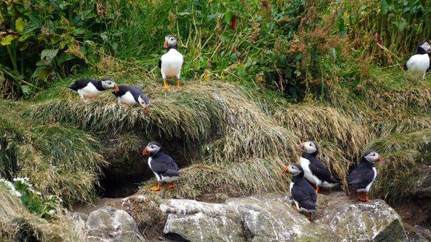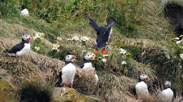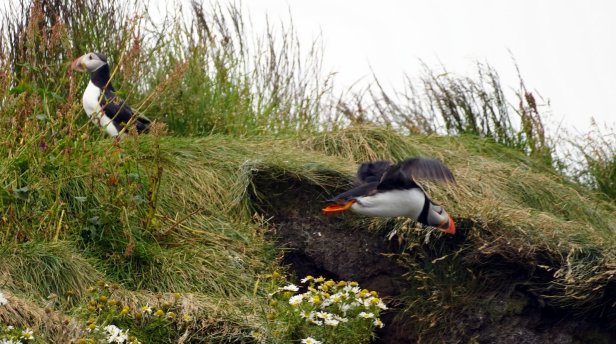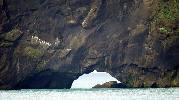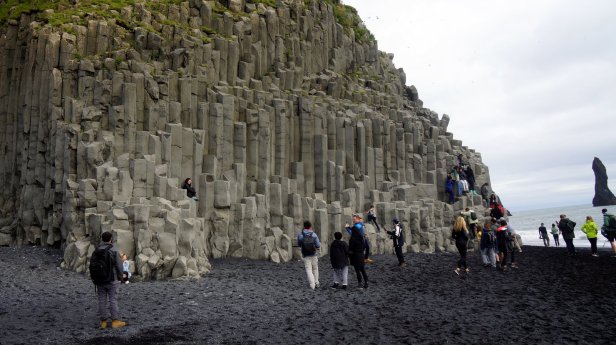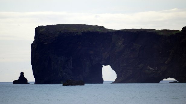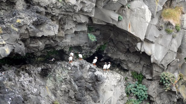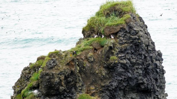 The town of Vik is some further 30 km along the southern shores. Before the town, there are two turnoffs towards bird cliffs. In the sea there are some large rocks sticking out of the water. Several of them are home to different seabird species. We are lucky to see on several cliffs large puffin colonies. It looked like all the young birds had grown up and are practicing flying. There was a steady flow of incoming and outgoing birds. Very difficult to photograph.