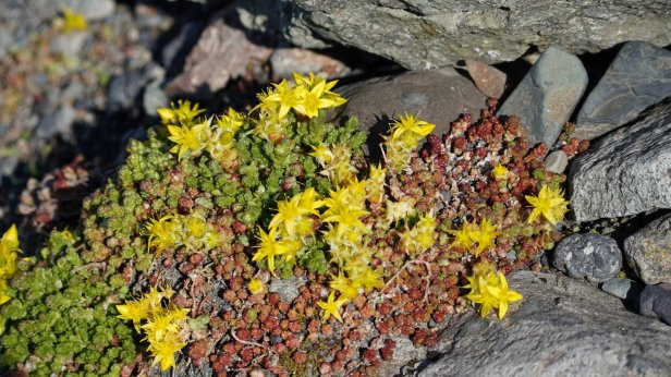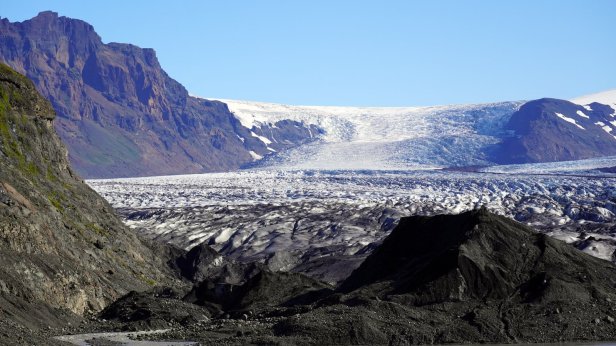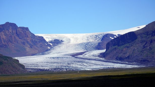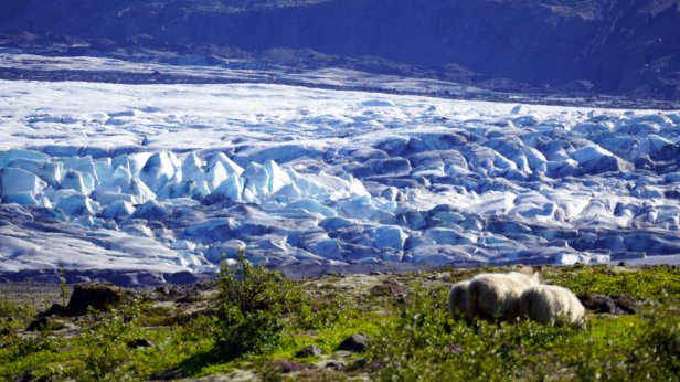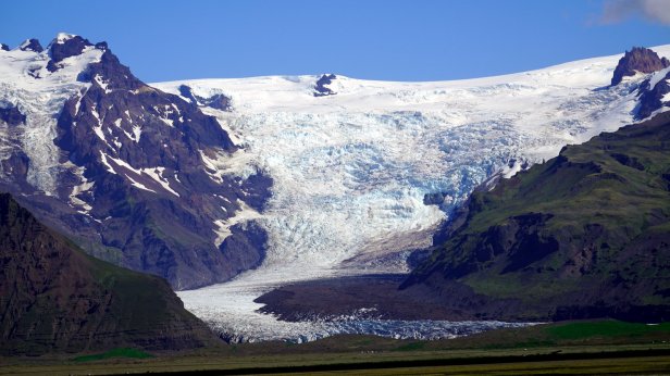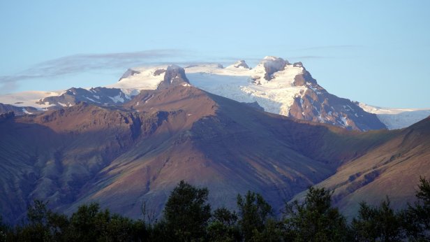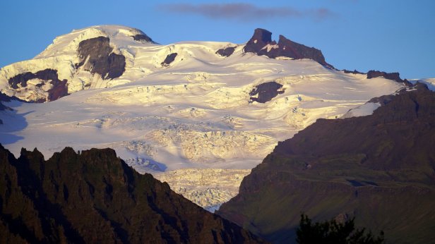 We drove further over Rt 1 (the main 2 lanes road circumventing the whole island with often 1 lane bridges) and crossing the large “sandur” plain towards the largest glacier complex of the island: Vatnajokull in the Skaftafell National park. You could see the mountains very clearly coming towards you. At one point we saw a large reasonably recent dark lava stream “flowing” out of the mountains. This stream had laid the good farmland and farm buildings which existed here to waste. We arrived early at the Skaftafell campground and relaxed in the sun. Later in the afternoon we walked up a nearby hill towards yet another waterfall. On returning to our bus, we saw the Dutch VW camper group arriving and had a few drinks with our friends. The sun is setting earlier and earlier now. This changes rapid at this latitude. Rudy was just in time to catch the last sunrays lighting up the glaciers on the mountain side.