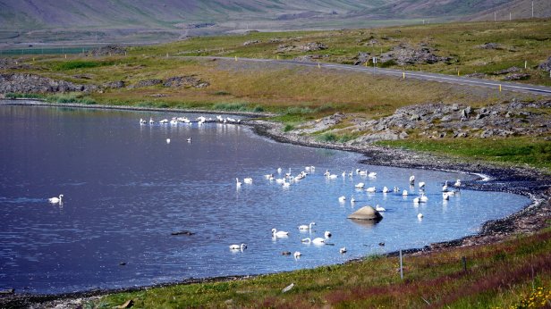 The east coast also has many fjords which cut into the island. From our camping (Stokksnes) near Hofn towards the ferry at Seydisfjordur we followed the coast line and as such followed the fjords inland. Fortunately there are not as many deep inland cuts as in the west fjord land. The days were sunny but there was still a heavy fog drifting in from the coast. At one point it was clear and we stopped to see the large flocks of swans which had settled on the lagoon. This lagoon is created by a ridge of stones dumped in front of the coast by the nearby glacier. It is filled up with glacier water on one side and most likely seawater on the ocean side. An ideal place for migrating birds. You had a beautiful view when the drifting fog stayed out on the ocean. We wanted to set up camp at the last fjord before the ferry point. Unfortunately when we made it into the town, the fog had caught up with us. The town before (Eskifjordur) was however still sunny so we turned back and camped there instead. It is the only campsite on our trip that had several large trees and as such was a welcome reminder of continental Europe. Moreover there is a waterfall nearby. A farewell gift from Iceland and as bonus, the campsite was almost empty. Only 2 trekkers with a tent and us.