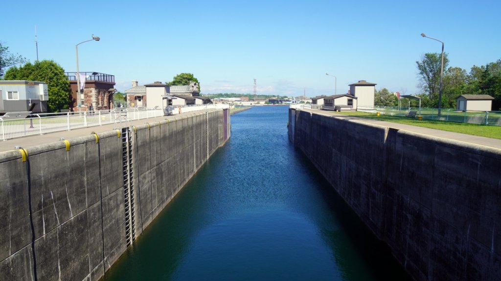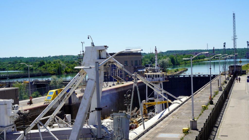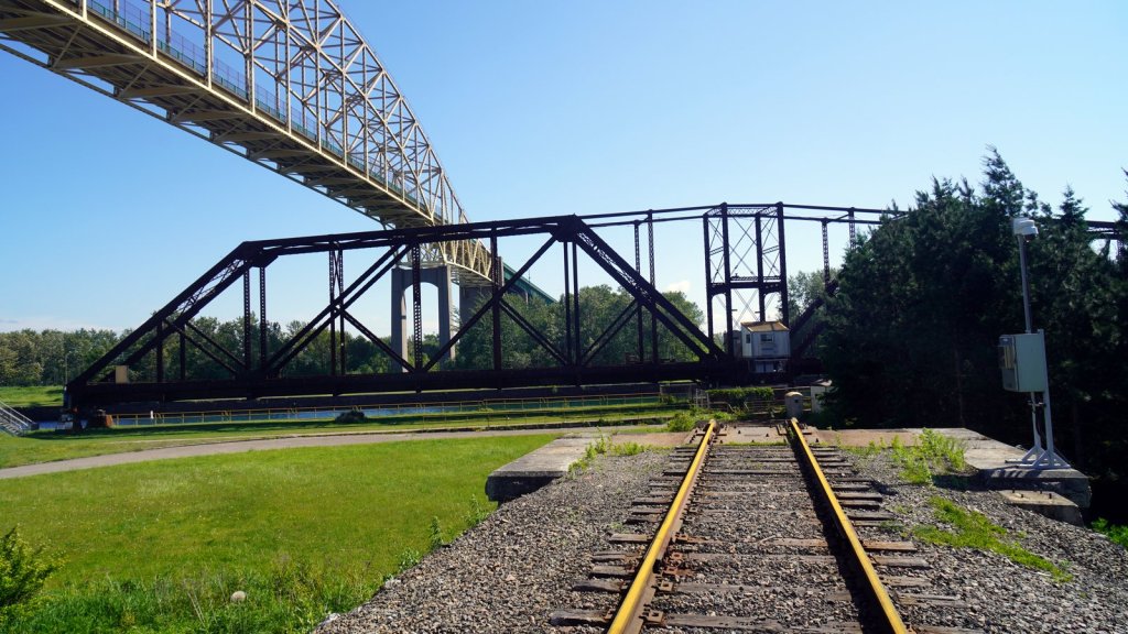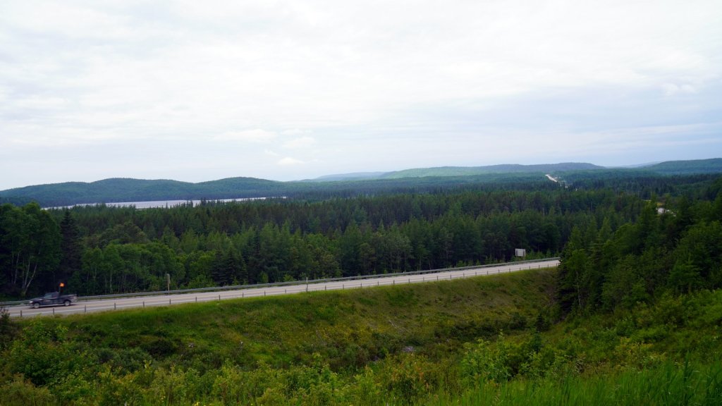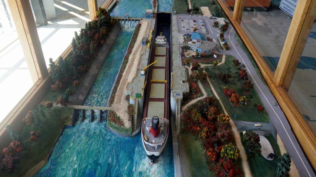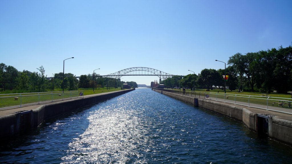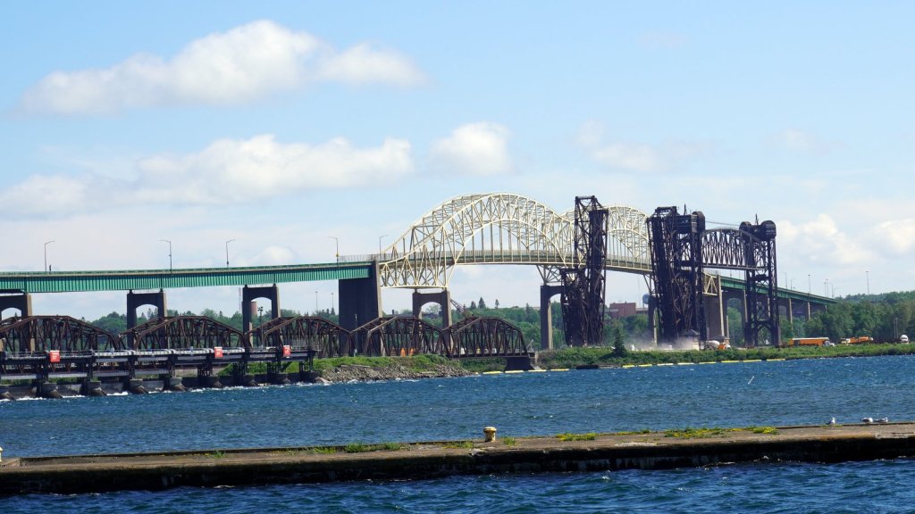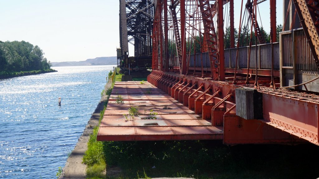 For the next 2 days we drove 360 – 480 km per day. First along Lake Huron to Sault Sante. Marie where we had a look at the 1.1 km canal connecting Lake Huron to the 20 m (?) higher Lake Superior. It was built in 1895 and at that time had the world’s longest lock. Next to the lock there is a rusting turning railway bridge and a swing dam which was used to close off the canal in case of emergency. It was put to use in 1909 and is now also rusting away. The canal is replaced by a much larger one on the American side of the water. From the end of the canal you see the iron works across the bay. They are still in Canada.
