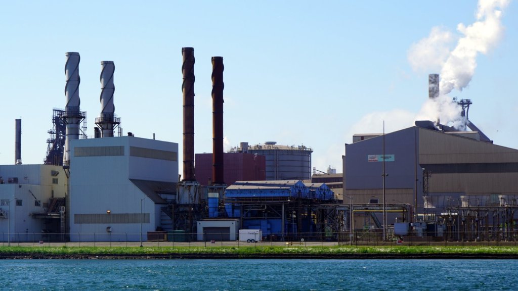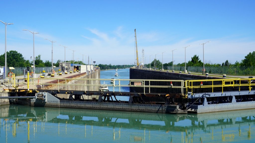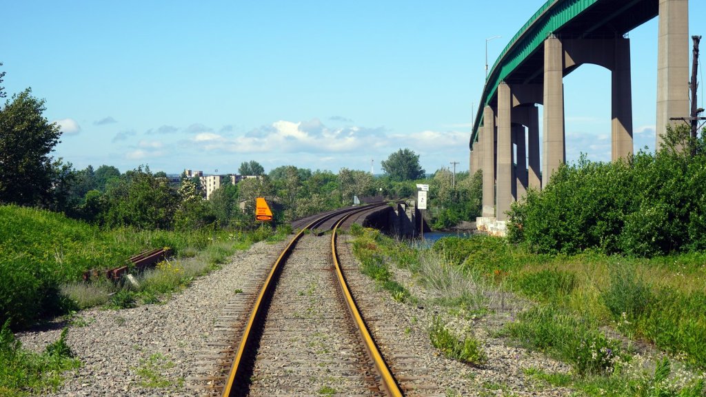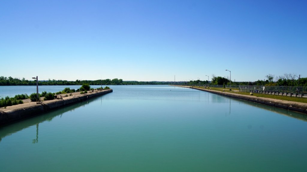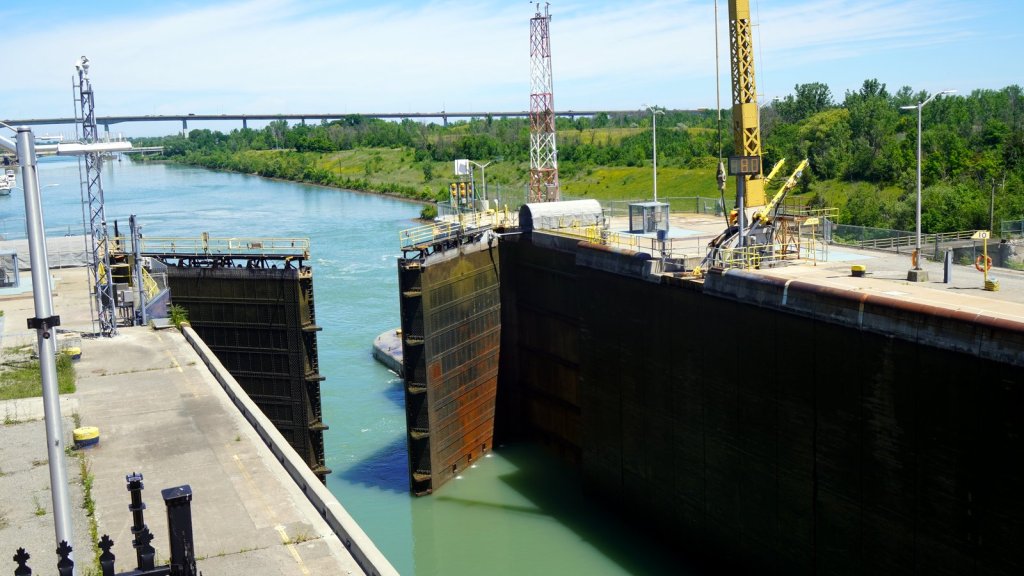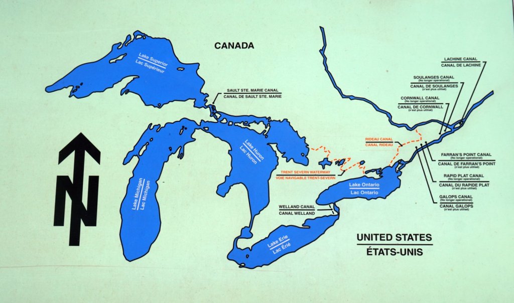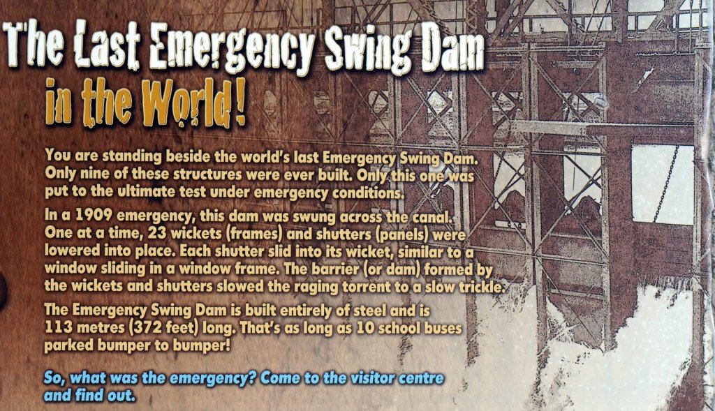 For the next 2 days we drove 360 – 480 km per day. First along Lake Huron to Sault Sante. Marie where we had a look at the 1.1 km canal connecting Lake Huron to the 20 m (?) higher Lake Superior. It was built in 1895 and at that time had the world’s longest lock. Next to the lock there is a rusting turning railway bridge and a swing dam which was used to close off the canal in case of emergency. It was put to use in 1909 and is now also rusting away. The canal is replaced by a much larger one on the American side of the water. From the end of the canal you see the iron works across the bay. They are still in Canada.
