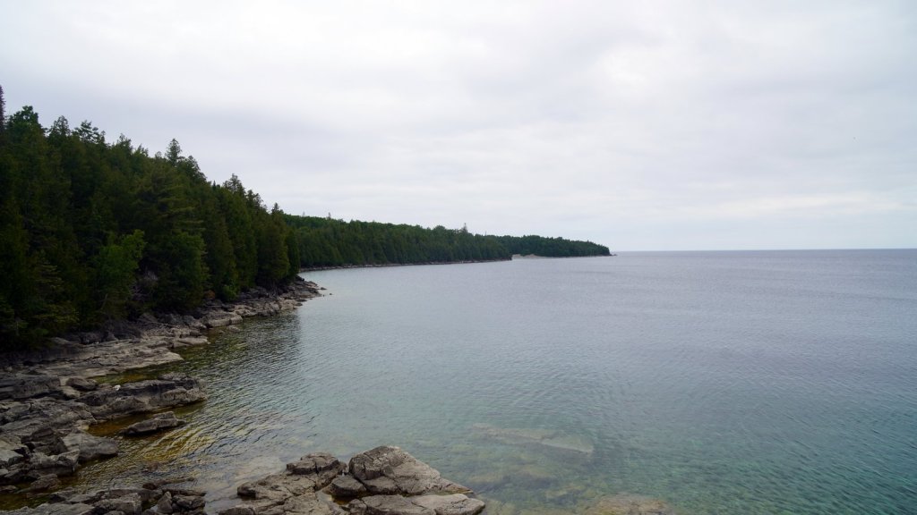 The first stop we made was at the Wellands canal. The first canal was built in 1833. It was built to circumvent the Niagara river with its large waterfalls and make it possible for Detroit to be connected to the Ocean. The canal was expanded 3 times. The last one with only 8 enormous locks to handle the 100 m height difference between lake Ontario and Lake Erie was completed in 1933. We drove the full length of the 45 m long canal and were lucky to see a large cement carrier navigating through one of the locks. It was a tight fit. We drove a bit along the lovely coastline of Lake Erie and then turned inland and zigzagged North on our way to the Bruce peninsula. It has been sunny and warm these last few days. At the top of the peninsula at Tobermory, we took a car ferry across the Georgian bay of Lake Huron. It took us several attempts to book the ferry. All crossings were fully booked on the website till Sunday evening (in 2 days time). In the end we decided to reserved that crossing. Along the way it was difficult to find a wild camping spot. Every time you saw a small path leading off the main road it ended up at somebody’s house. There is very little common land anymore. One night we stayed at a secluded cul-de-sac at the end of a lakefront suburb and the other time we stayed in a paid camping as it was time for a shower. In Tobermory, at the end of Bruce peninsula, we visited the National park. They have walks through the conifer forest. Unfortunately the original forest were logged up till 1903 but at this section there is a lot of re-growth. The rest of the afternoon was spent wandering the streets of this touristic town and tasting local snack like beavertail pastry (delicious). One of the main attractions is sailing with a glass bottom boat over several of the wrecks which lay in the bay. Some of them are as shallow as 7 m and clearly visible.