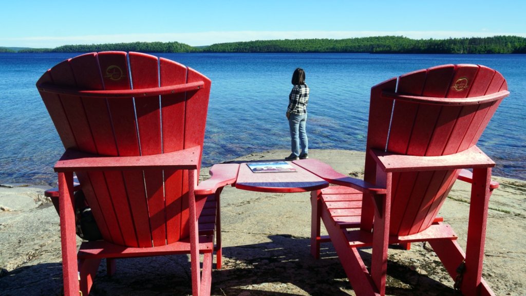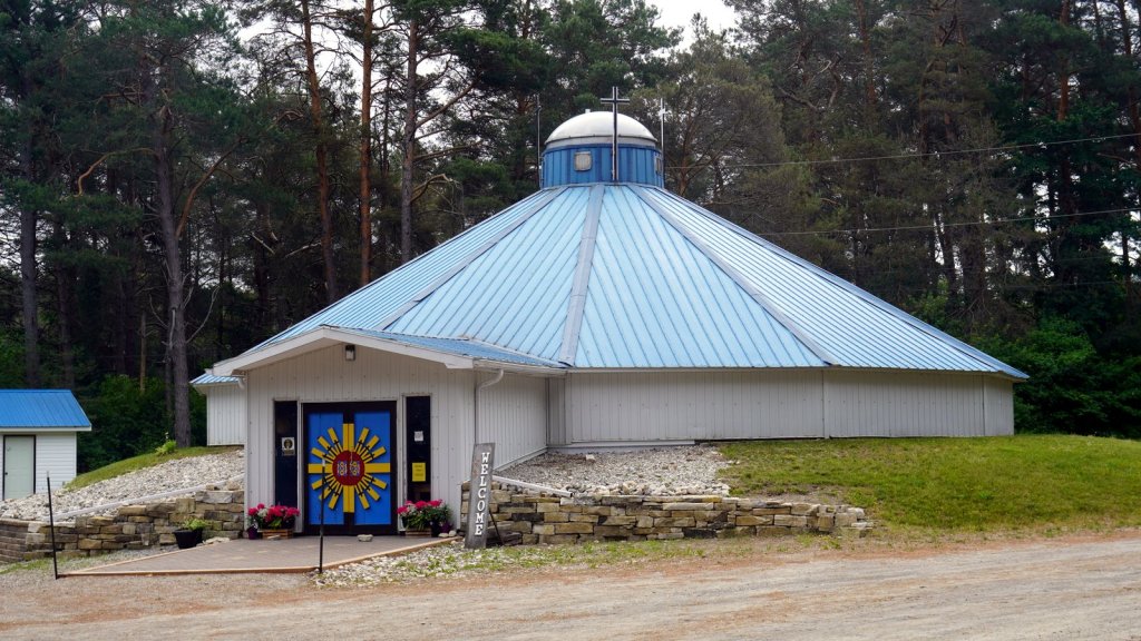 At 17:30 we took the 2 hr ferry to Manitoulin Island and drove across the wooded island to an iOverlander camping spot on the other side. The island has great vista’s looking down towards the lakes in-between the forests. Before leaving the island the next day, we made a stop at a First Nations community centre. They had a handicraft exhibition but unfortunately the items were not for sale. Across the road is a round native catholic church which should have had nice wood carvings. It was closed so we didn’t see them.
