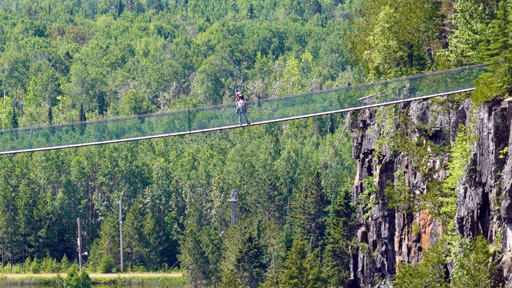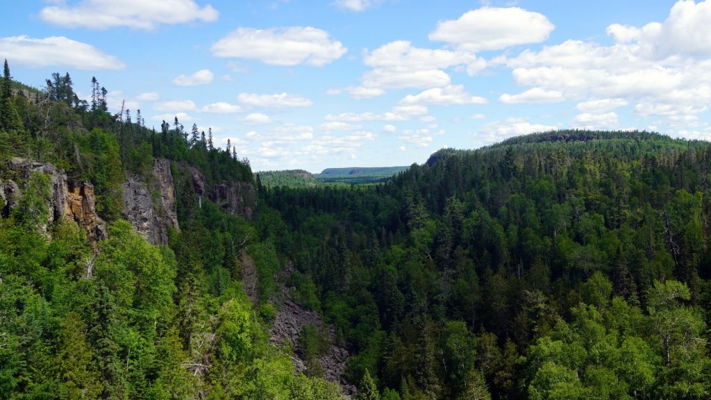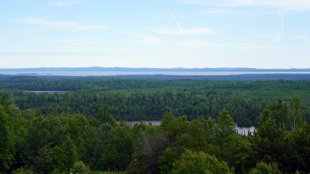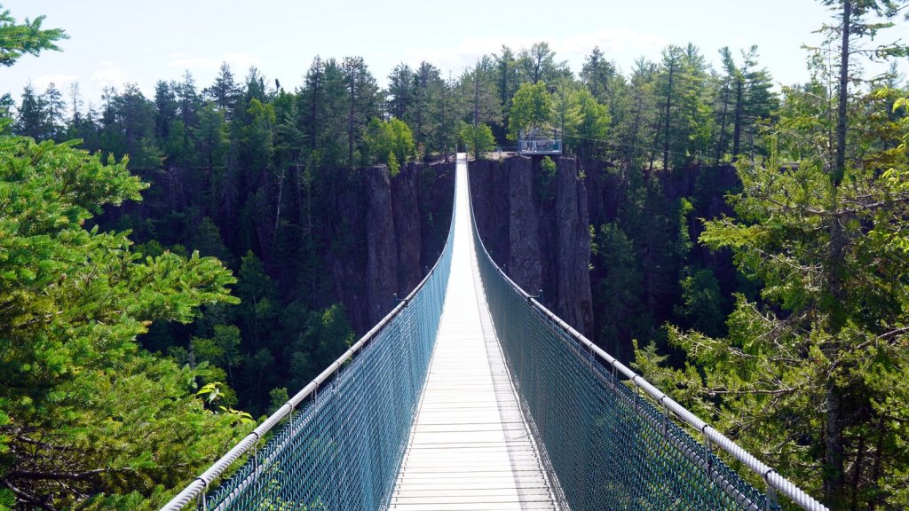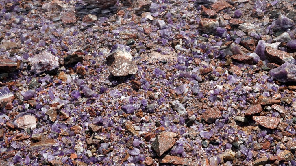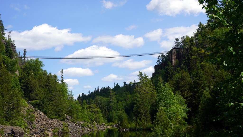Still following Hwy 17 along Lake Superior, we came to a deep gorge with a high swing bridge and a zip line. Actually there are 2 swing bridges that you could crosses while making a circular walk through the forest along the edge of the gorge. The view down the gorge and into the distance showed how unspoilt a country Canada is. However there were so many mosquitoes. Horrible. A bit further down the road the situation is a bit different. Here there is more farm land and more farms and farm roads. One road led to a small privately owned Amethyst mine panorama. The amethyst is blasted free from the quartz vein down to some 30 m. The nice big pieces are sold and converted into little statues and jewellery. The leftovers are dumped on a heap and for $4 per pound you could search for your own interesting piece. The lady was a bit disappointed when we only took half a pound worth of amethyst. The blue/purple colour of the stone heap which was sprayed with water is a nice sight.