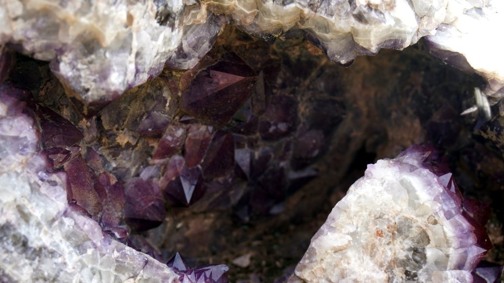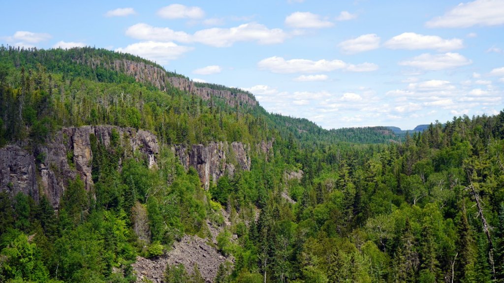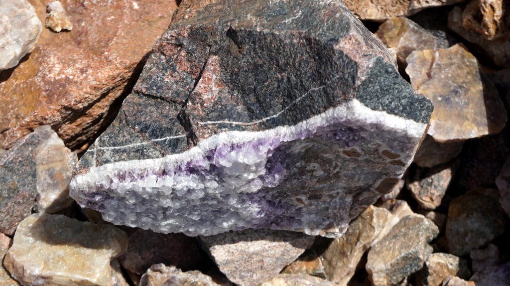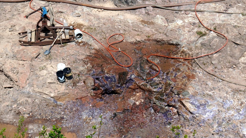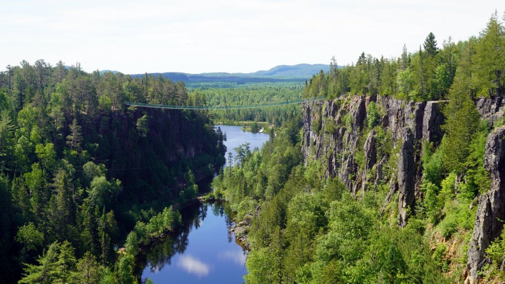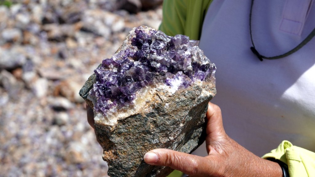 Still following Hwy 17 along Lake Superior, we came to a deep gorge with a high swing bridge and a zip line. Actually there are 2 swing bridges that you could crosses while making a circular walk through the forest along the edge of the gorge. The view down the gorge and into the distance showed how unspoilt a country Canada is. However there were so many mosquitoes. Horrible. A bit further down the road the situation is a bit different. Here there is more farm land and more farms and farm roads. One road led to a small privately owned Amethyst mine panorama. The amethyst is blasted free from the quartz vein down to some 30 m. The nice big pieces are sold and converted into little statues and jewellery. The leftovers are dumped on a heap and for $4 per pound you could search for your own interesting piece. The lady was a bit disappointed when we only took half a pound worth of amethyst. The blue/purple colour of the stone heap which was sprayed with water is a nice sight.