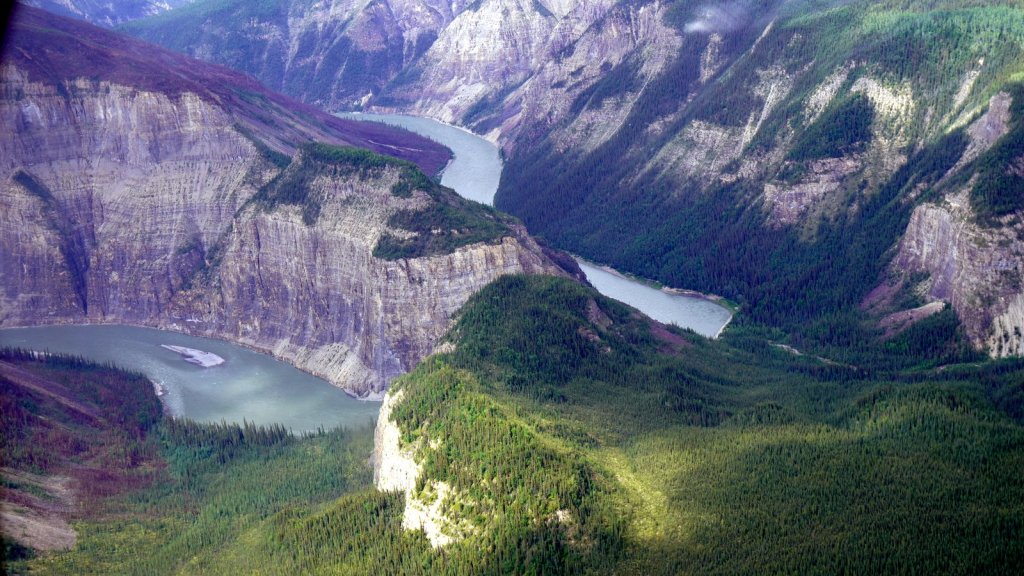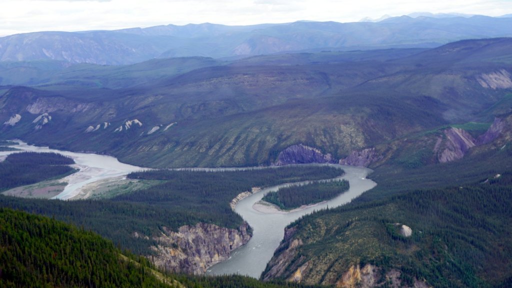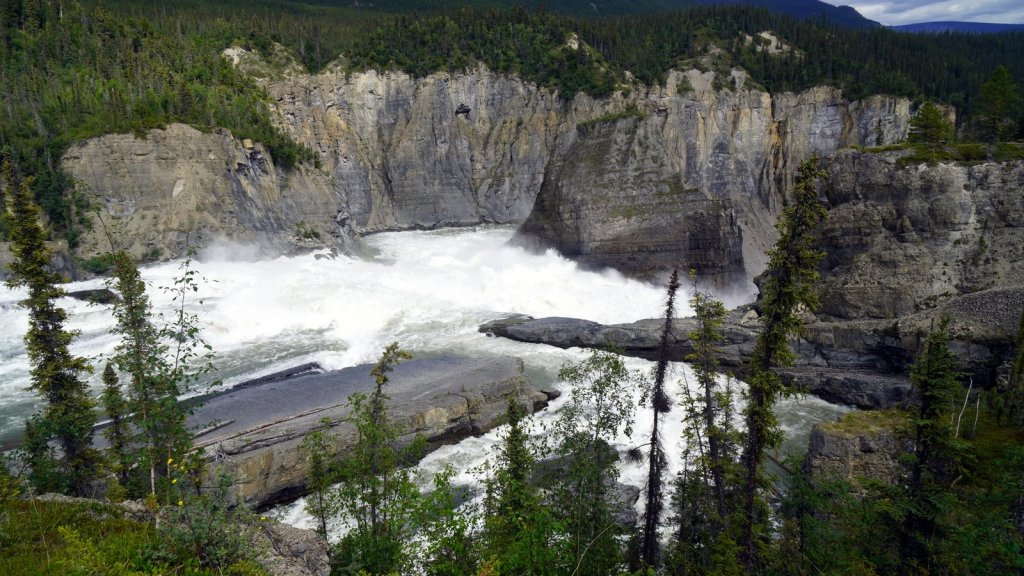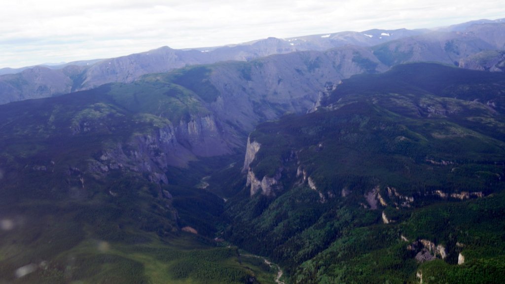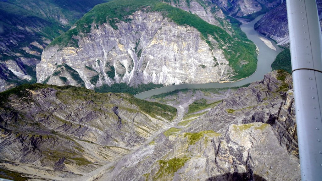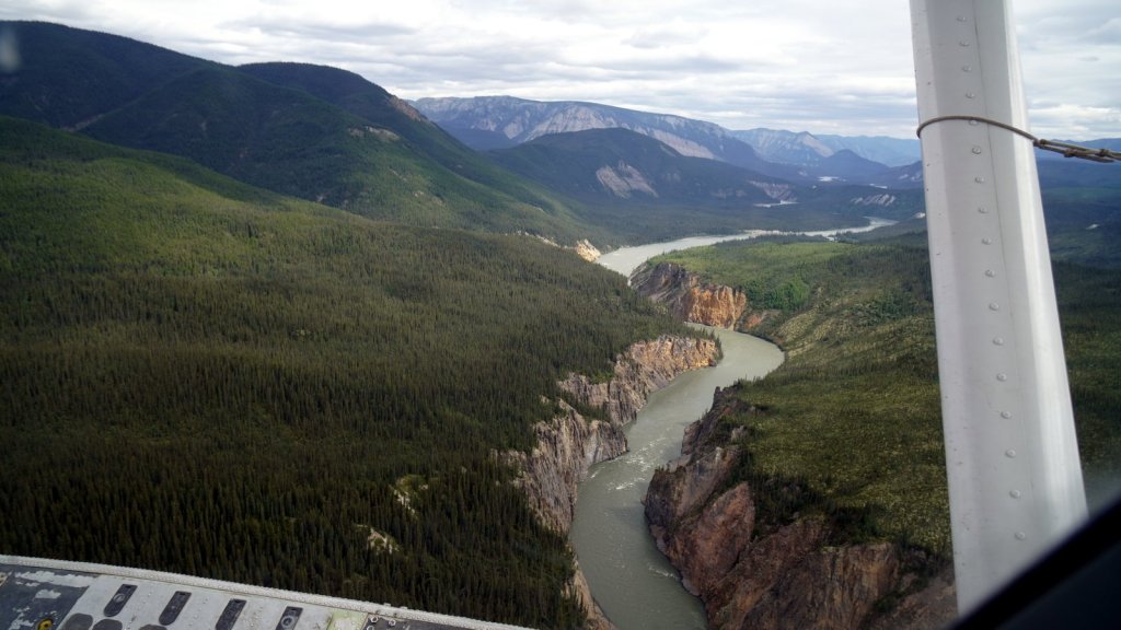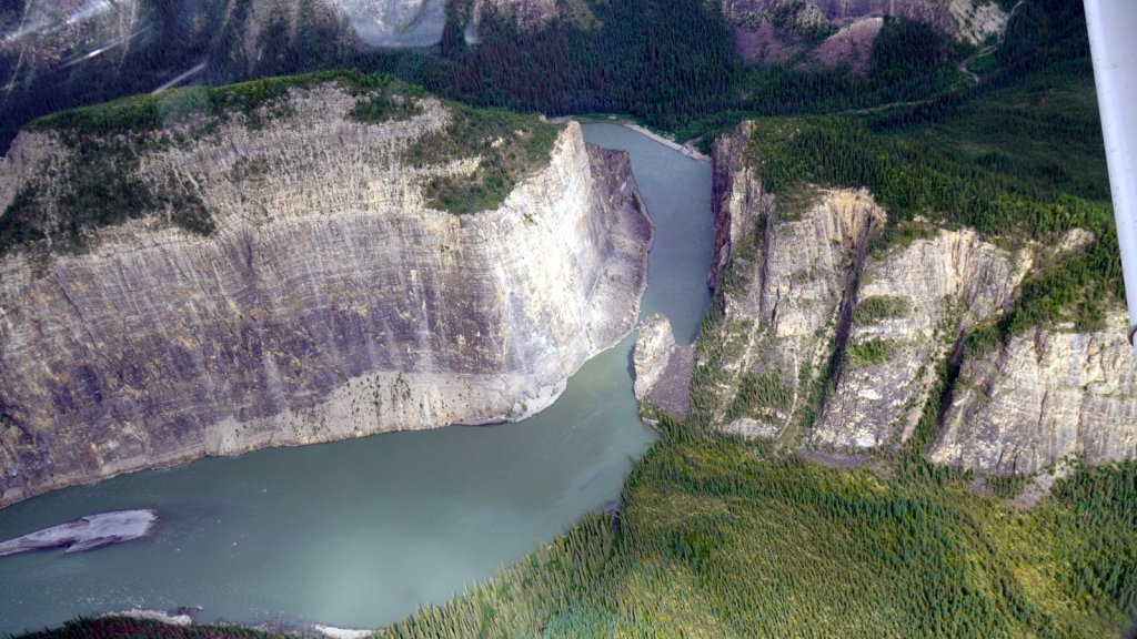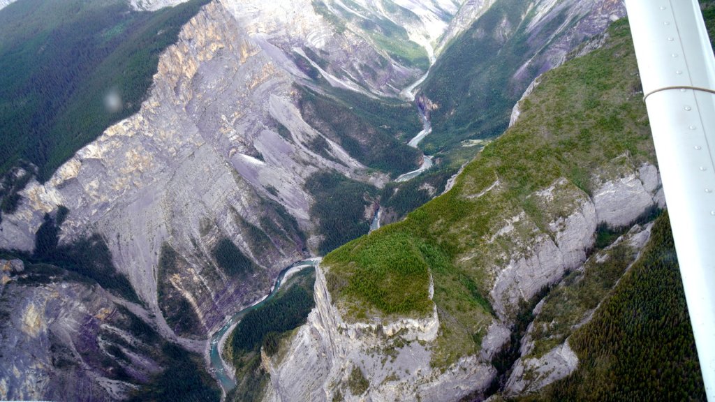 The flight on Sunday was delayed till 14:00 hrs. We shared the small floatplane with a German couple who are doing a 6 months Canada trip followed by a 6 months USA trip. They have one of these large converted trucks. Rudy sat in the front of the plane and had an excellent view. The first 30 – 45 min was over the forested lowlands towards the mountains. In the landscape you could still see the seismic lines which were made in the sixties. For the rest it is forest with large open patches and lakes. We slowly climbed up to 5000 ft to fly over and into the mountain range, which make up the National Park. The park is one of the world’s first Unesco Natural heritage sites (est. 1976). It is well known for its 10 – 30 day canoe/rafting trips out to the Liard river. The slots are booked well in advance so no chance for us to join one, even if we wanted to. The beautiful flight in and out and the 2 landings, one at the 94 m high Virginia falls and the other at a set of cabins on the Little Doctor lake, were however impressive enough. The pictures will tell the story.