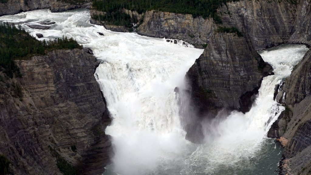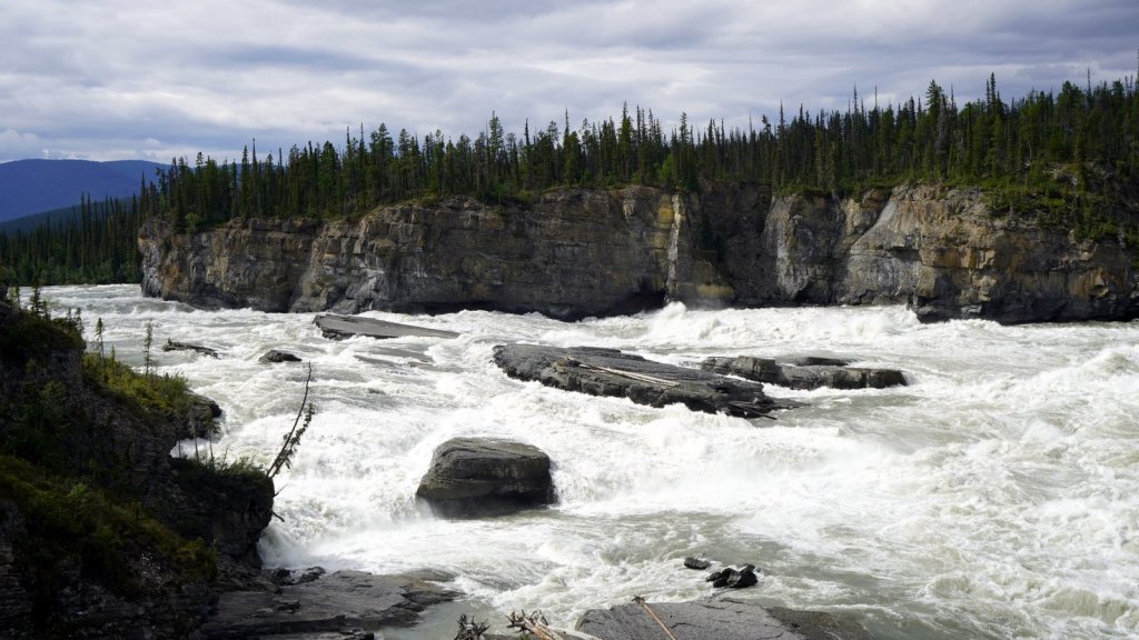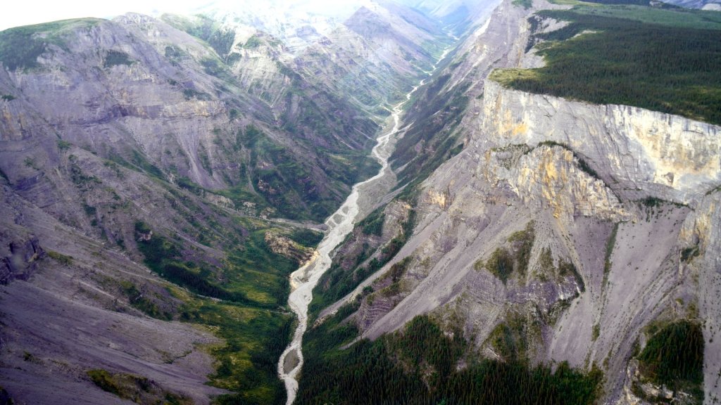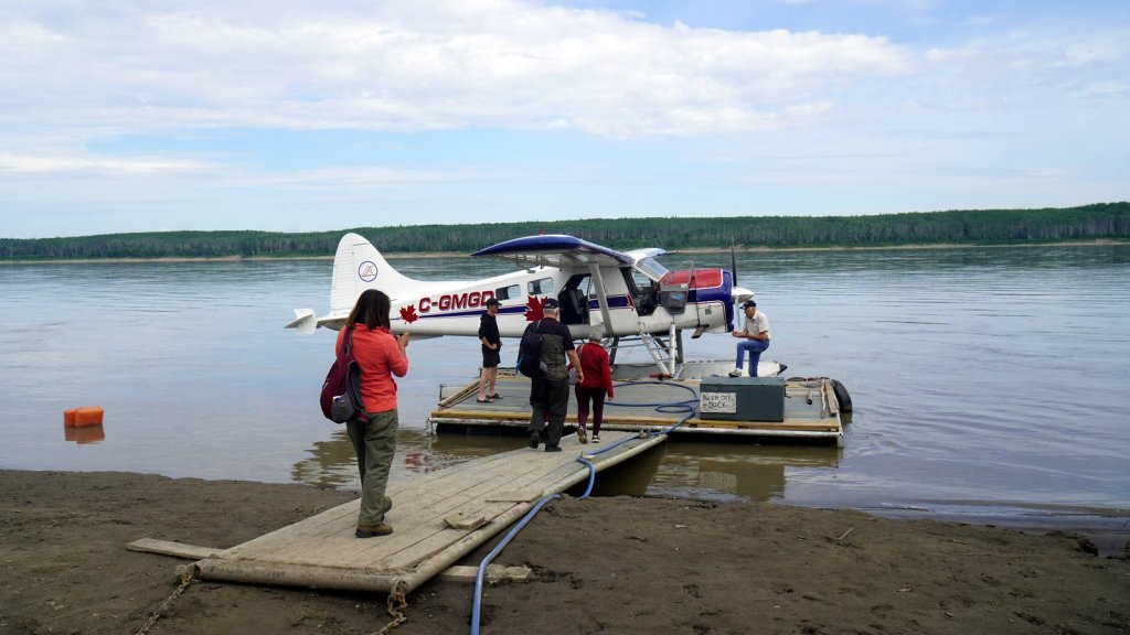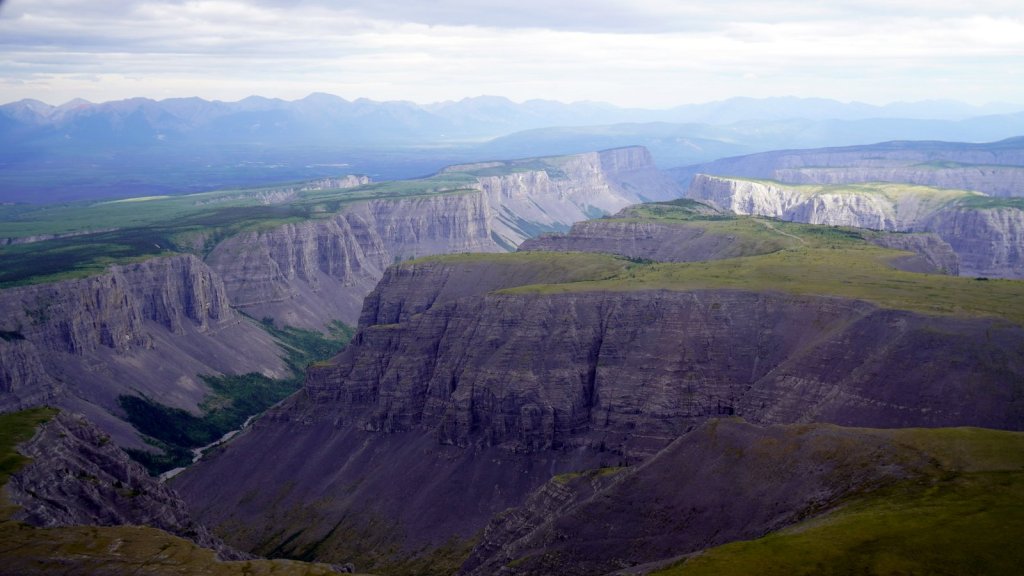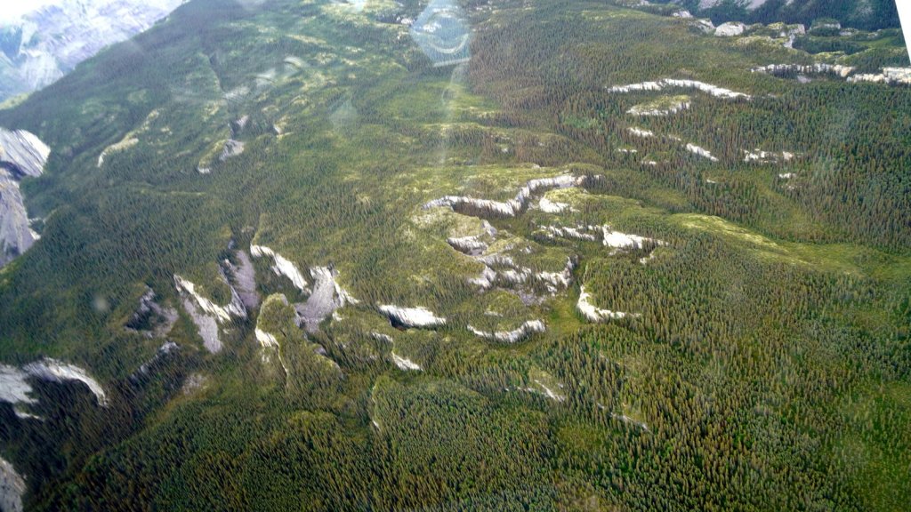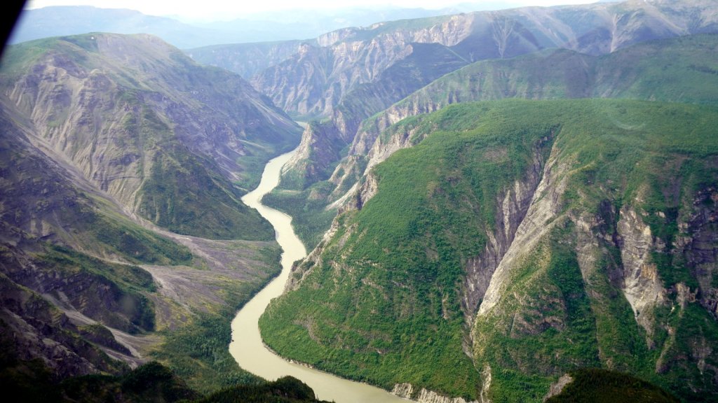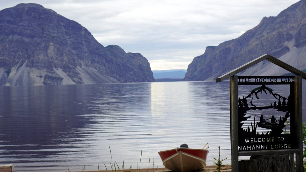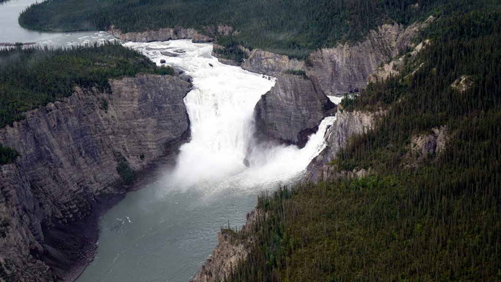 The flight on Sunday was delayed till 14:00 hrs. We shared the small floatplane with a German couple who are doing a 6 months Canada trip followed by a 6 months USA trip. They have one of these large converted trucks. Rudy sat in the front of the plane and had an excellent view. The first 30 – 45 min was over the forested lowlands towards the mountains. In the landscape you could still see the seismic lines which were made in the sixties. For the rest it is forest with large open patches and lakes. We slowly climbed up to 5000 ft to fly over and into the mountain range, which make up the National Park. The park is one of the world’s first Unesco Natural heritage sites (est. 1976). It is well known for its 10 – 30 day canoe/rafting trips out to the Liard river. The slots are booked well in advance so no chance for us to join one, even if we wanted to. The beautiful flight in and out and the 2 landings, one at the 94 m high Virginia falls and the other at a set of cabins on the Little Doctor lake, were however impressive enough. The pictures will tell the story.