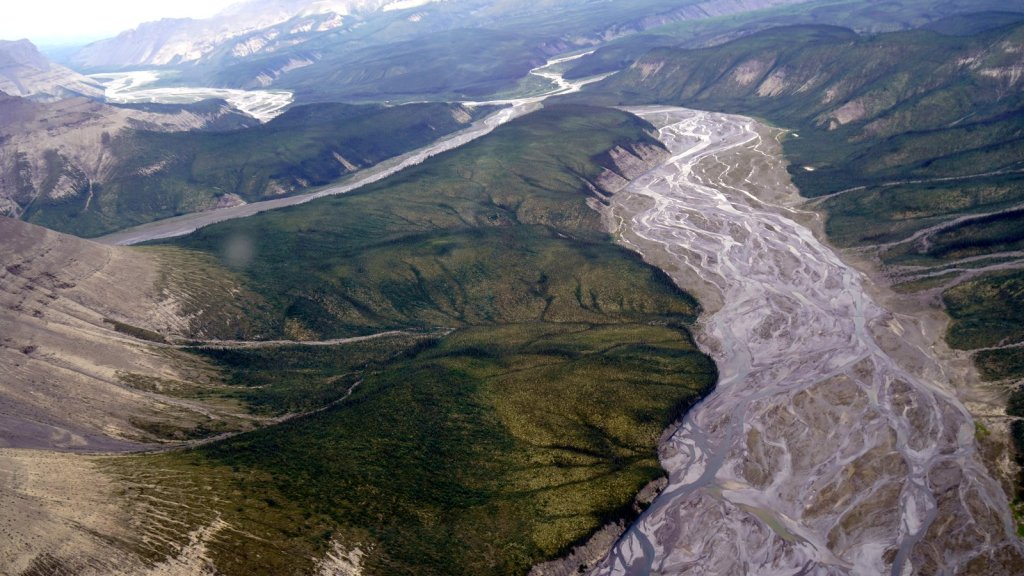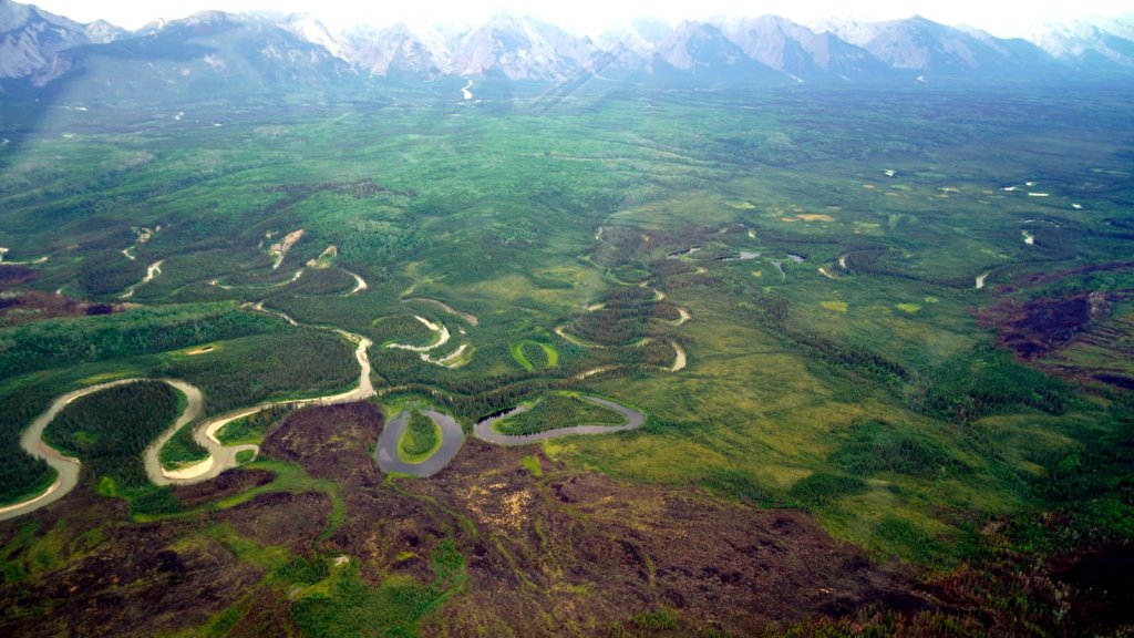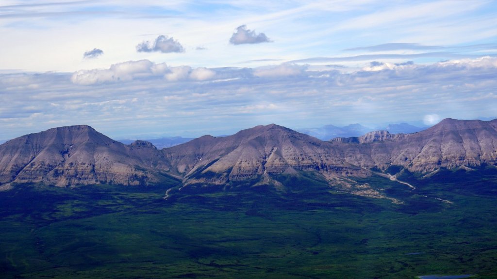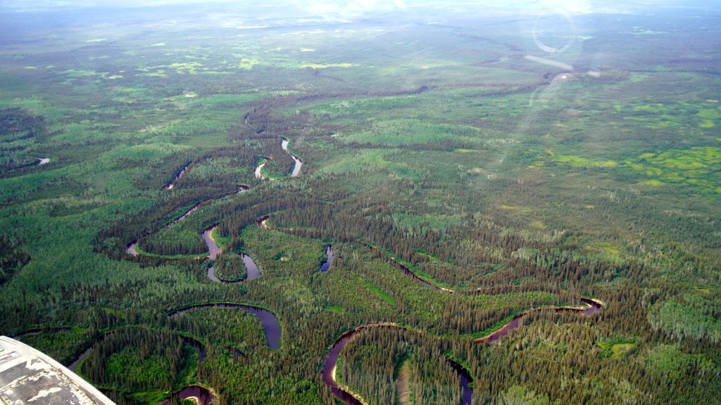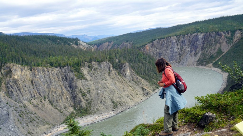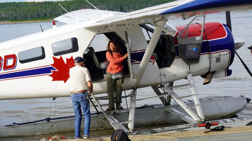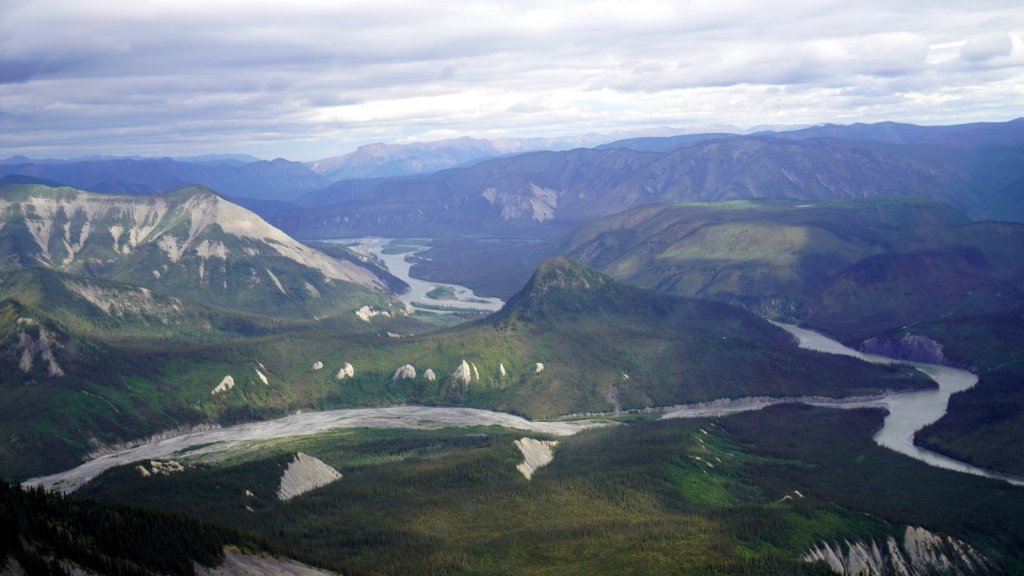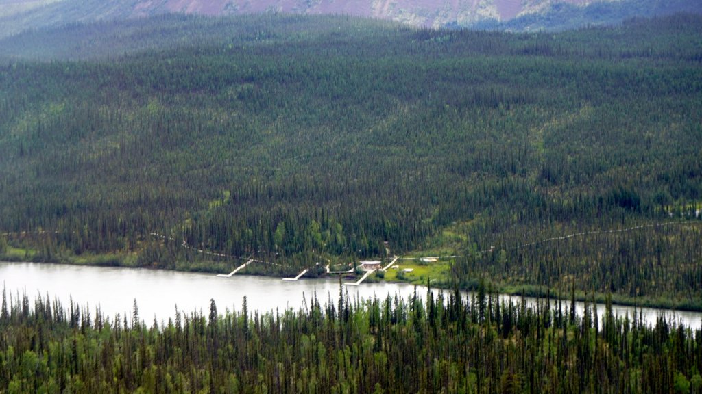 The flight on Sunday was delayed till 14:00 hrs. We shared the small floatplane with a German couple who are doing a 6 months Canada trip followed by a 6 months USA trip. They have one of these large converted trucks. Rudy sat in the front of the plane and had an excellent view. The first 30 – 45 min was over the forested lowlands towards the mountains. In the landscape you could still see the seismic lines which were made in the sixties. For the rest it is forest with large open patches and lakes. We slowly climbed up to 5000 ft to fly over and into the mountain range, which make up the National Park. The park is one of the world’s first Unesco Natural heritage sites (est. 1976). It is well known for its 10 – 30 day canoe/rafting trips out to the Liard river. The slots are booked well in advance so no chance for us to join one, even if we wanted to. The beautiful flight in and out and the 2 landings, one at the 94 m high Virginia falls and the other at a set of cabins on the Little Doctor lake, were however impressive enough. The pictures will tell the story.