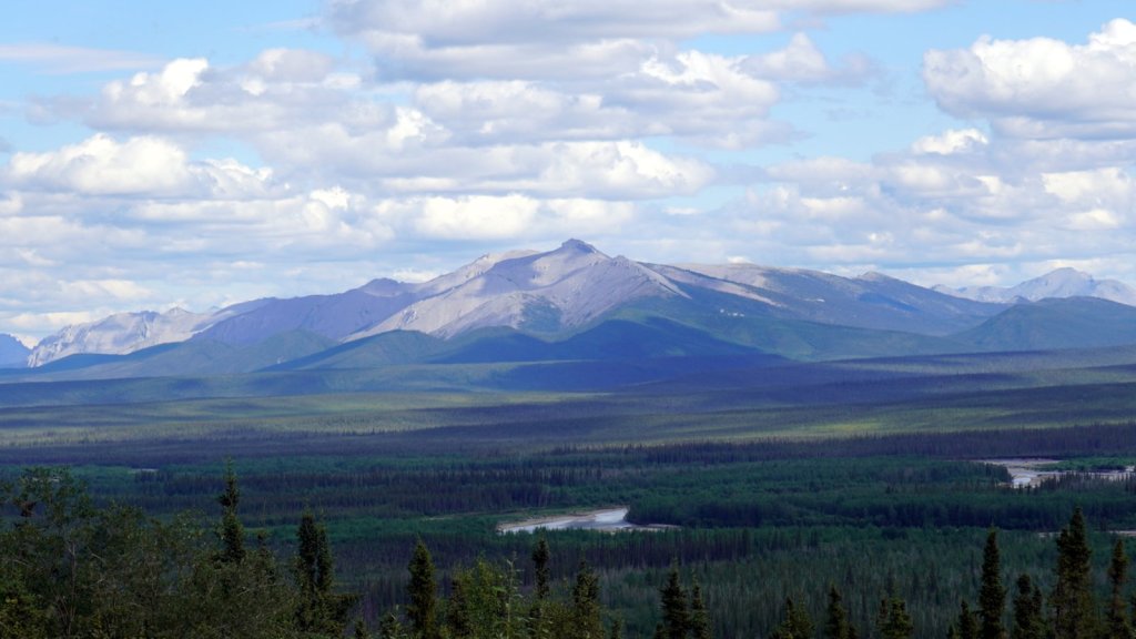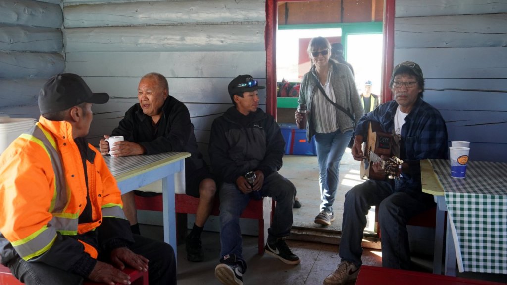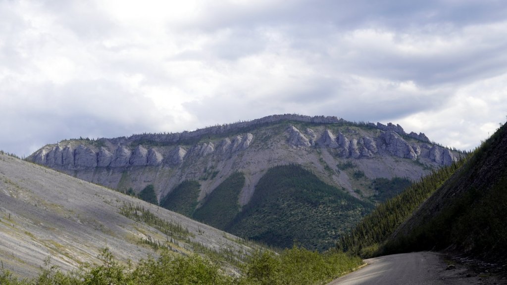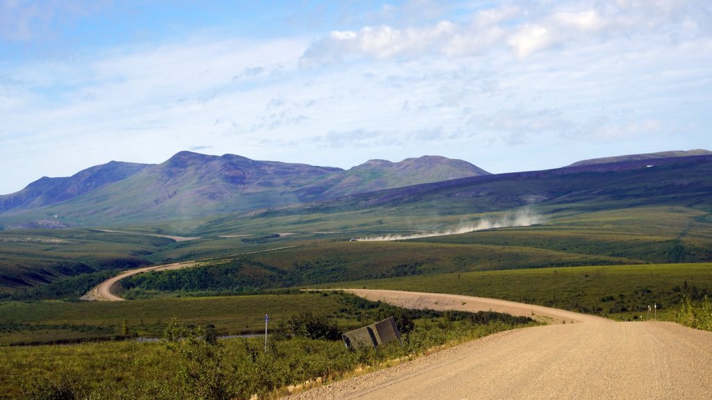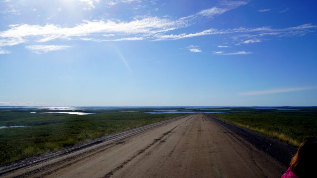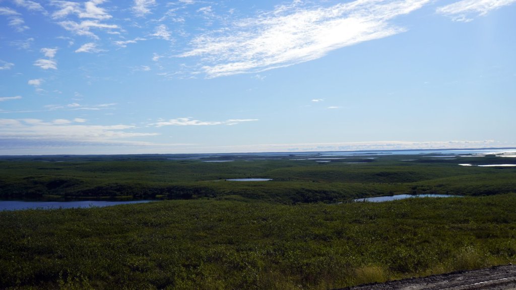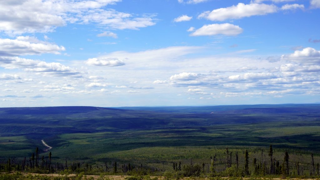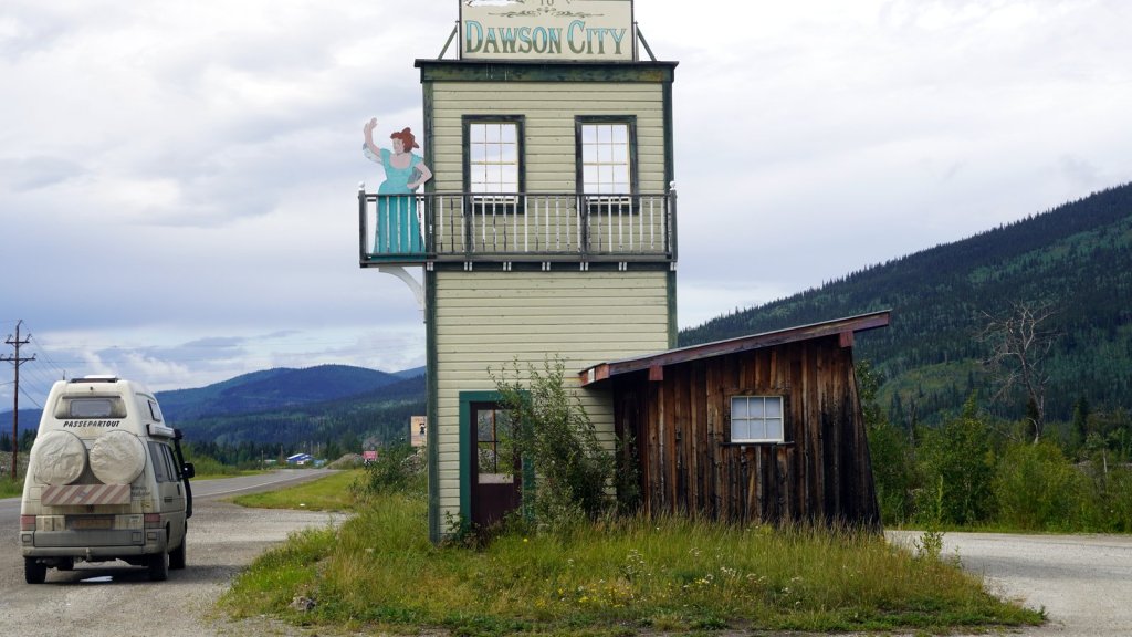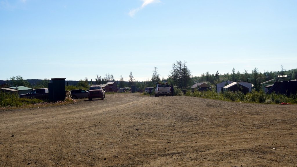 It was a beautiful sunny day when we left Tuktoyaktuk, The road was dry and therefore not slippery. We made the trip out of the Dempster highway in 2 overnight stops. At several point the views are much better then on the way up, so we stopped for lunch and took some of the scenery pictures again. In Inuvik we stopped again at the visitors centre for our walking in the Arctic Ocean certificate. Then we drove on to a territorial campsite just before the second ferry crossing over the Peel river at Fort McPherson. A lovely site but they had a generator going on for many hours for the electricity in the bathroom (there were only 4 campsites in use). We stopped there primarily for the hot shower. The next day we dropped in at Midway lake where there was a 3 days native festival ongoing. We were too early for the performances but in the canteen there was a lively atmosphere and one man was playing a guitar and singing away. It gave us a bit of the festival feeling. Most people were just slowly waking up after a late night of dancing/partying. People came from all over the Yukon, Northwest Territories and even Alaska. It was a gathering of the Gwich’in people. This is an annual event where they all meet up. Most live in very remote areas and have to travel for days by boat and road to get to the festival grounds. Families have permanent huts on the grounds which they used once a year. We drove on further past the Eagle Plains and slowly drove up again to over 1000 m. Unfortunately it stated to rain heavily when we arrived at the planned camp site in-between the mountains. So we decided that it was better to drive on and see if the rains would stop. It did (for a while). We pressed on to our favourite campsite from on our way up (2 days ago). This time we were there alone and had the prime spot overlooking the mountains (if there was no fog). With the washing bin, we fetched water from the river and cleaned all the dirt from the camper. Because it started to rain again the next day, before the end of the Dempster hwy, the camper was once more covered with mud. In Dawson City we found a garage with a high pressure hose and cleaned it again.