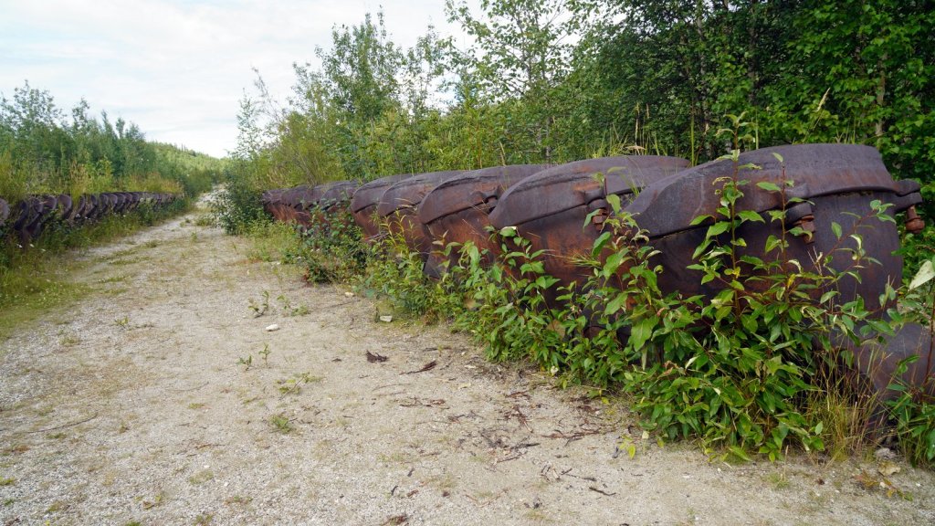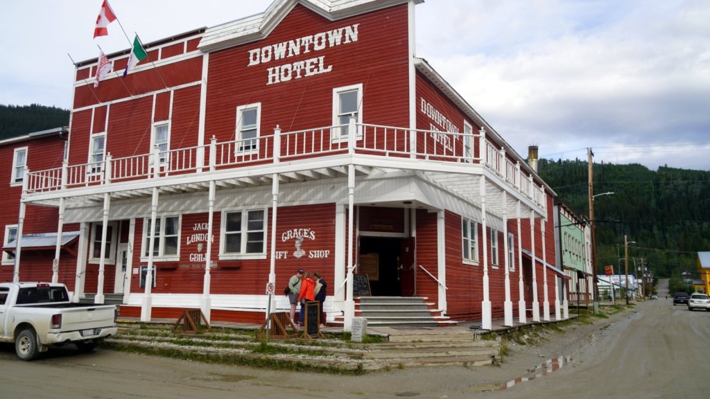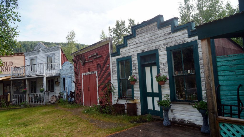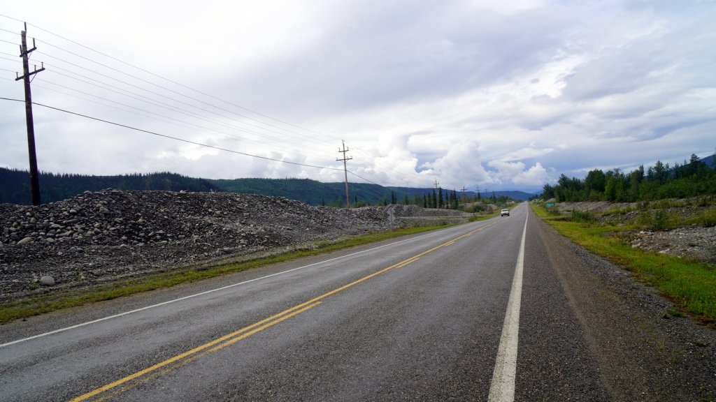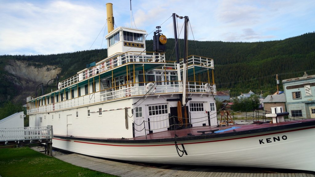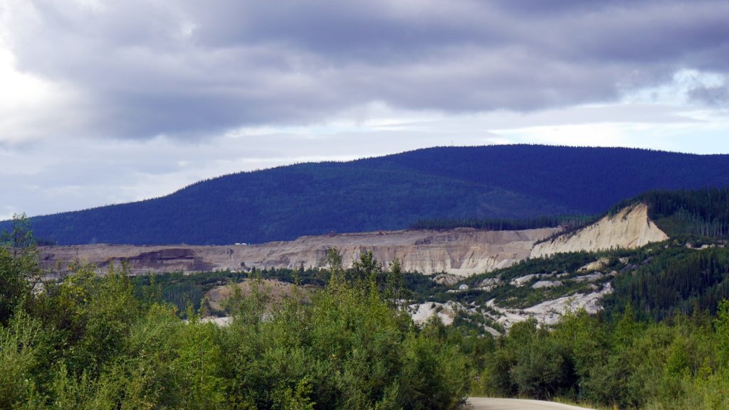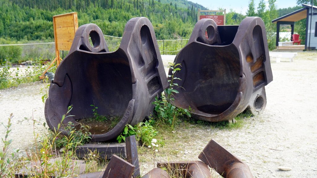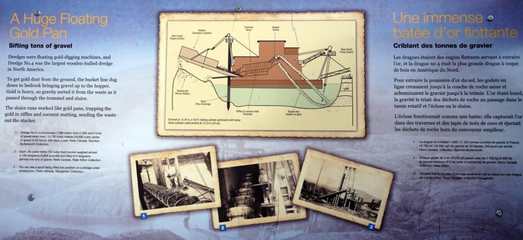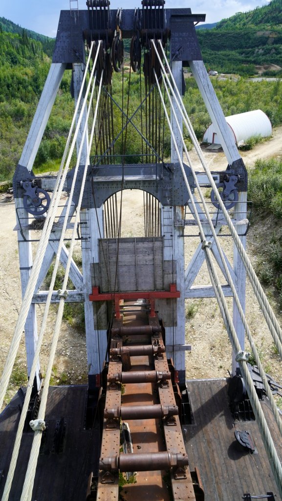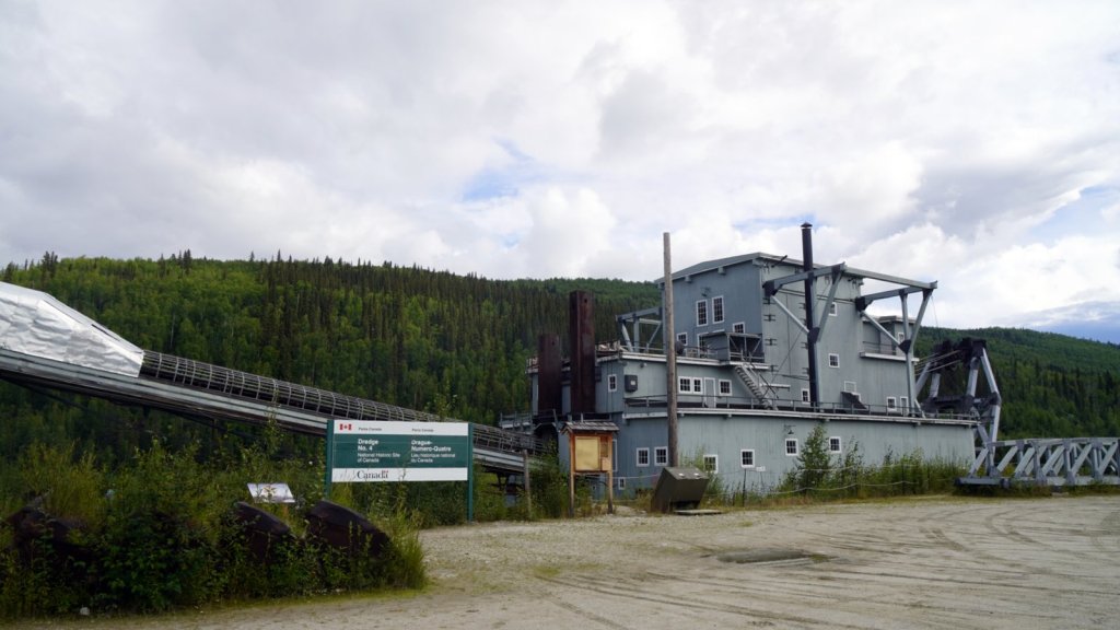 Dawson City is the traditional gold mining town. It has always been a town of prospectors and in 1876 had 1500 inhabitants when the big Klondike gold find was made. 2 years later 30,000 people arrived to stake their claim and hope to find gold. Most claims were already made by the locals who lived here. Also the easy gold was running out so the most people left and the town dwindled down to 975 people in 1921. It stayed at about that number till 1996 when the roads were improved and tourists started to come. The town is a lot more interesting then Skagway. There are no cruise ships arriving so the people you meet made a real effort to come here. Also there are a lot less shops selling jewellery and other rich tourist stuff. Most of the building are still from the gold rush period. They have been restored and it is nice to wander the streets walking on a board walk. The streets themselves are not paved and in the rainy weather we have now can be very muddy. When the small time gold miners left, the bigger enterprises took over. They built large dredges which floated in a pond. The first was introduced in 1905 and continued till 1959. By digging away on one side of the pond and dumping the tailings on the other side this large machine slowly eats it way up the valleys. The gold was gravity separated from the gravel by sieve and sluice boxes. The enormous machine was only operated in 3 shifts of 4 people. However it took a large workforce to clear the land ahead of the machine. The frozen ground had to also be thawed by steam injection before it could be dredged. We visited the restored dredge 4 and were giving a tour by park Canada’s very informative/knowledgeable staff. There is still mining going on in the different valleys around town. But is not at a large scale. Because of this, the whole area around this town is full of tailing left behind. It looks more like a moon landscape.