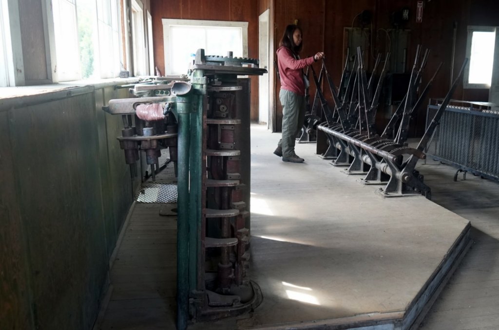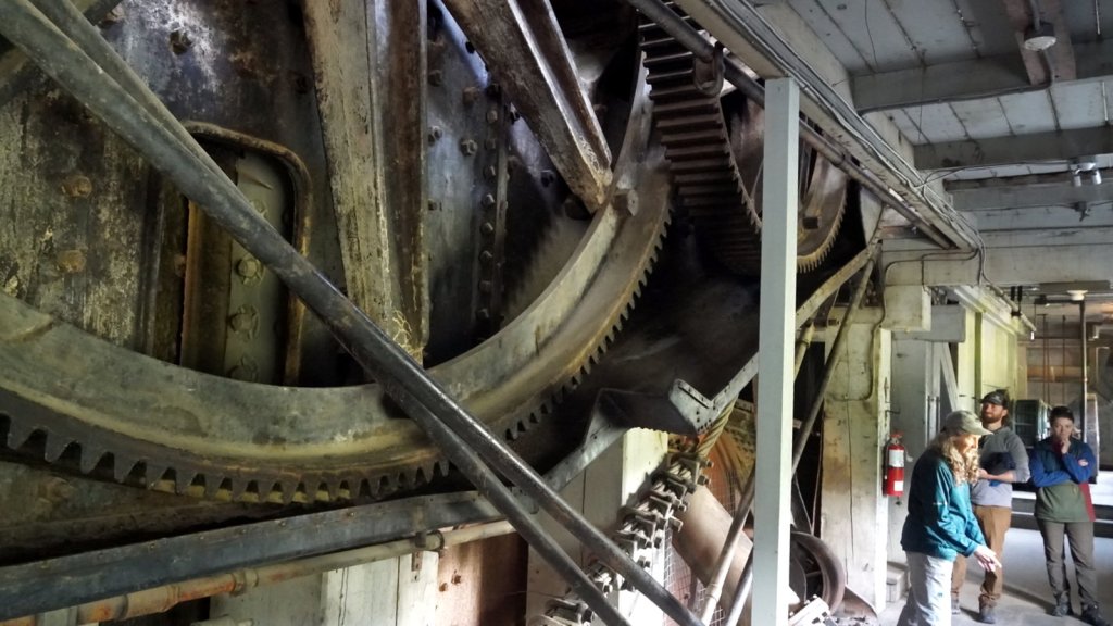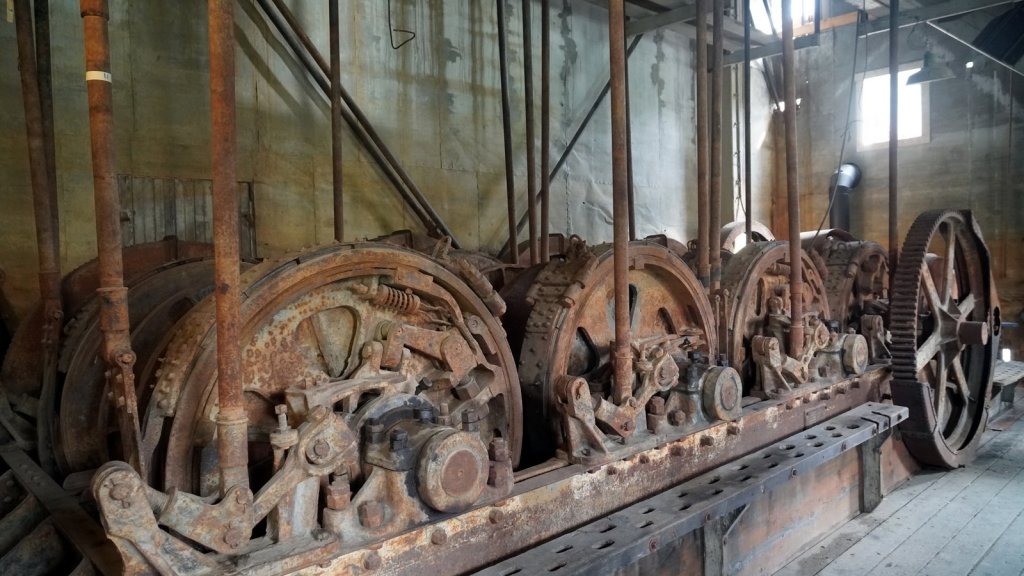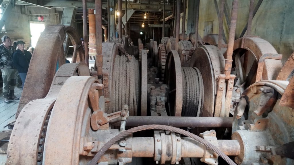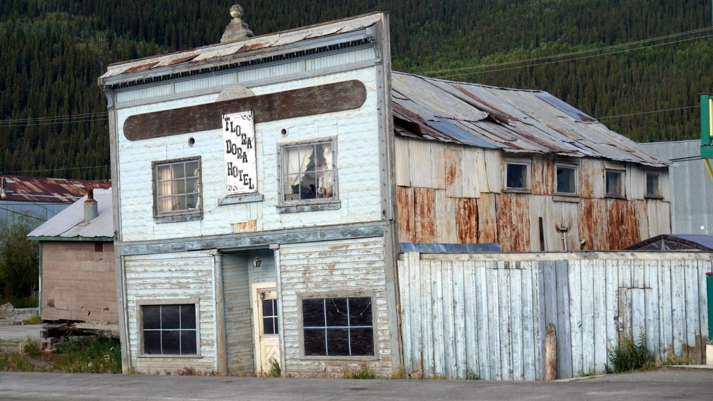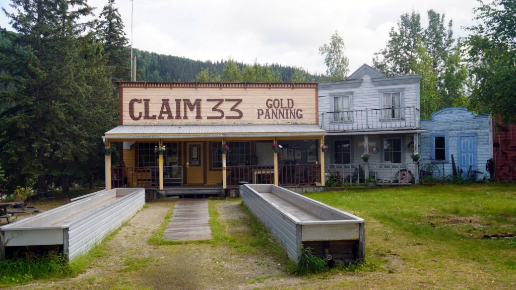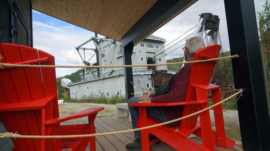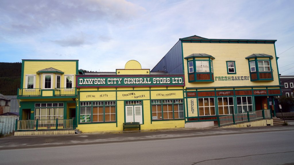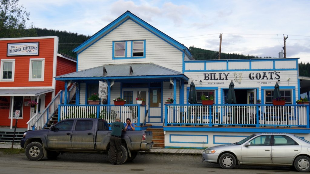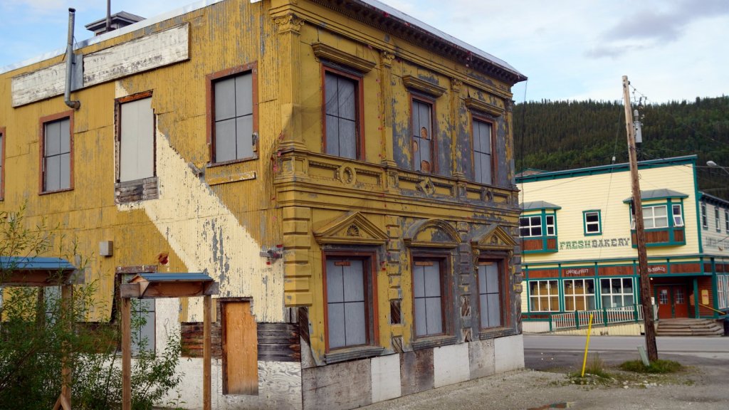 Dawson City is the traditional gold mining town. It has always been a town of prospectors and in 1876 had 1500 inhabitants when the big Klondike gold find was made. 2 years later 30,000 people arrived to stake their claim and hope to find gold. Most claims were already made by the locals who lived here. Also the easy gold was running out so the most people left and the town dwindled down to 975 people in 1921. It stayed at about that number till 1996 when the roads were improved and tourists started to come. The town is a lot more interesting then Skagway. There are no cruise ships arriving so the people you meet made a real effort to come here. Also there are a lot less shops selling jewellery and other rich tourist stuff. Most of the building are still from the gold rush period. They have been restored and it is nice to wander the streets walking on a board walk. The streets themselves are not paved and in the rainy weather we have now can be very muddy. When the small time gold miners left, the bigger enterprises took over. They built large dredges which floated in a pond. The first was introduced in 1905 and continued till 1959. By digging away on one side of the pond and dumping the tailings on the other side this large machine slowly eats it way up the valleys. The gold was gravity separated from the gravel by sieve and sluice boxes. The enormous machine was only operated in 3 shifts of 4 people. However it took a large workforce to clear the land ahead of the machine. The frozen ground had to also be thawed by steam injection before it could be dredged. We visited the restored dredge 4 and were giving a tour by park Canada’s very informative/knowledgeable staff. There is still mining going on in the different valleys around town. But is not at a large scale. Because of this, the whole area around this town is full of tailing left behind. It looks more like a moon landscape.