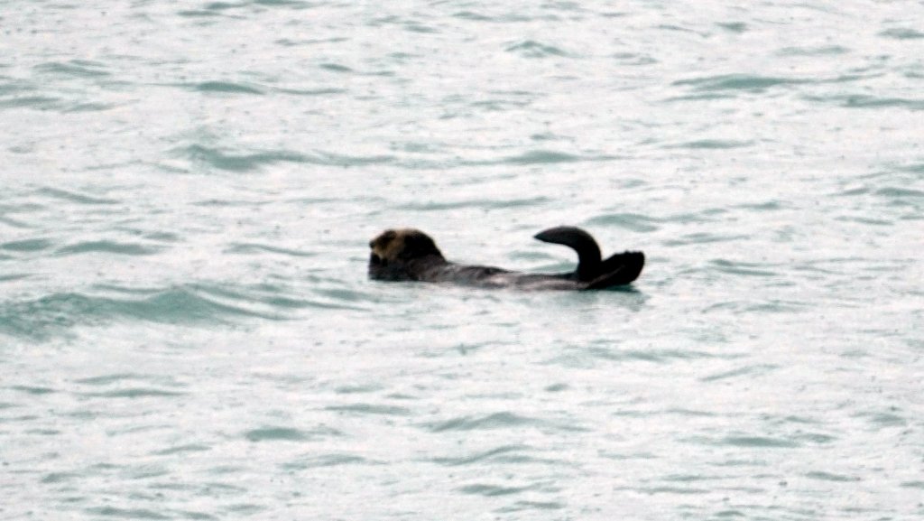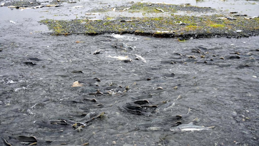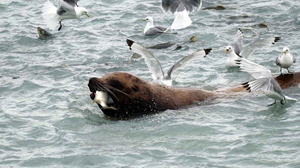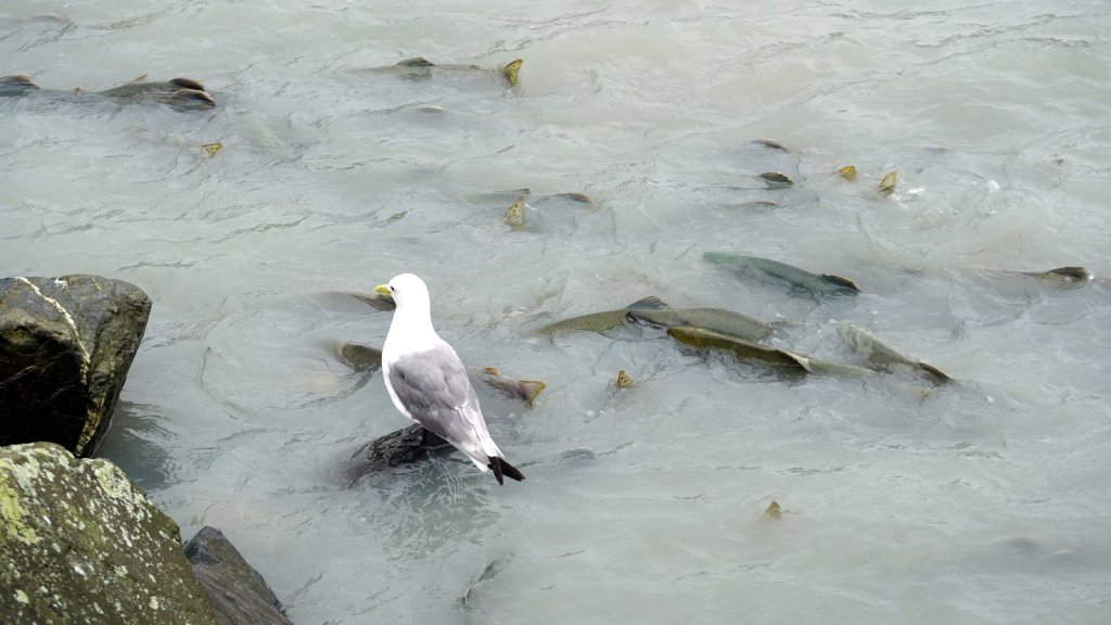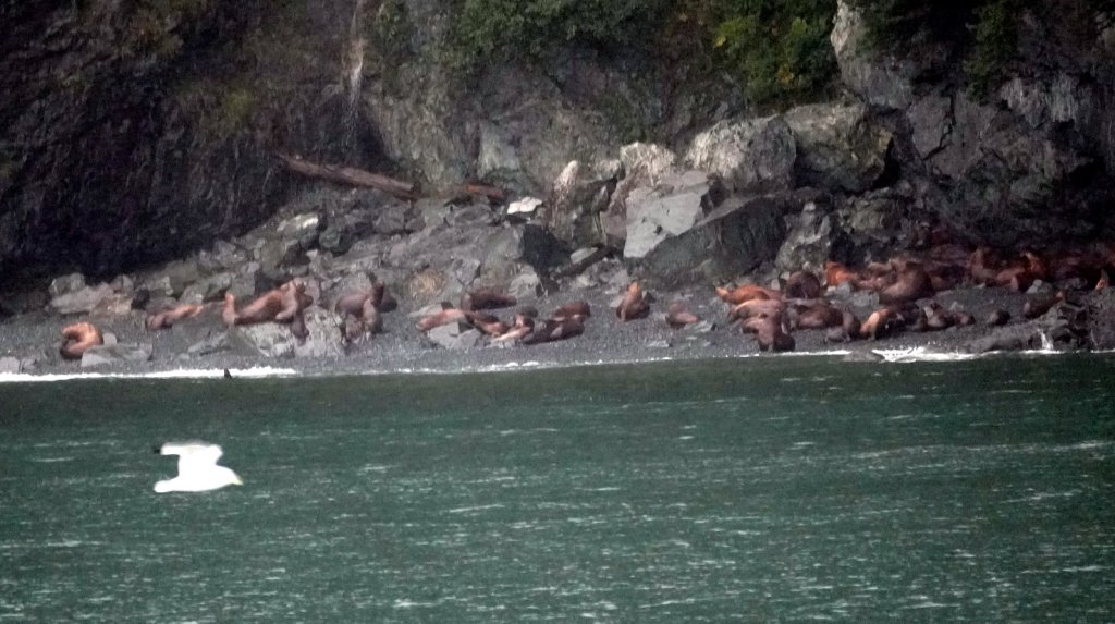 This will be our last night in Alaska. We spent 21 days driving most of the roads in this “Last Frontier” state. We drove from Skagway/Haines all the way to Prudhoe bay through the Brooks range, toured (partly) the Denali area in the Alaskan Range and explored the complete Kenai peninsula. We left the peninsula by ferry to Valdez. This is an oil town. The trans Alaskan pipeline arrives here and large oil tankers are loaded. It was raining severely and the inlet was fogged up so we could not see any tankers nor the pipeline coming over the mountains. We did finally see lots of Salmon. Unfortunately not the eating kind. When driving to our campsite in the rainy mist at sunset, located just out of town next to a fast flowing river, the road crossed a stream full of salmon trying to swim upriver over the pebbles in the stream. We did not dare to drive on because we would defiantly have crushed some fish. We turned around and found another way to our camping spot. Also there was a stream full of Chum salmon. Sometimes it looked like they were biting each other in their attempt to get over the rocks. The sea gulls had a party. They were everywhere where the exhausted fish would gave up swimming upstream and just died from exhaustion. The area was covered with many fish carcases and the smell of rotten fish was not pleasant. The next morning we visited a salmon ladder attached to a fish nursery. Also there were thousands of fish swimming up the stream. Some into the ladder which brought them to the fish farm. There, the fish is stunned by electricity and cut open to remove the eggs or squeezed to get the milky sperm. In a hatchery the eggs are fertilised and after incubation the small fish are grown up and later released back to the sea. The dead parents are used for animal food. This is no loss because the fish normally die anyway after laying and fertilising the eggs in the river stream. We also saw one sea lion swimming in the river, enjoying his fresh meal.