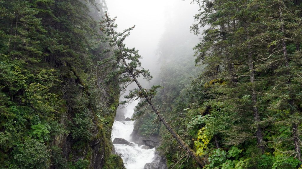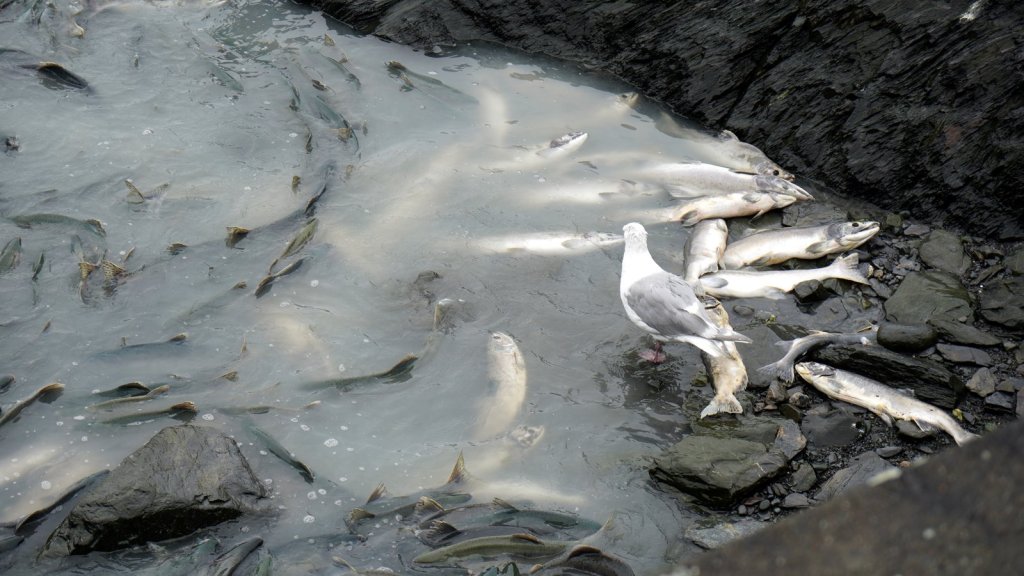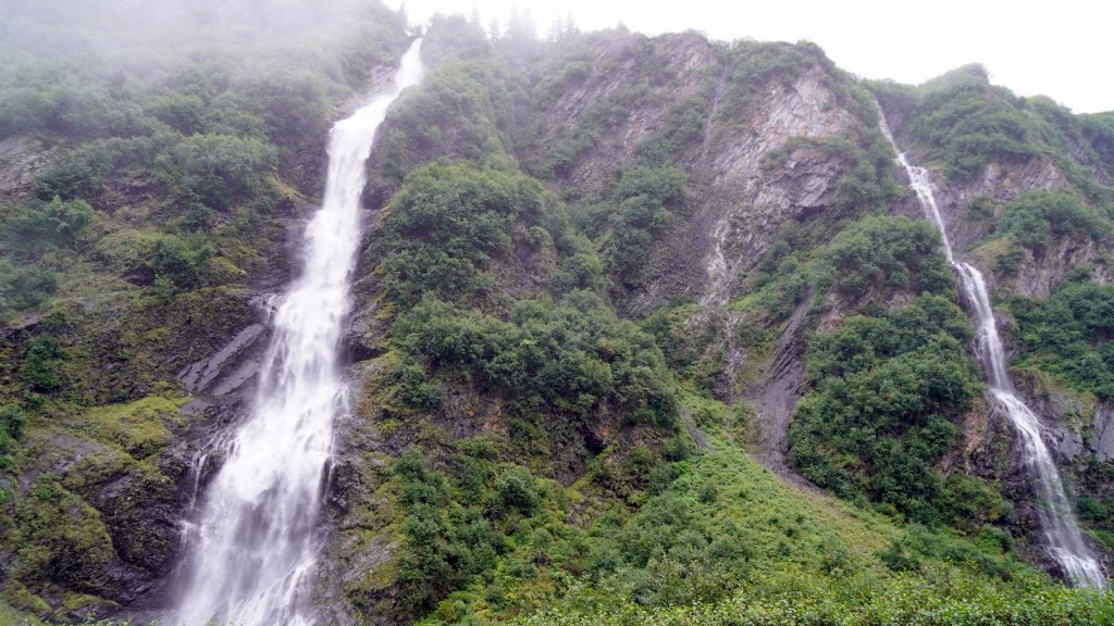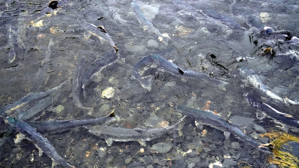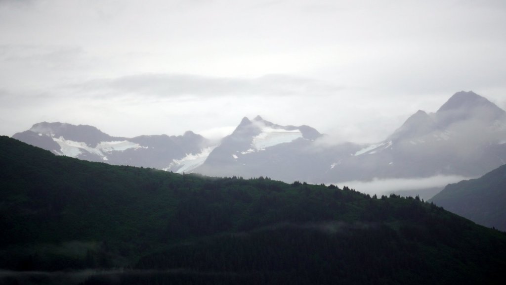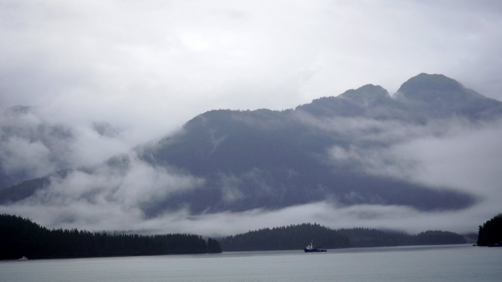 This will be our last night in Alaska. We spent 21 days driving most of the roads in this “Last Frontier” state. We drove from Skagway/Haines all the way to Prudhoe bay through the Brooks range, toured (partly) the Denali area in the Alaskan Range and explored the complete Kenai peninsula. We left the peninsula by ferry to Valdez. This is an oil town. The trans Alaskan pipeline arrives here and large oil tankers are loaded. It was raining severely and the inlet was fogged up so we could not see any tankers nor the pipeline coming over the mountains. We did finally see lots of Salmon. Unfortunately not the eating kind. When driving to our campsite in the rainy mist at sunset, located just out of town next to a fast flowing river, the road crossed a stream full of salmon trying to swim upriver over the pebbles in the stream. We did not dare to drive on because we would defiantly have crushed some fish. We turned around and found another way to our camping spot. Also there was a stream full of Chum salmon. Sometimes it looked like they were biting each other in their attempt to get over the rocks. The sea gulls had a party. They were everywhere where the exhausted fish would gave up swimming upstream and just died from exhaustion. The area was covered with many fish carcases and the smell of rotten fish was not pleasant. The next morning we visited a salmon ladder attached to a fish nursery. Also there were thousands of fish swimming up the stream. Some into the ladder which brought them to the fish farm. There, the fish is stunned by electricity and cut open to remove the eggs or squeezed to get the milky sperm. In a hatchery the eggs are fertilised and after incubation the small fish are grown up and later released back to the sea. The dead parents are used for animal food. This is no loss because the fish normally die anyway after laying and fertilising the eggs in the river stream. We also saw one sea lion swimming in the river, enjoying his fresh meal.