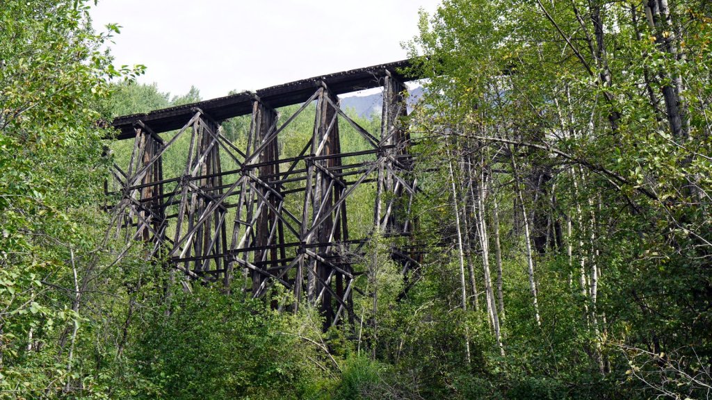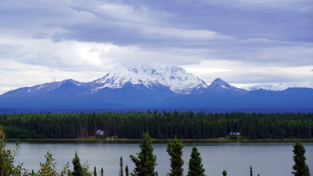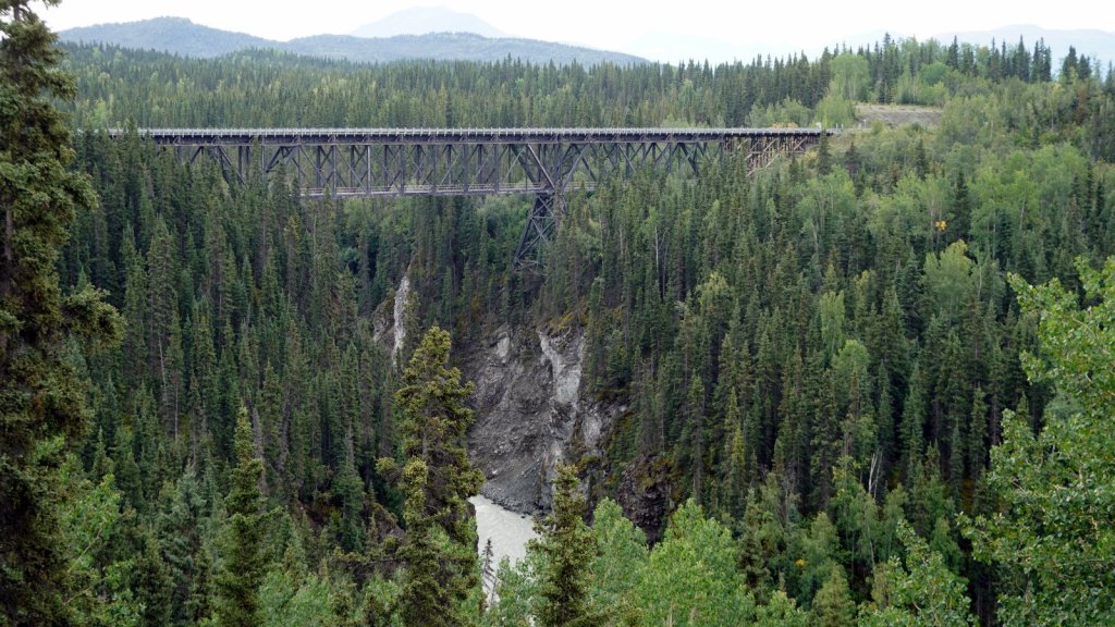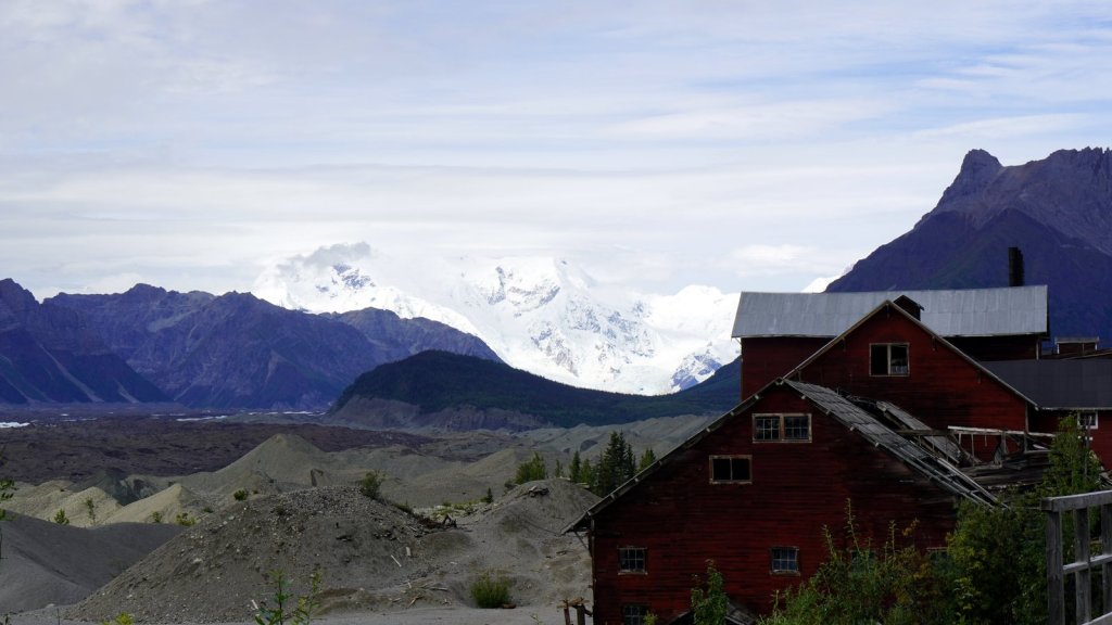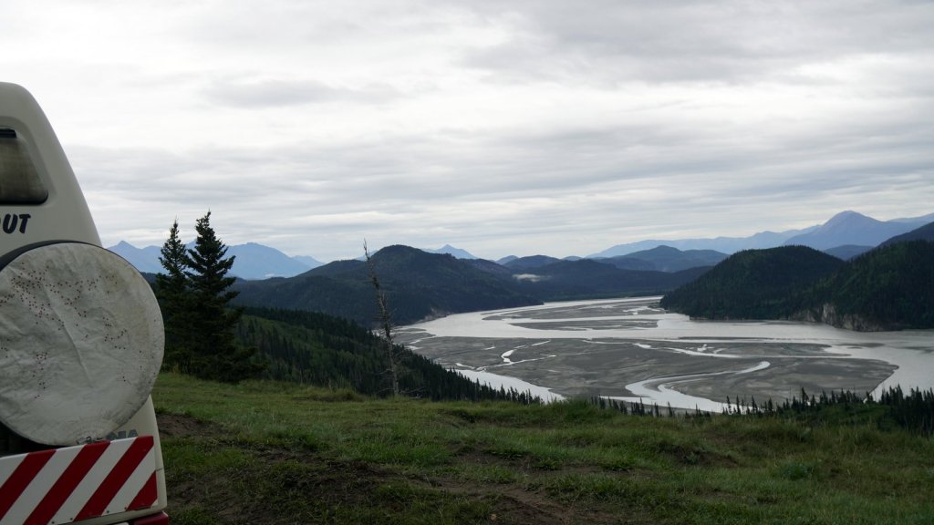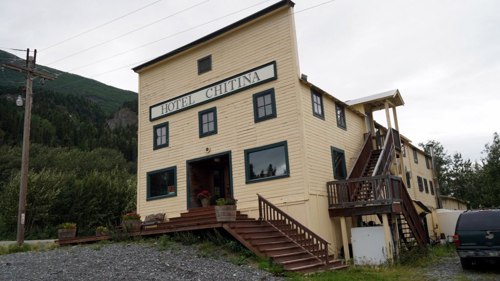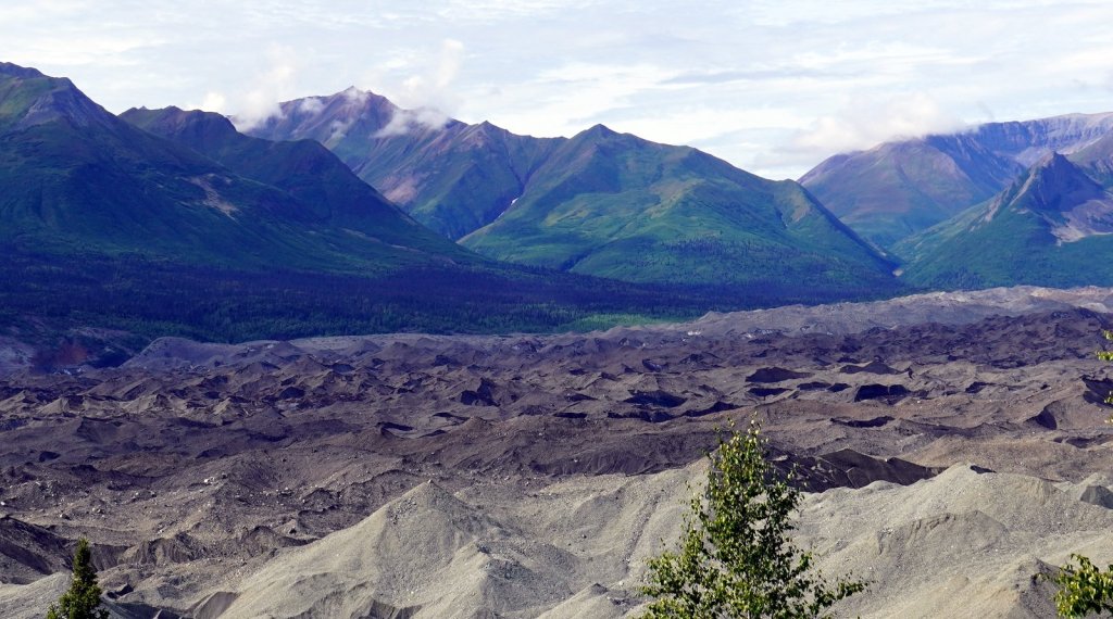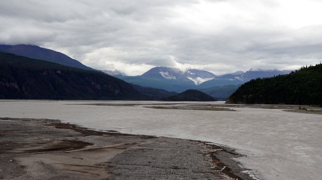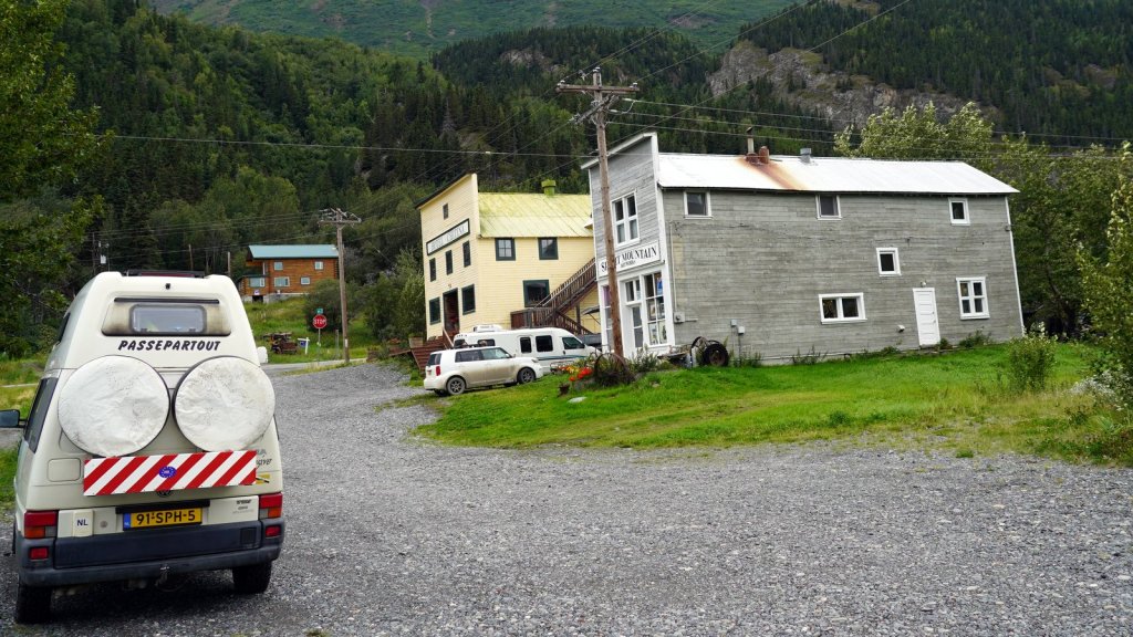 We made our way up out of the sound and over the mountains. Finally it stopped raining on the other side of the pass. From several people we heard that the Wrangell range near McCarthy is worth a visit. Moreover there is a pre 1938 Coppermine Kennicott nearby. It was a long drive following the Copper river and later the Chitina river though valleys in between the mountains. The first night we had a magnificent view down to braided and fast flowing Chitina river. The drive was over the rail bed of the old train line which the mine company had constructed, to ship the ore out to Cordova on the Gulf of Alaska, some 190 km away. Beside a narrow cut though a mountain outside Chitina and the remains of some high wooden bridges, you did not realise you are driving over an old rail line. The train bed has been improved to facilitate visitors, as a gateway to the Wrangell-St. Elias National park. Many people walked up to the artistic town of McCarthy or take the provided free shuttle bus. (You need to leave your vehicle by the foot bridge as no one is allowed to drive further from the parking lot). And then take the next free shuttle bus up to the mine. From there you can walk to one of the glaciers coming down the 4982 m high Mnt. Blackburn. You can either walk there yourself or take a one day guided tour which take you to the glacier and with provided crampon walk on it. We did not do the walk to the glacier but instead spent our time exploring the remains of the extraction plant of the Kennicott mine. Much of the red painted wooden structure is still standing since it was abandoned in 1938 when the ore ran out. Several buildings have been cannibalised over the years and much of the equipment has been removed. It is now a historical site and what is left is being preserved. When discovered around 1905 the ore was one of the riches ever found. The ore was however high up on the mountain where the volcanic green stone came in contact with the limestone above it. You can clearly see this from a distance. Three mines were developed into the mountain side just under the top with many tunnels to bring the ore out. The whole area was mostly covered with snow and the mill was actually situated at the side of the glacier. After an interesting afternoon exploring the ruins of the mill we drove out and camped at a small pullout next to a lake. The following day we drove all the way out and north following the Copper river. The banks of the river is sometimes 100 m higher than the river with many great views of the Wrangell range. Before arriving, we left the Copper river and crossed over the low end of the Alaska range back to Tok on the Alaskan Highway. We had already visited this town when coming over the mountains from Dawson City, Canada. We had a much needed shower and drove off to an uninteresting camp spot on an abandoned section of the old Alaskan Highway some 24 km outside town.