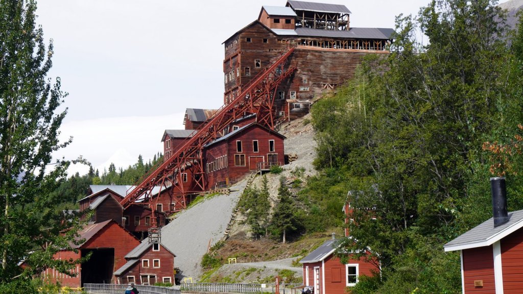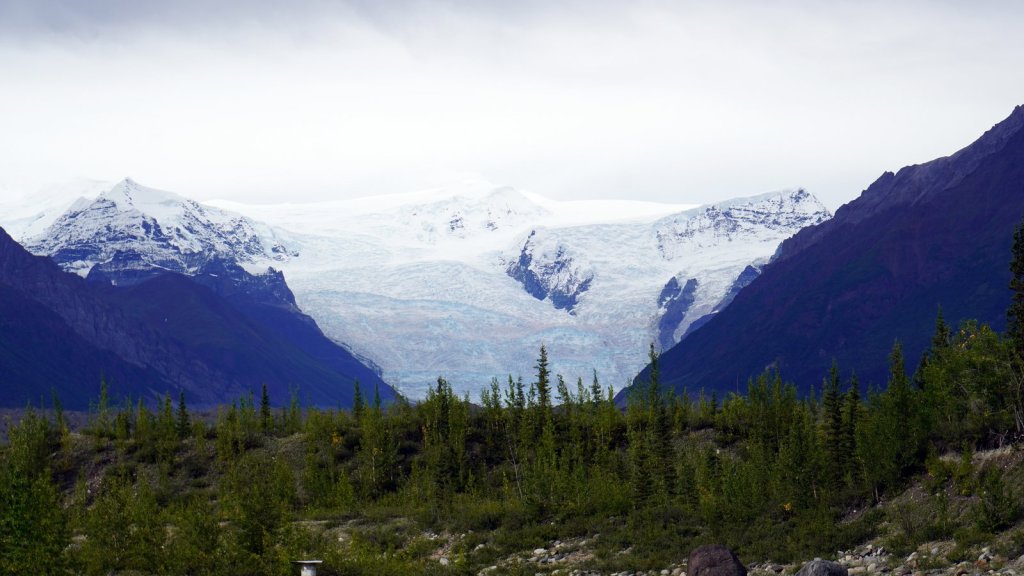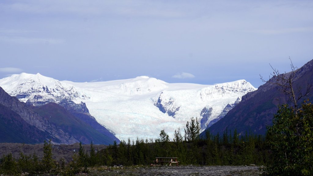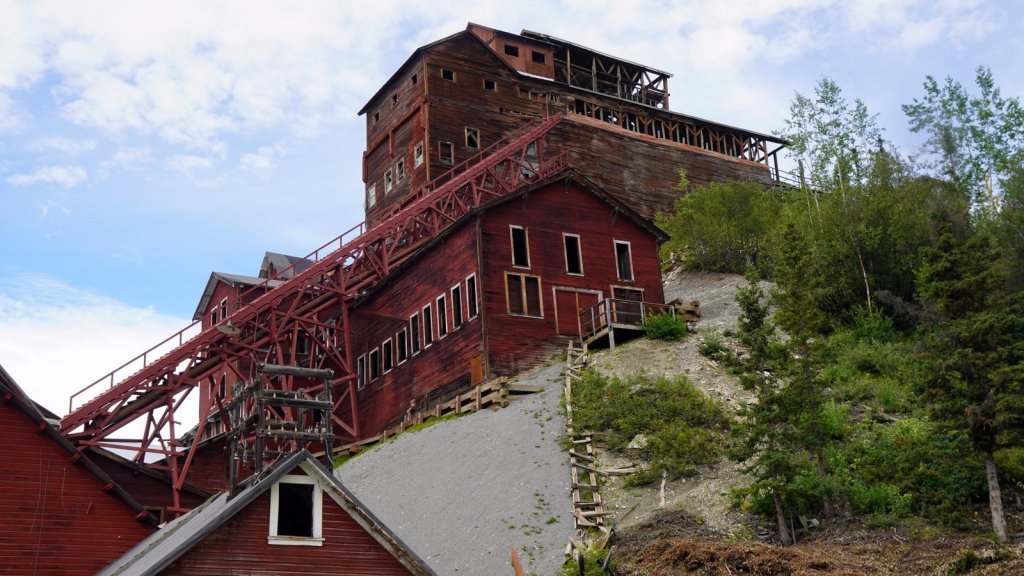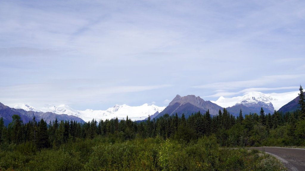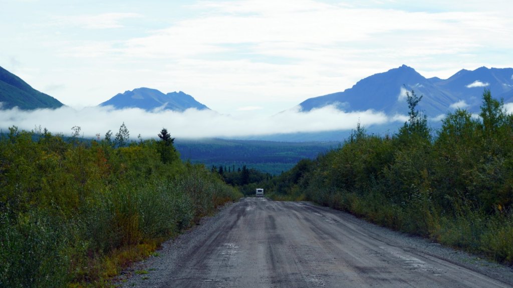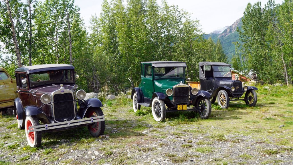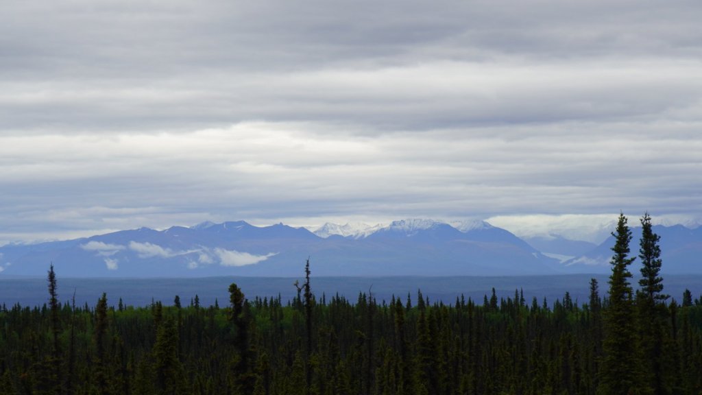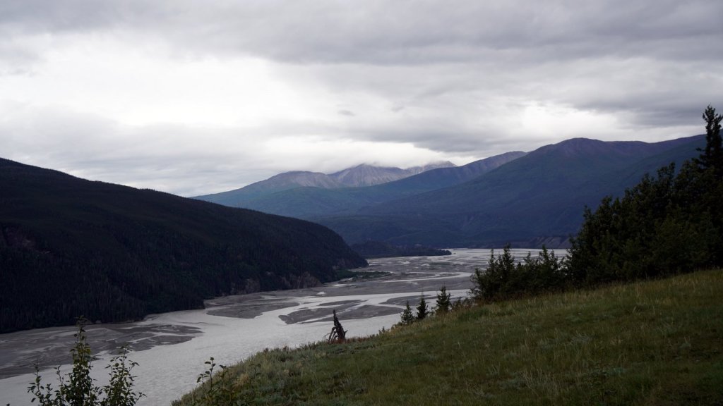 We made our way up out of the sound and over the mountains. Finally it stopped raining on the other side of the pass. From several people we heard that the Wrangell range near McCarthy is worth a visit. Moreover there is a pre 1938 Coppermine Kennicott nearby. It was a long drive following the Copper river and later the Chitina river though valleys in between the mountains. The first night we had a magnificent view down to braided and fast flowing Chitina river. The drive was over the rail bed of the old train line which the mine company had constructed, to ship the ore out to Cordova on the Gulf of Alaska, some 190 km away. Beside a narrow cut though a mountain outside Chitina and the remains of some high wooden bridges, you did not realise you are driving over an old rail line. The train bed has been improved to facilitate visitors, as a gateway to the Wrangell-St. Elias National park. Many people walked up to the artistic town of McCarthy or take the provided free shuttle bus. (You need to leave your vehicle by the foot bridge as no one is allowed to drive further from the parking lot). And then take the next free shuttle bus up to the mine. From there you can walk to one of the glaciers coming down the 4982 m high Mnt. Blackburn. You can either walk there yourself or take a one day guided tour which take you to the glacier and with provided crampon walk on it. We did not do the walk to the glacier but instead spent our time exploring the remains of the extraction plant of the Kennicott mine. Much of the red painted wooden structure is still standing since it was abandoned in 1938 when the ore ran out. Several buildings have been cannibalised over the years and much of the equipment has been removed. It is now a historical site and what is left is being preserved. When discovered around 1905 the ore was one of the riches ever found. The ore was however high up on the mountain where the volcanic green stone came in contact with the limestone above it. You can clearly see this from a distance. Three mines were developed into the mountain side just under the top with many tunnels to bring the ore out. The whole area was mostly covered with snow and the mill was actually situated at the side of the glacier. After an interesting afternoon exploring the ruins of the mill we drove out and camped at a small pullout next to a lake. The following day we drove all the way out and north following the Copper river. The banks of the river is sometimes 100 m higher than the river with many great views of the Wrangell range. Before arriving, we left the Copper river and crossed over the low end of the Alaska range back to Tok on the Alaskan Highway. We had already visited this town when coming over the mountains from Dawson City, Canada. We had a much needed shower and drove off to an uninteresting camp spot on an abandoned section of the old Alaskan Highway some 24 km outside town.